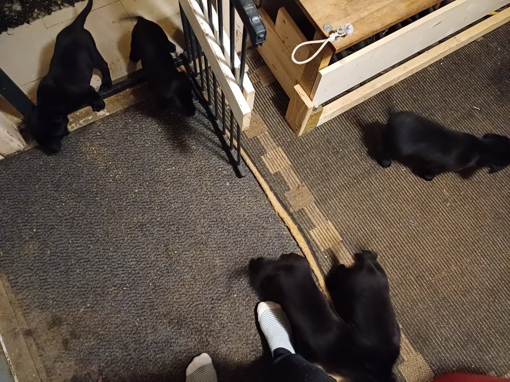Der sker mere og mere i hvalpekassen hver dag, hvalpene bliver mere opmærksom på hvad der sker omkring dem. De er helt klar over når de store hunde får mad, så er de også klar og giver lyd, så vi ved at de har hørt der er mad. De bliver mere til hunde der næsten spiser almindeligt hvalpefoder også får de stadig mælk ved Nate.I rummet prøver kræfter med hinanden, så der kommer nogle gange nogle høje hyl. De er begyndt at bruge "hunde WCét" til det store og nogle er dem løber ind på ”hunde wcét” når de er udenfor rummet. Når de er i "hvalpebørnehaven" er de rigtig begyndt at gå på opdagelse og prøve mere.