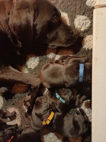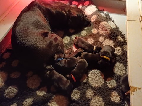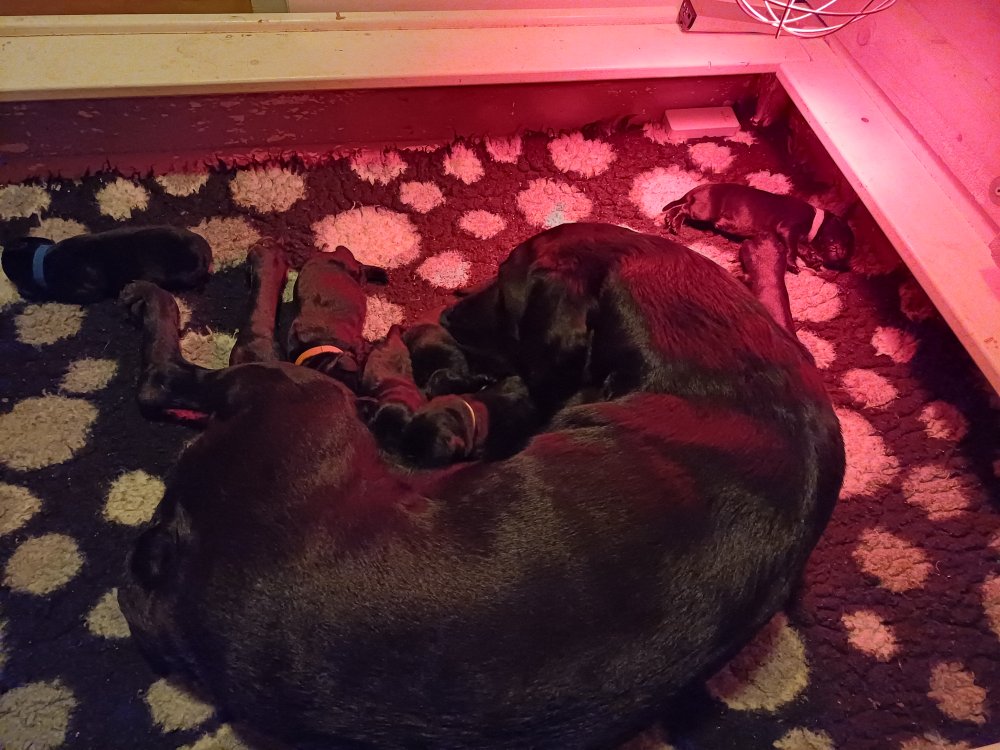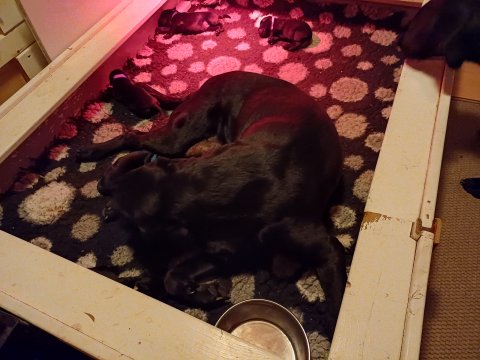 Nata og 8 hvalpe 1 uge gammel, vi har fået lidt mere plads.