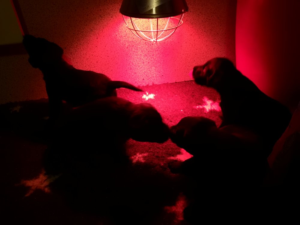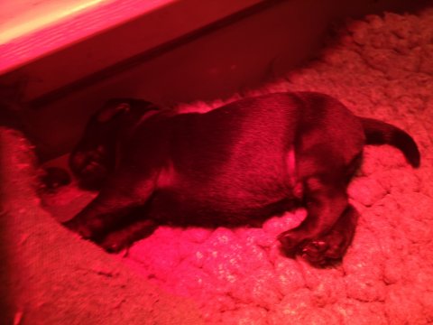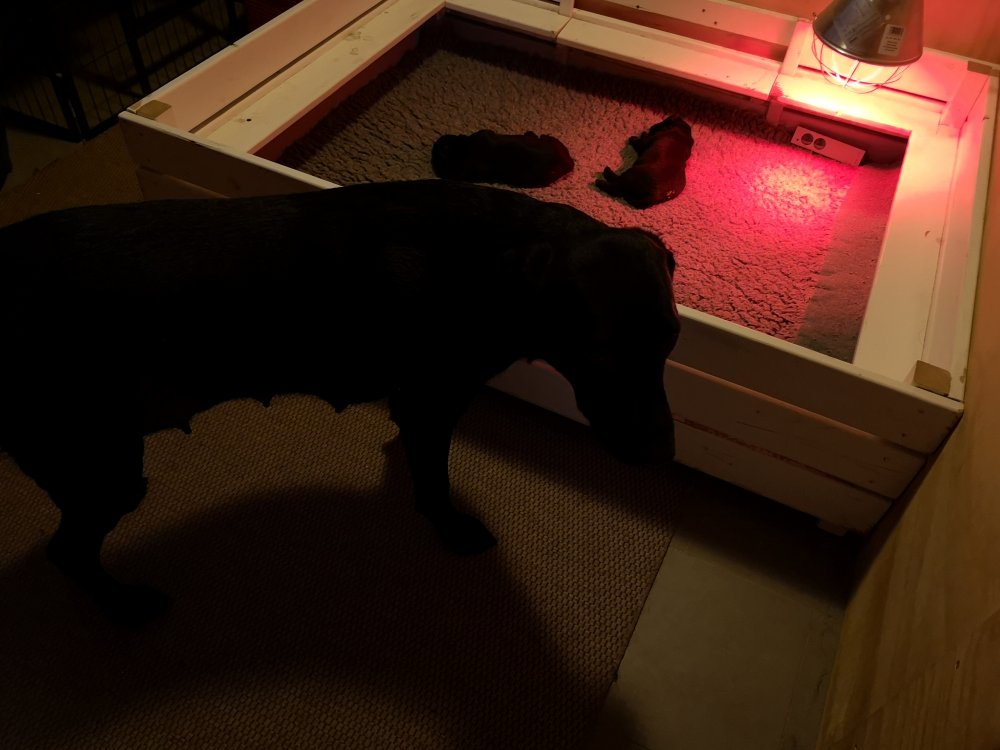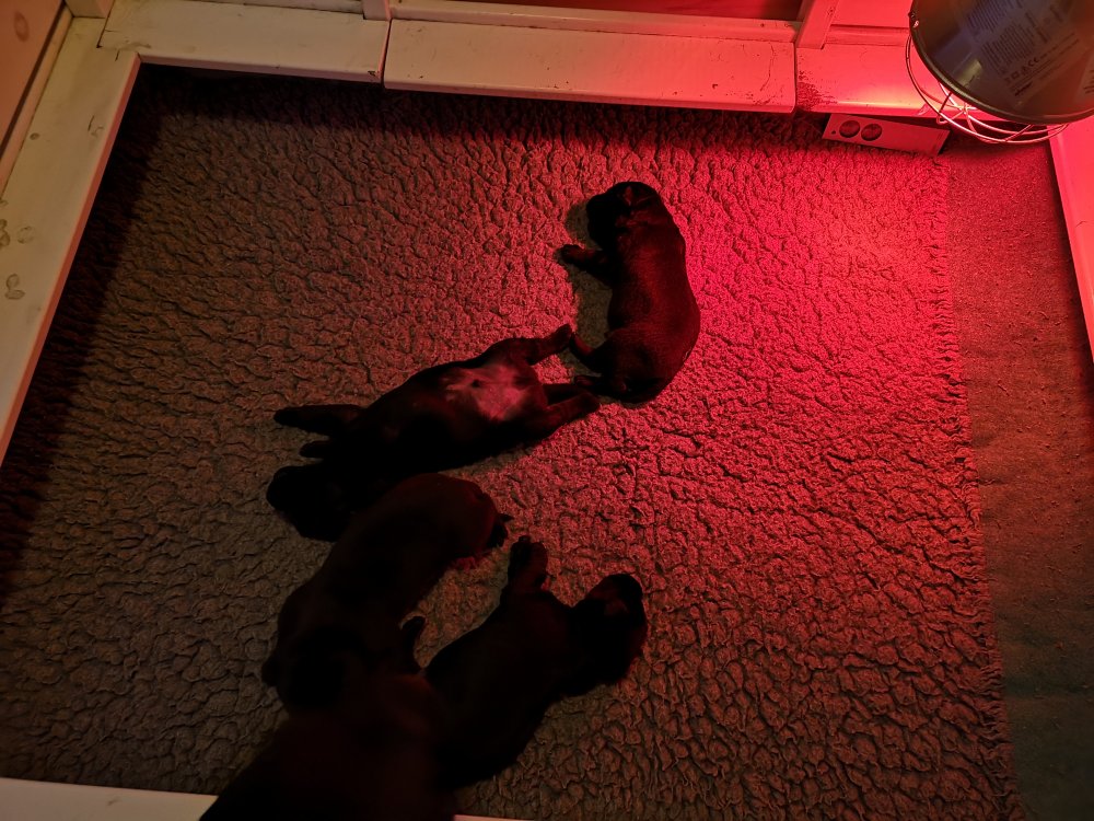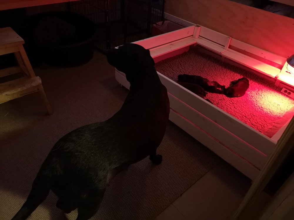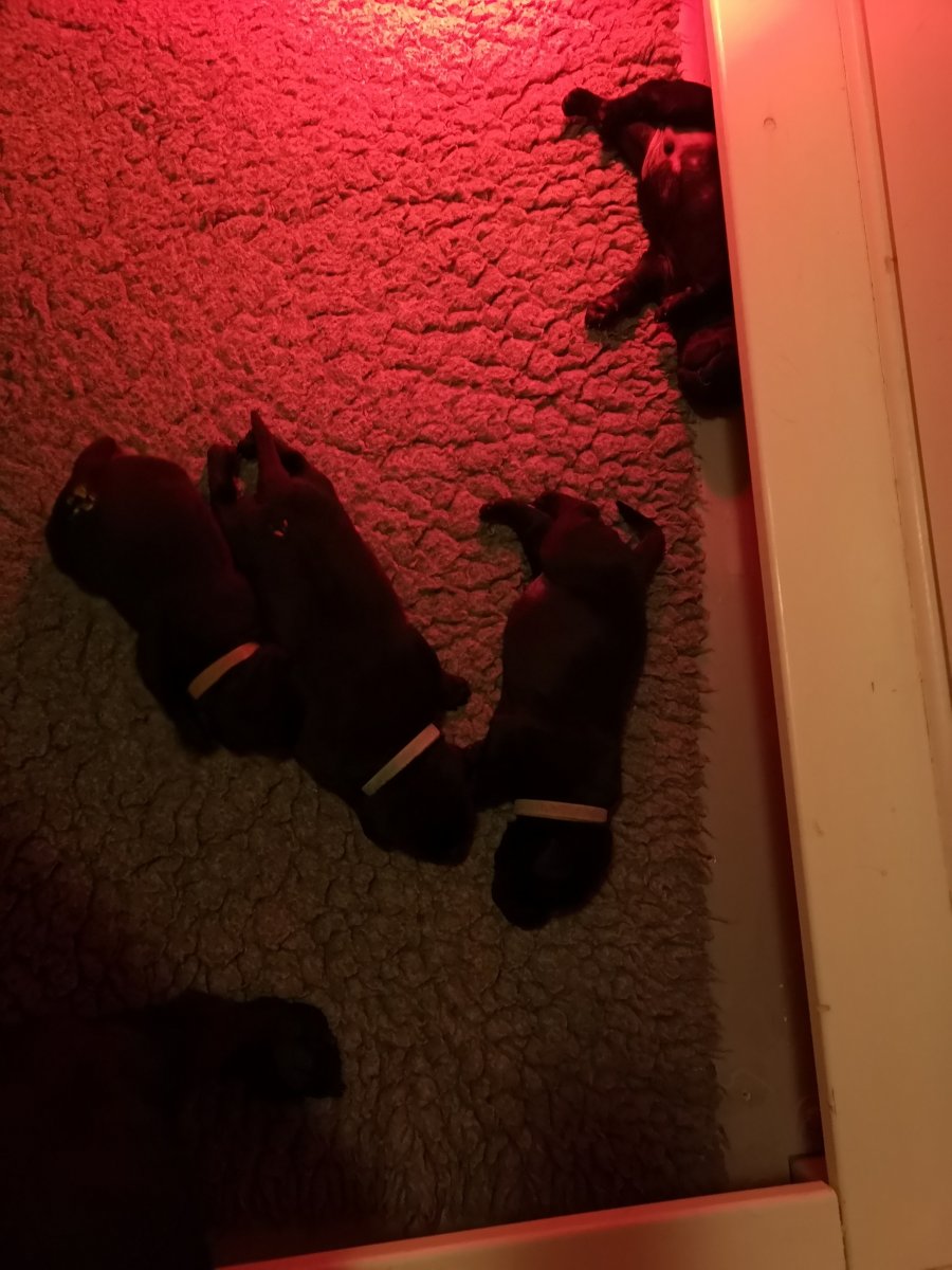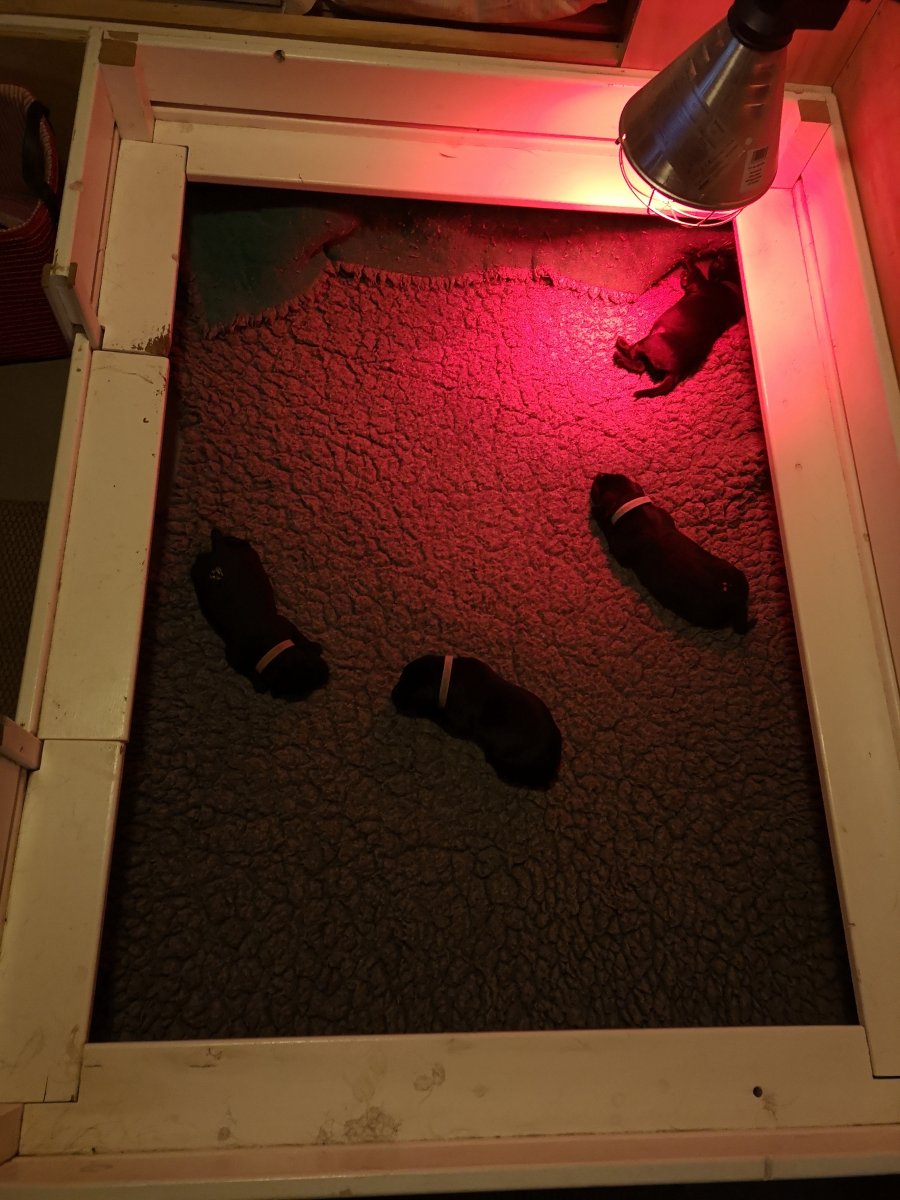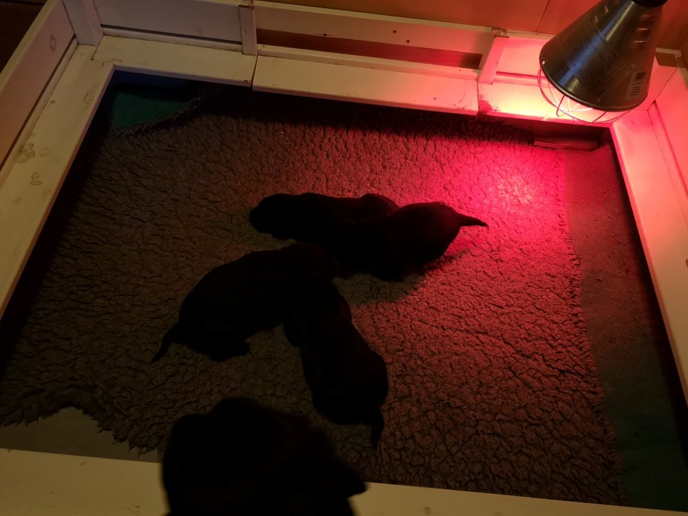 Lidt billeder fra den første uge i hvalpekassen, det røde lys skyldes varmelampe.