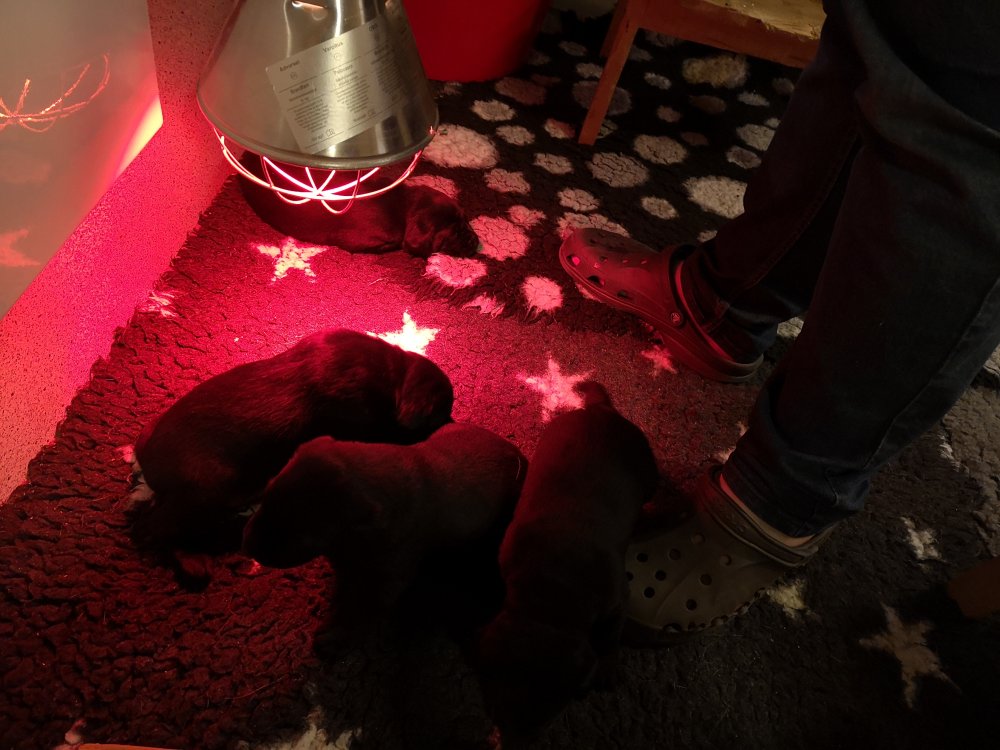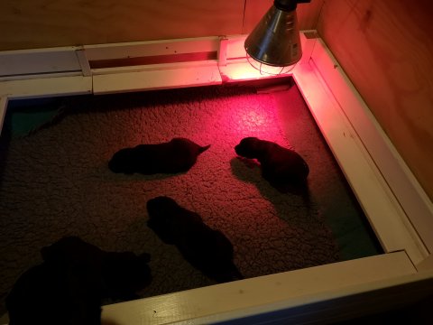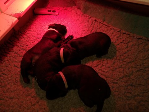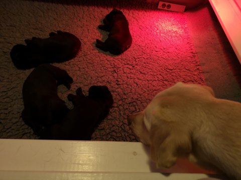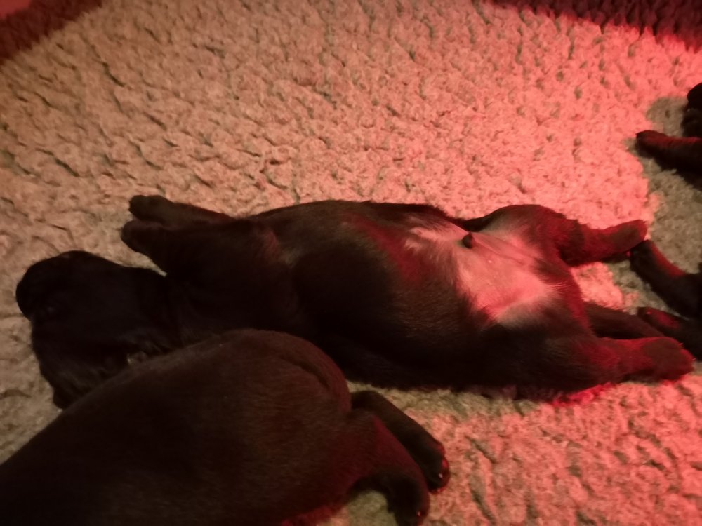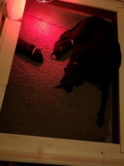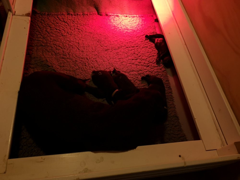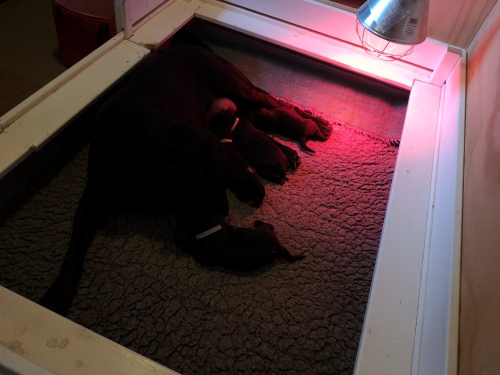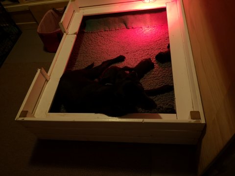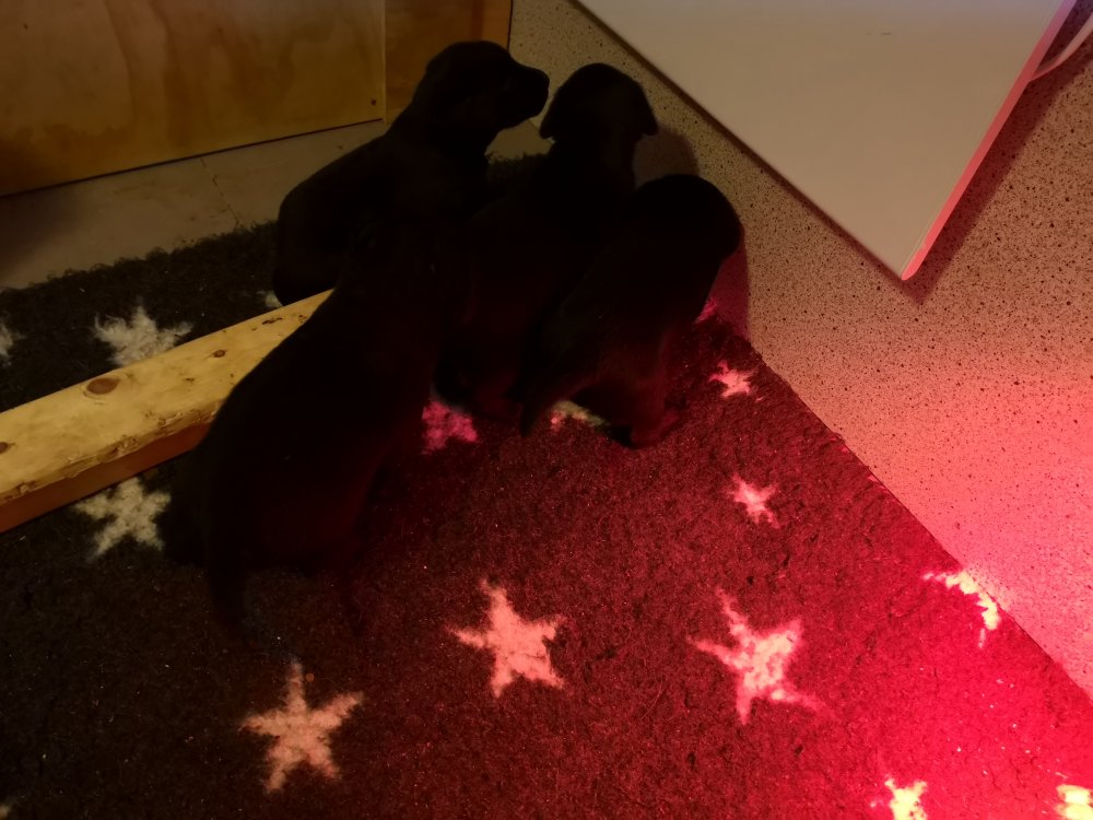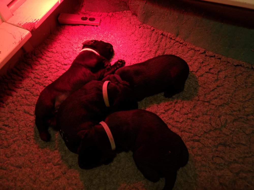 Lidt billeder fra den første uge i hvalpekassen, det røde lys skyldes varmelampe.