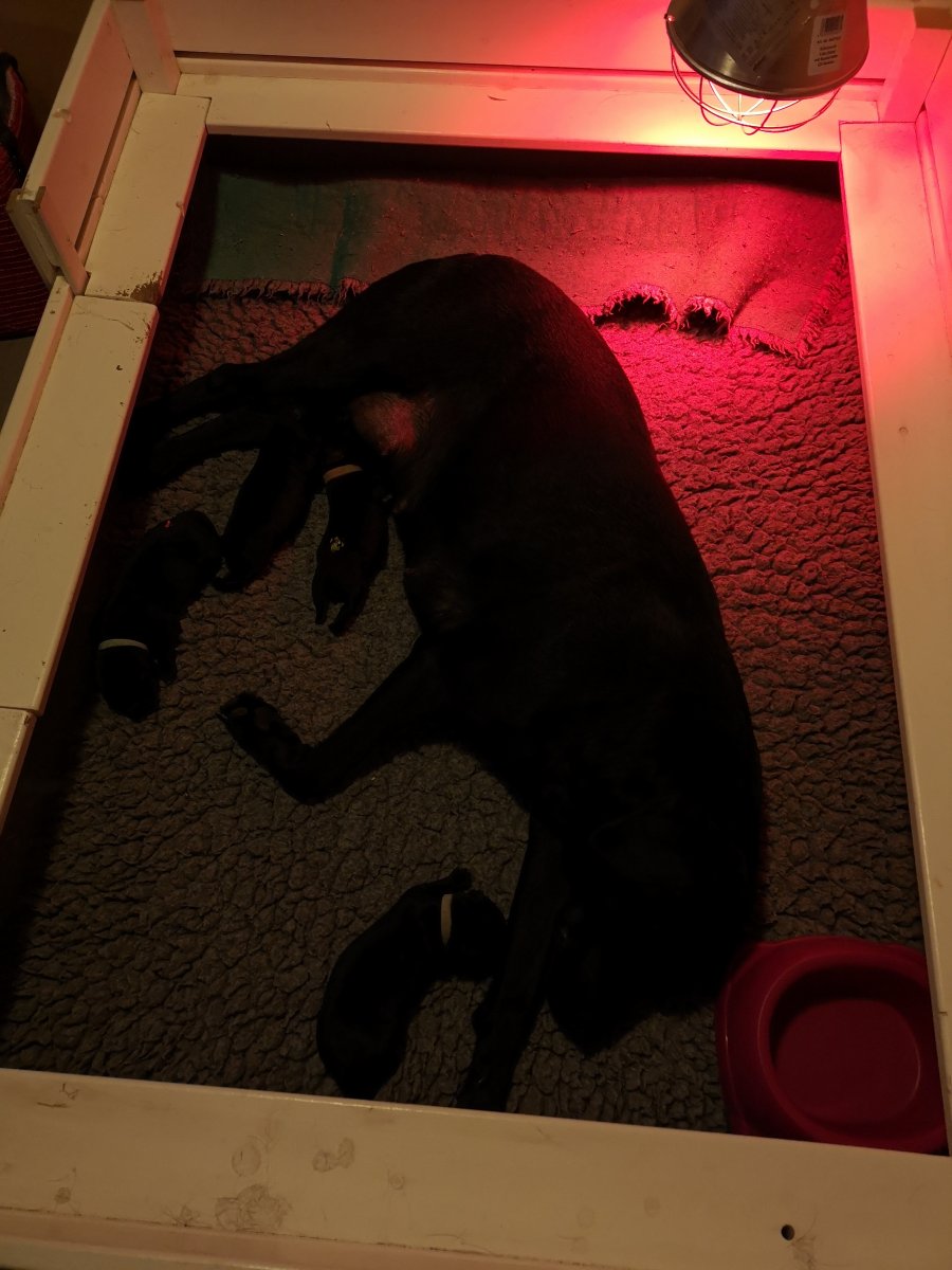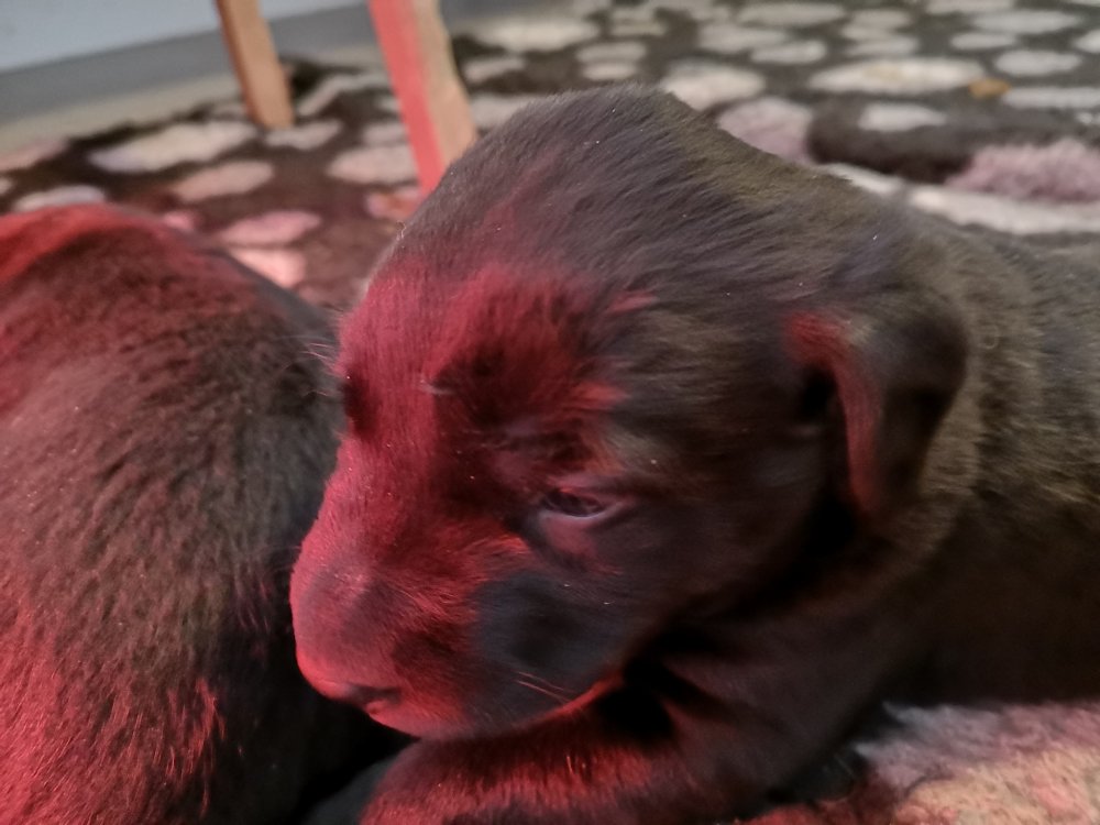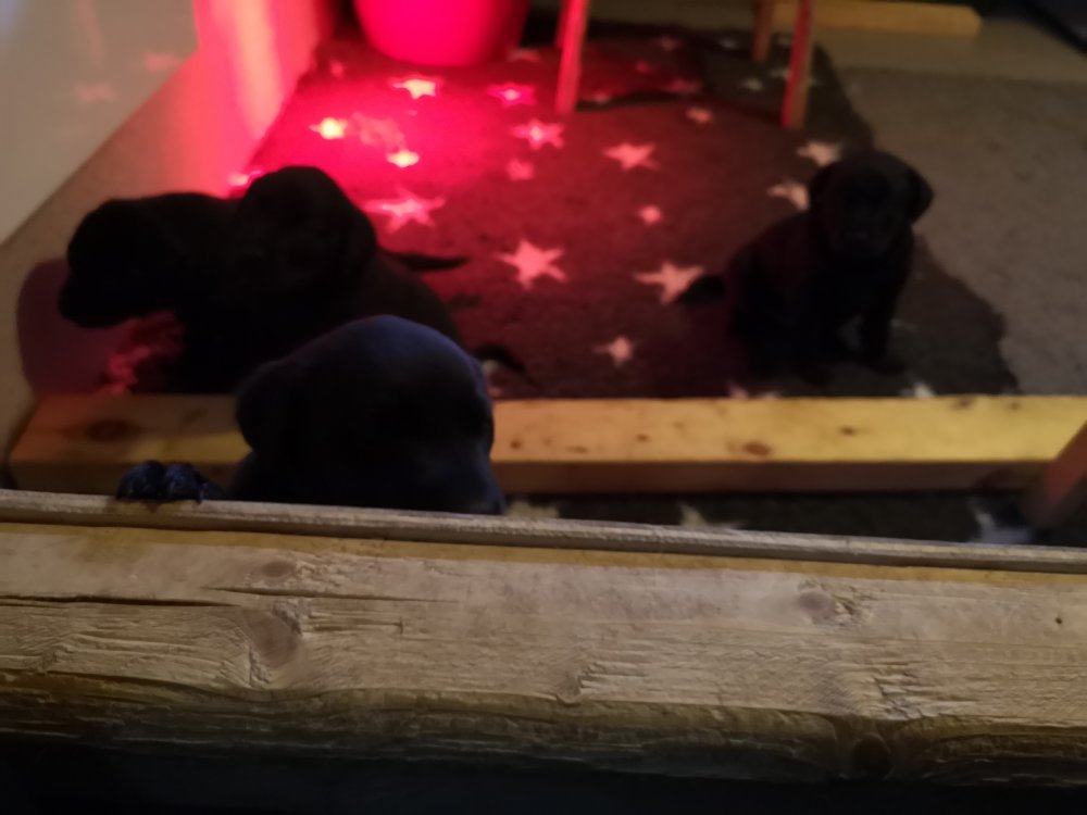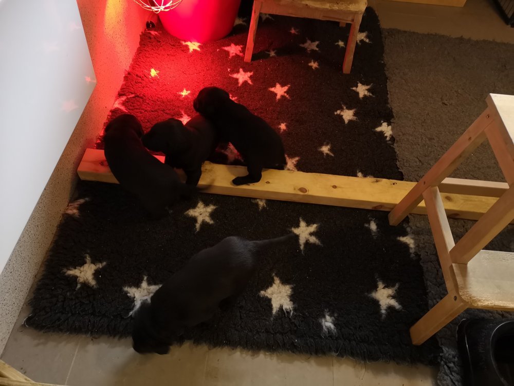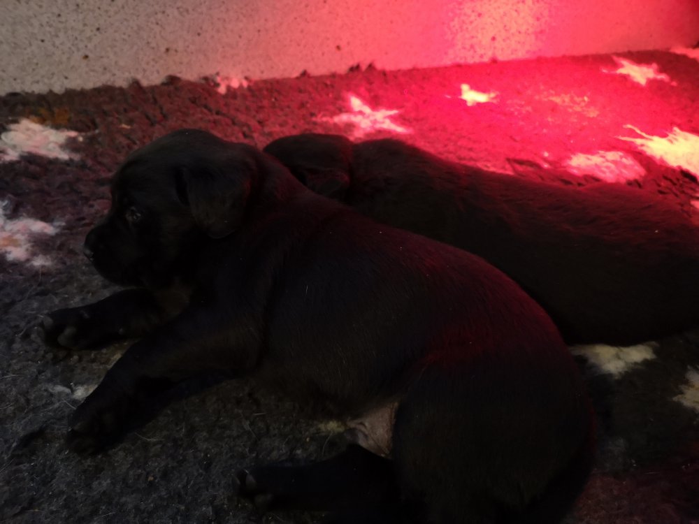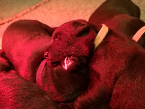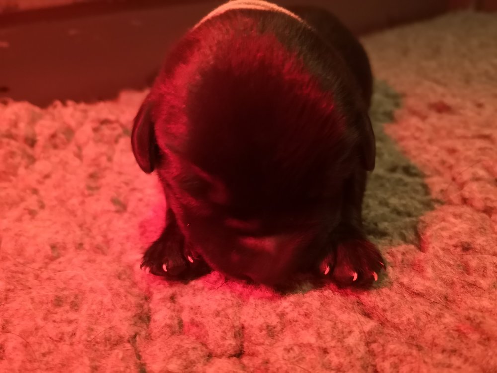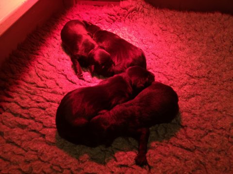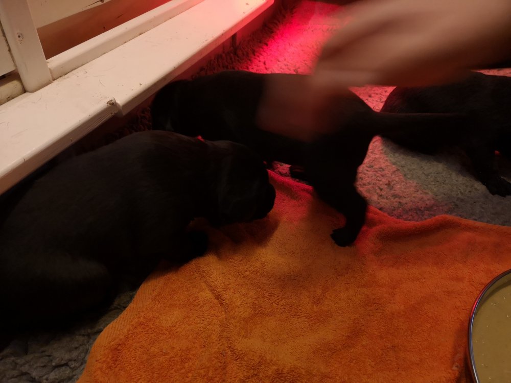 Lidt billeder fra den første uge i hvalpekassen, det røde lys skyldes varmelampe.