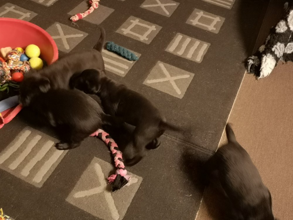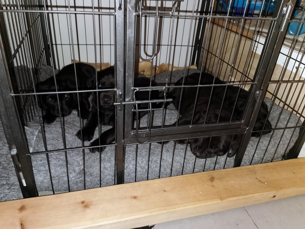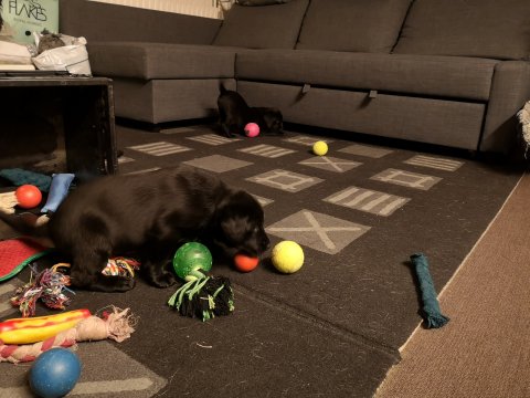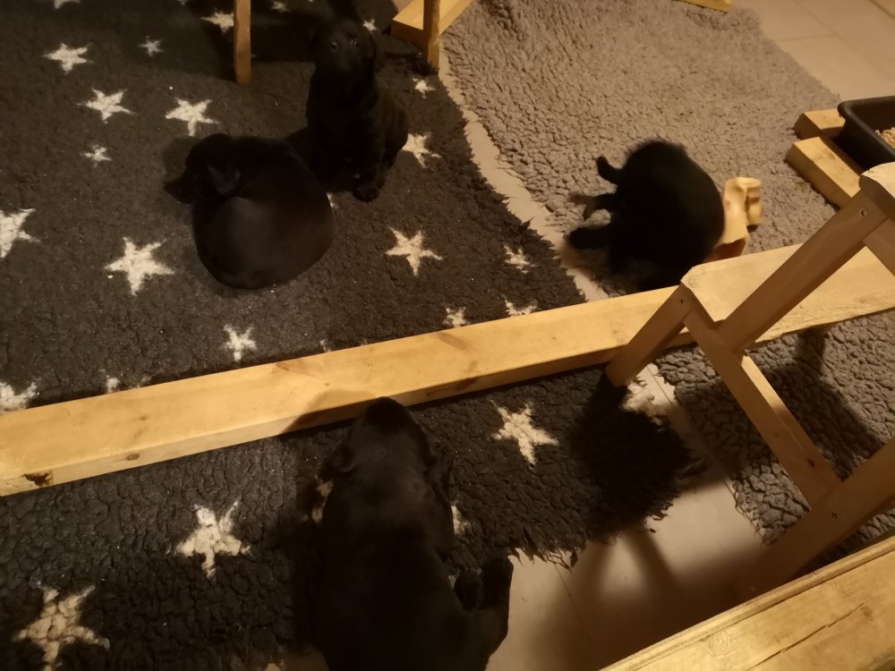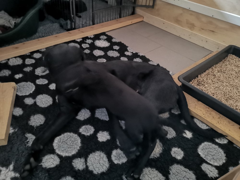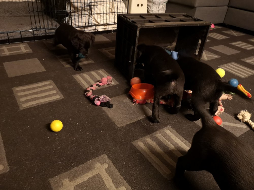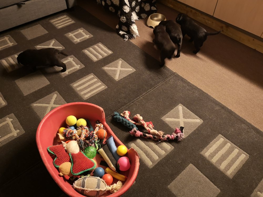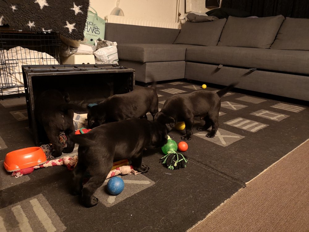 Det er den sidste uge i hvalpekassen og der har rigtig været gang i rummet, der blevet tumlet, leget og hygget samt trænet i at blive renlig. De har hver dag været udenfor og i hvalpebørnehave og de er ikke altid klar til at de skal ind i deres rum igen, de vil rigtig gerne ud på nye oplevelser. Når vi kommer ned og ser ind rummet er de der med det samme og vil meget gerne snakkes med. De er alle klar og nysgerrig til at komme ud i verden ud på nye oplevelser i deres nye familier.