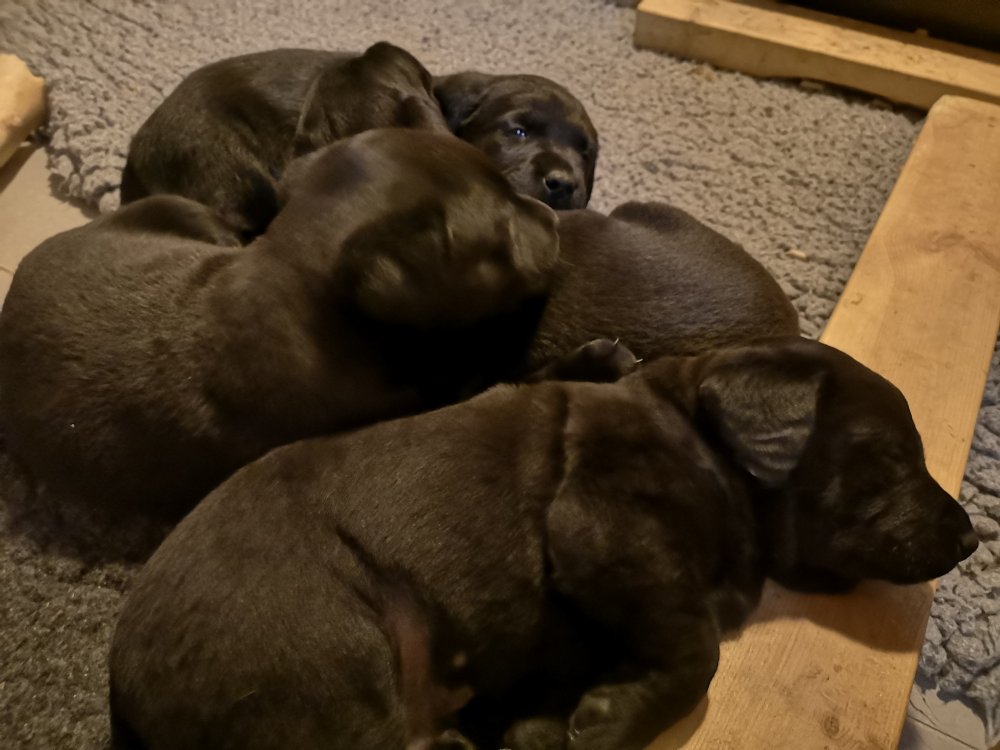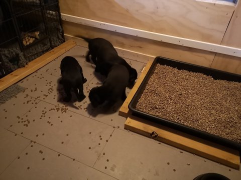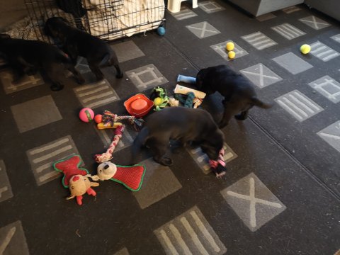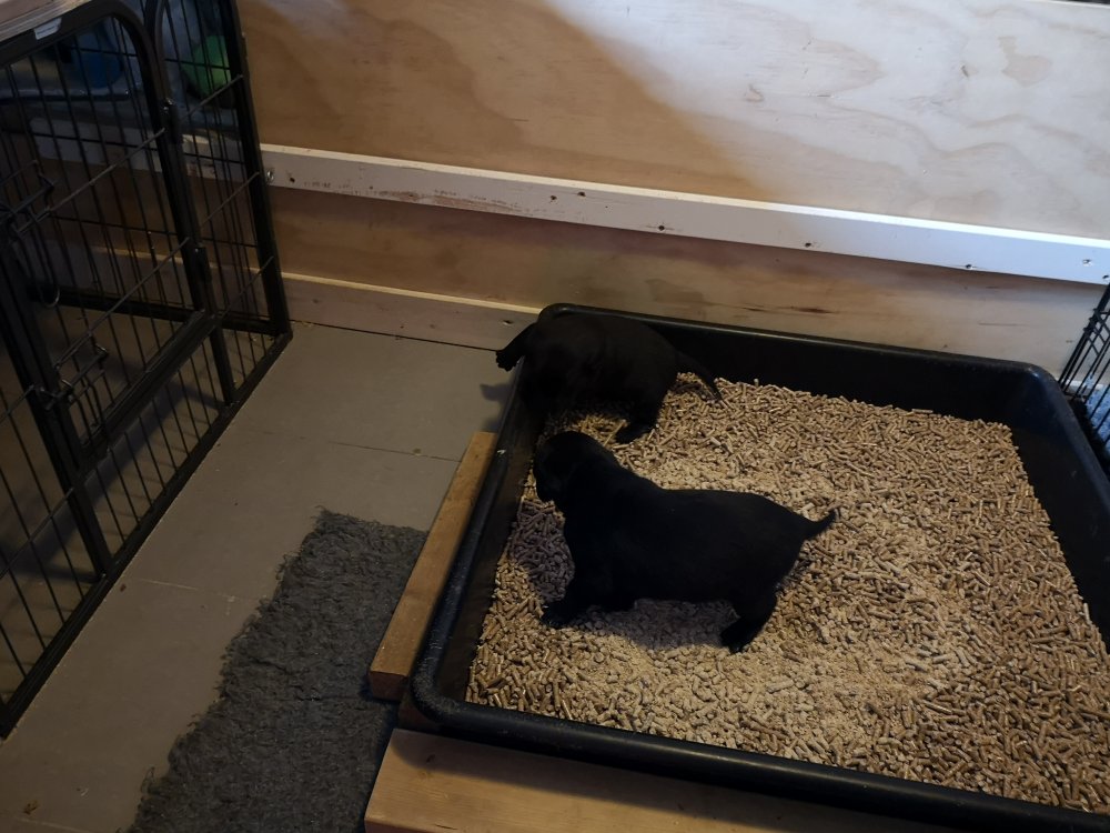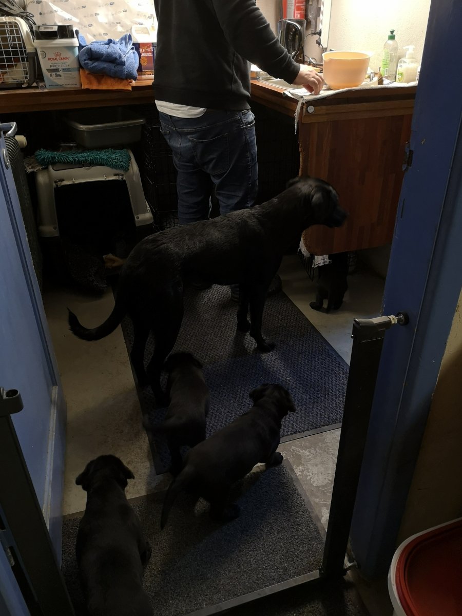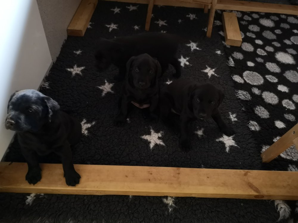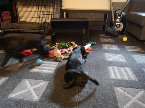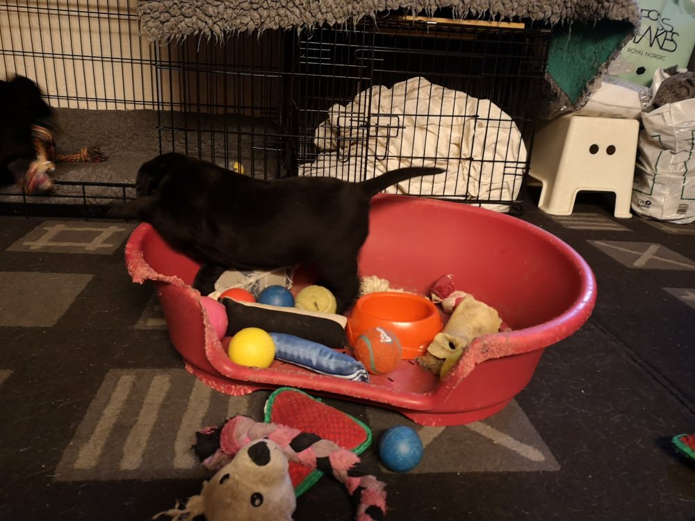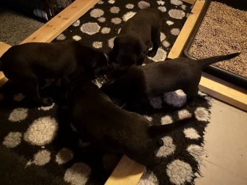 Det er den sidste uge i hvalpekassen og der har rigtig været gang i rummet, der blevet tumlet, leget og hygget samt trænet i at blive renlig. De har hver dag været udenfor og i hvalpebørnehave og de er ikke altid klar til at de skal ind i deres rum igen, de vil rigtig gerne ud på nye oplevelser. Når vi kommer ned og ser ind rummet er de der med det samme og vil meget gerne snakkes med. De er alle klar og nysgerrig til at komme ud i verden ud på nye oplevelser i deres nye familier.