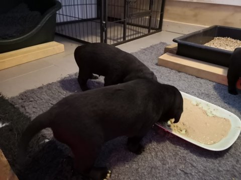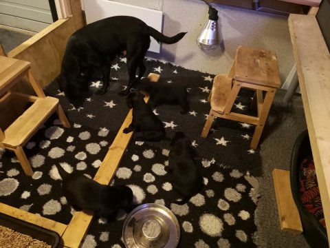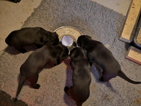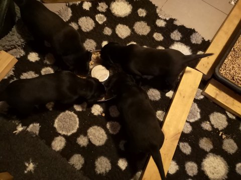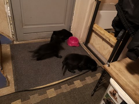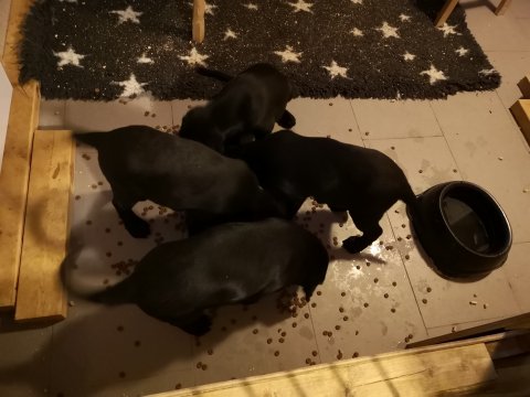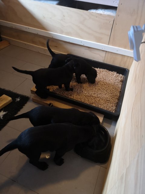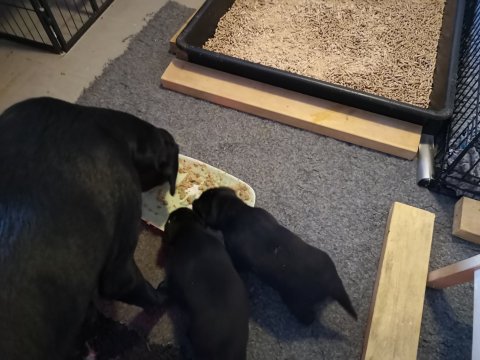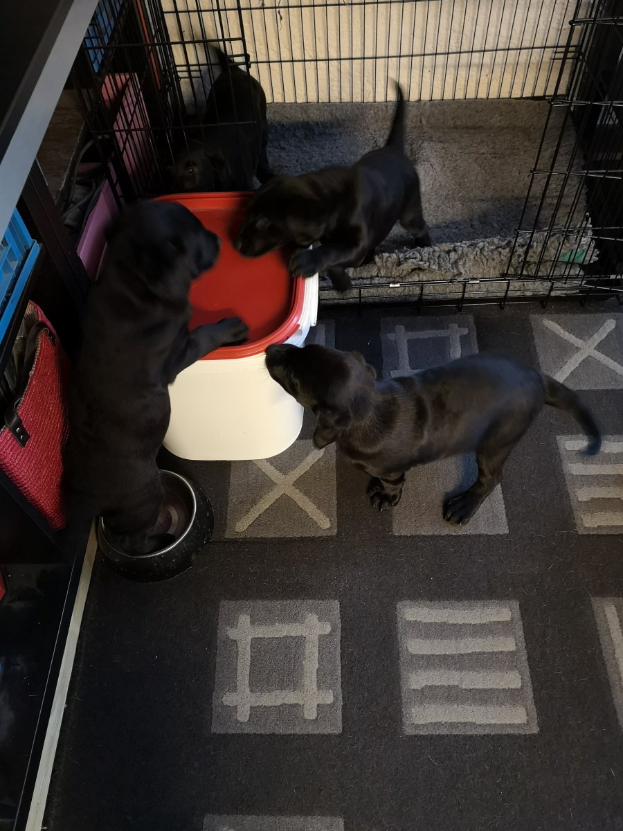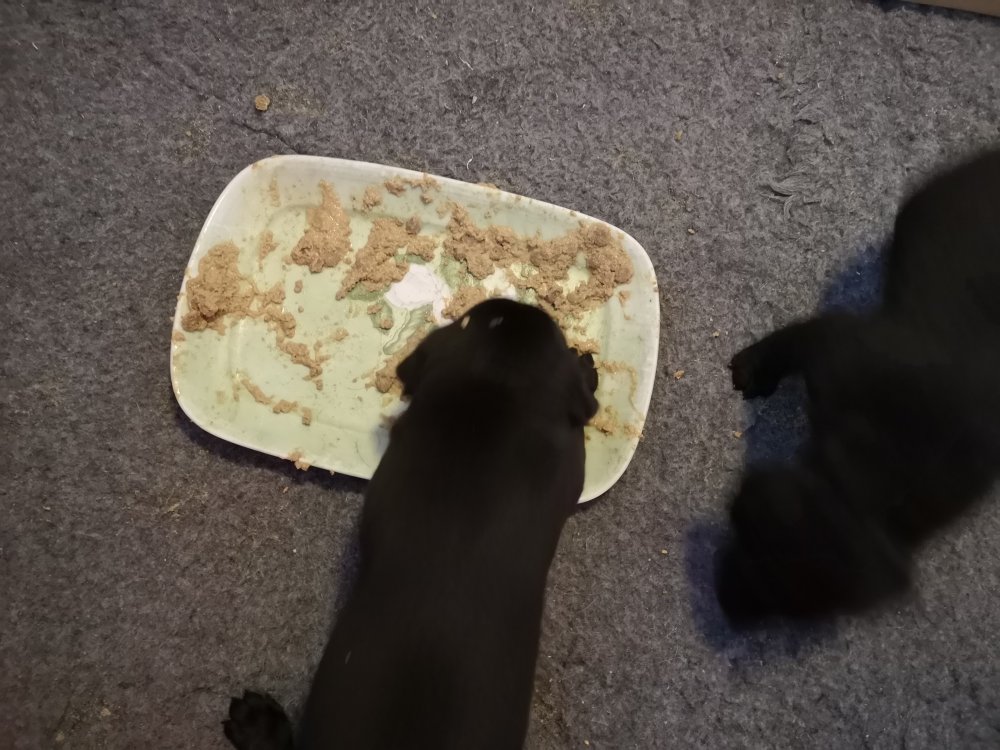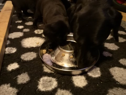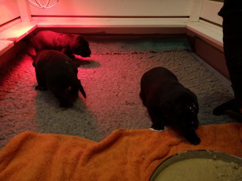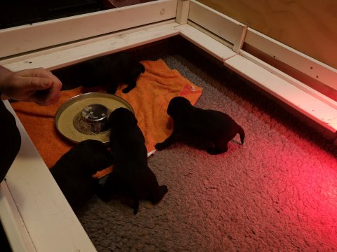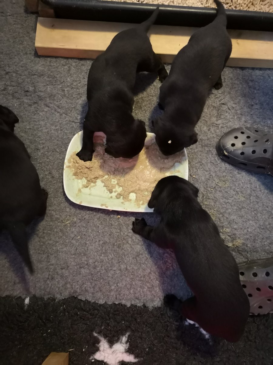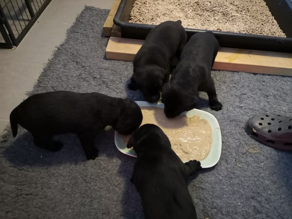 Sidst på ugen er de flyttet ud af hvalpekasse, hvilke Zoe nyder, så er der også plads til hende, når de skal have mælk. De er også begyndt at få opblødt hundefoder, ikke alle synes det er lige godt de vil hellere have Zoe mælkebar.