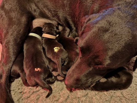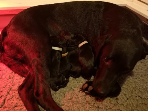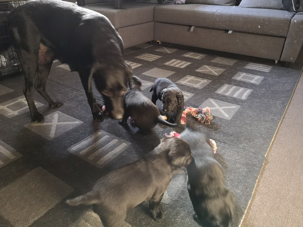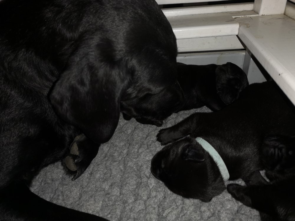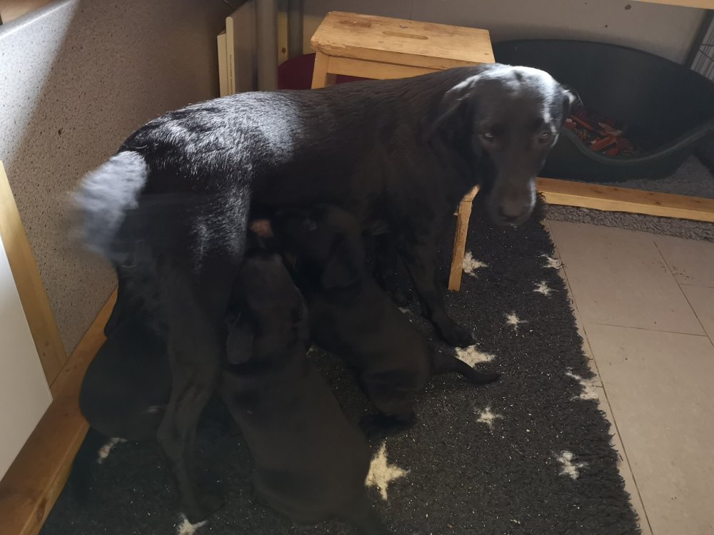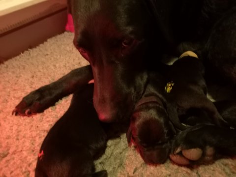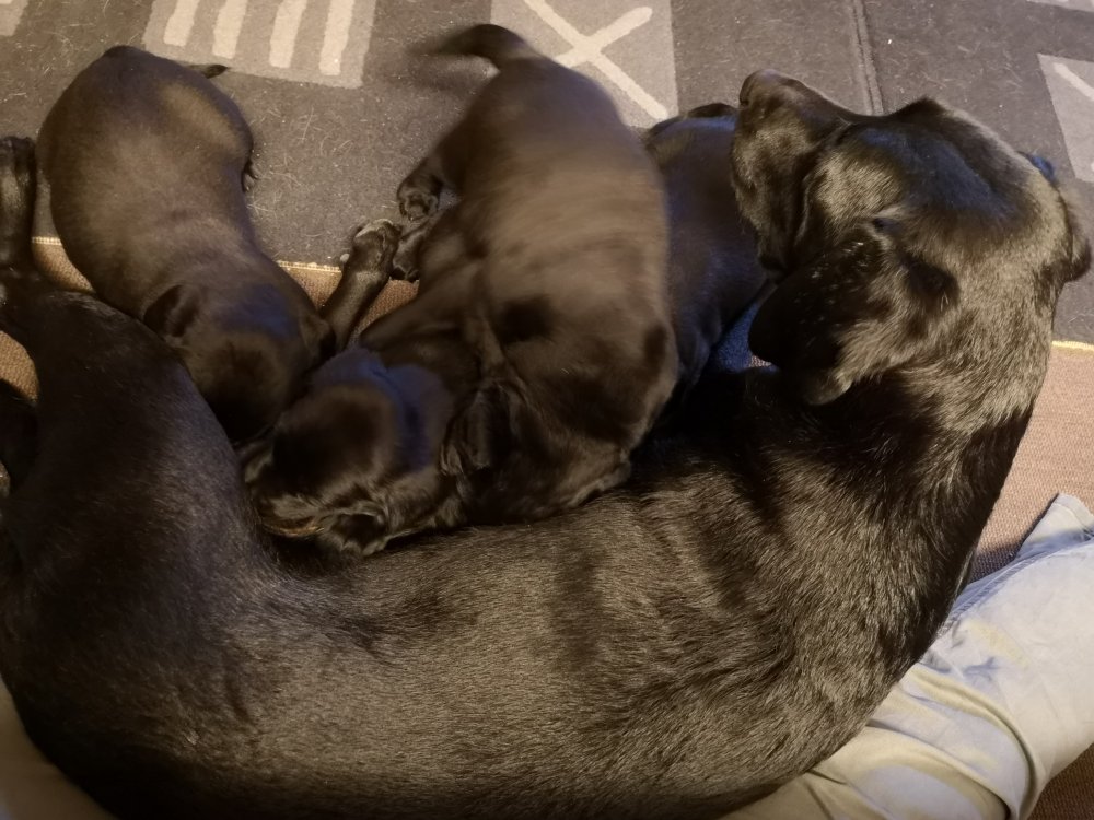 Zoe rigtig glad og stolt, passer godt på hendes hvalpe og viser os gerne.