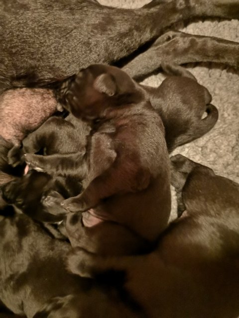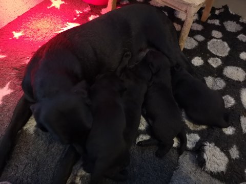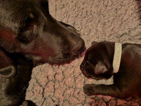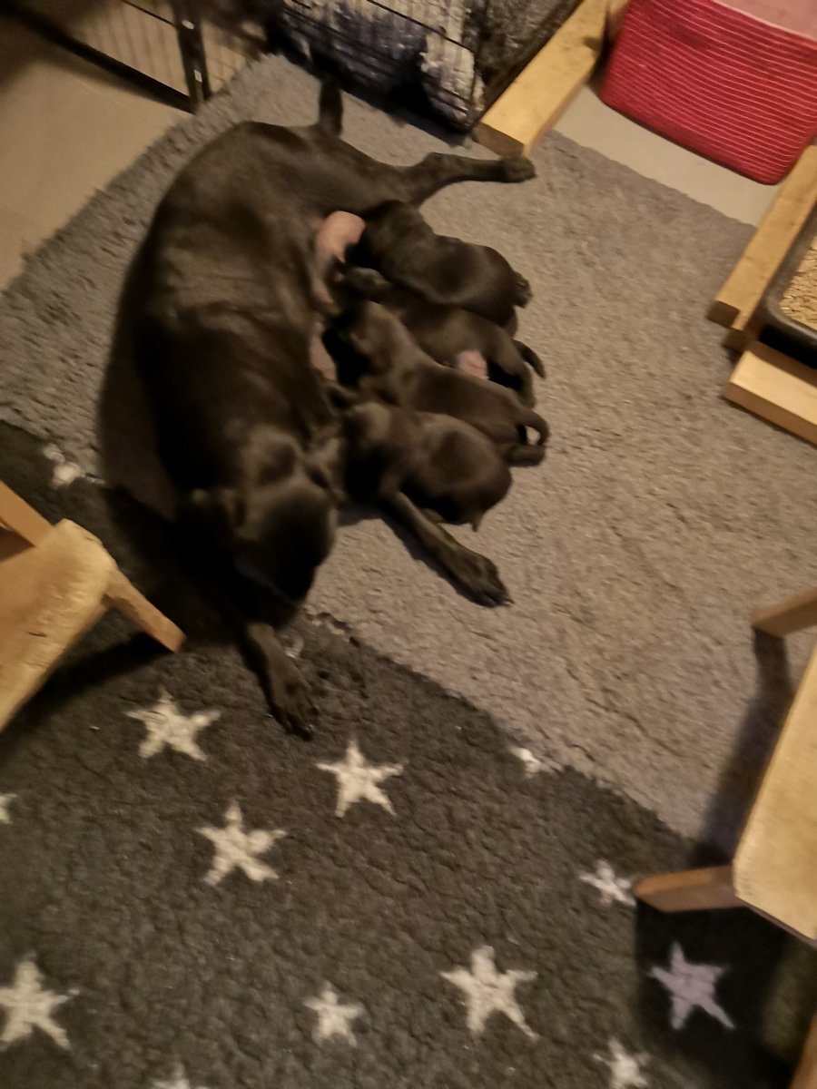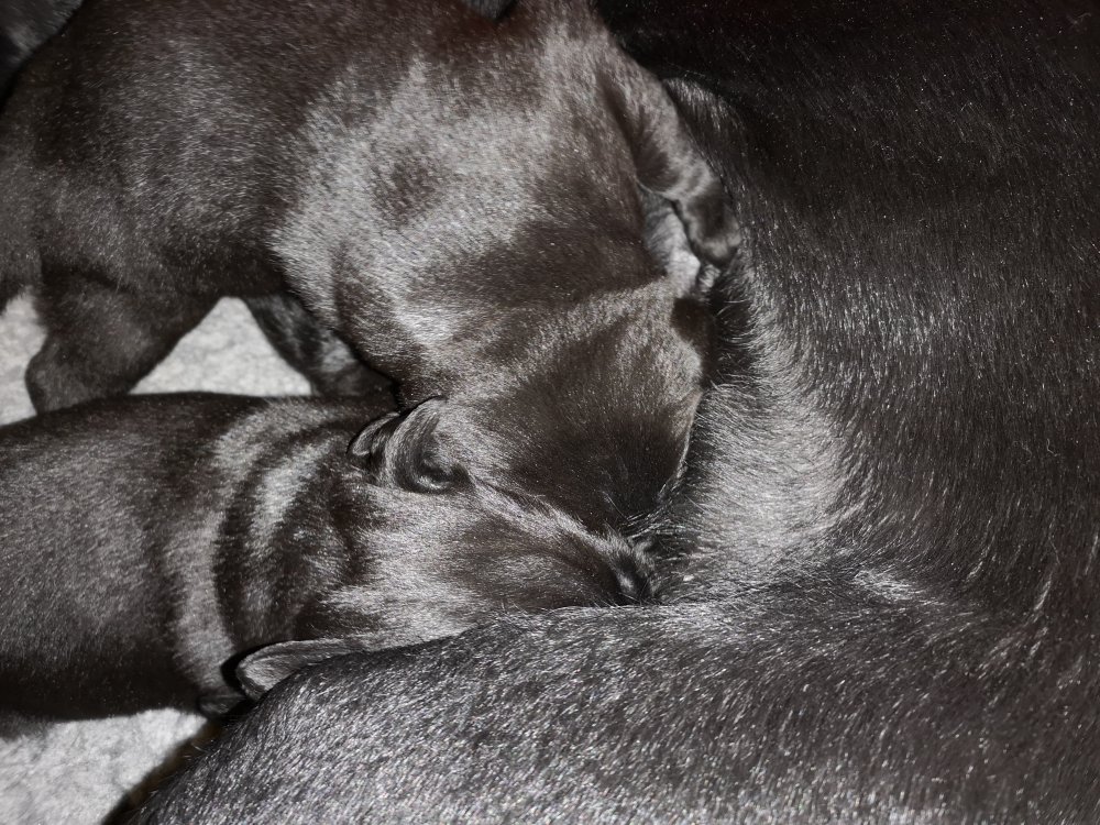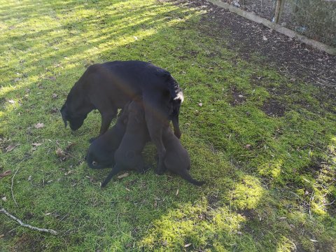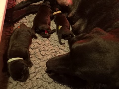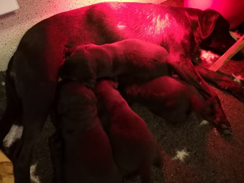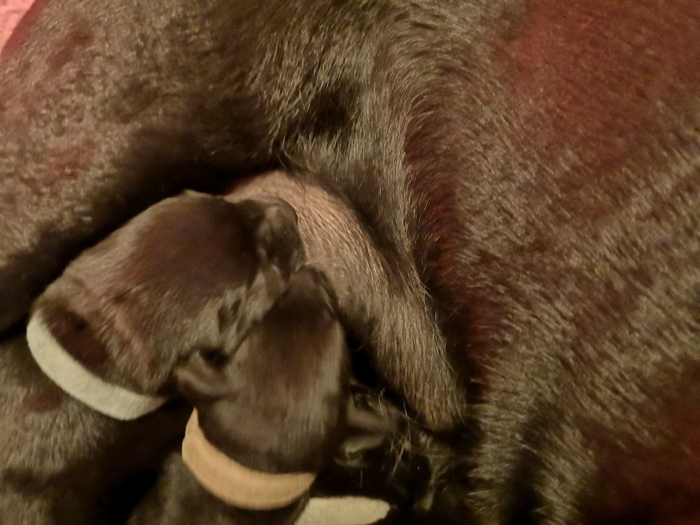 Zoe rigtig glad og stolt, passer godt på hendes hvalpe og viser os gerne.