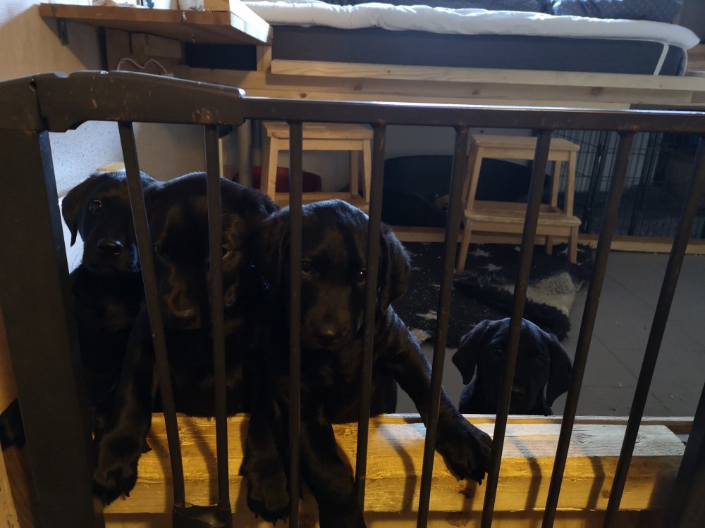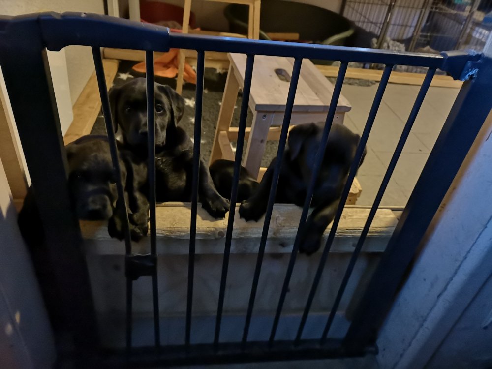 Hvalpene er blevet mere aktive og nysgerrige. De kigger op når vi står ved lågen og kalder vi på dem kommer de hen til os og de vil rigtig gerne snakkes med