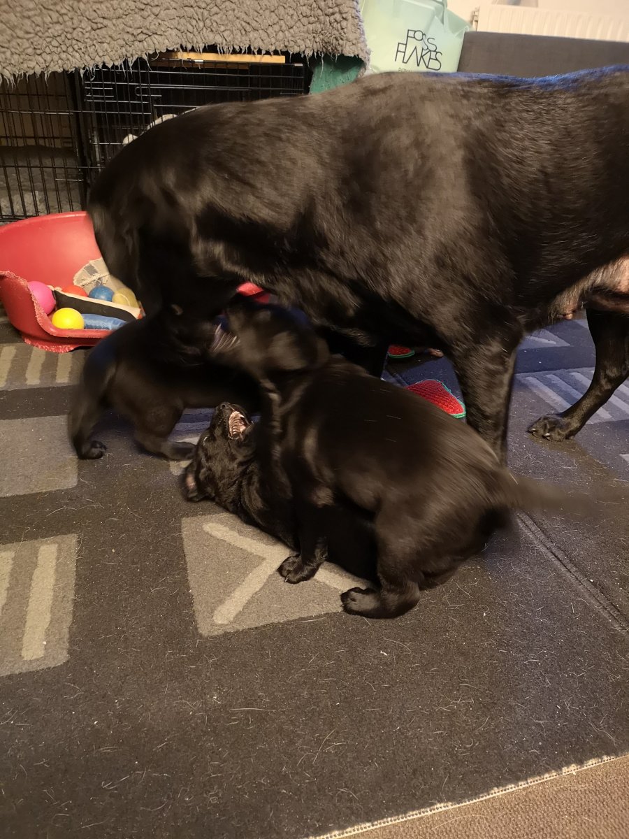 Hvalpene er begyndt at bevæge sig lidt mere i en blanding mellem krybe og forsøge på at bruge benene til at gå. Det er sjovt at se dem prøve at komme rundt i hvalpekassen. Dog går det meste af tiden med at spise pg sove.Vi er begyndt at kunne ane små sprækker ved øjnene, så det bliver så spændende at se de små øjne når de kommer frem. Zoe er en rigtig glad hundemor og passe på hendes hvalpe, når hvalpende er mætte og sover kommer Zoe gerne op til os i stuen også har hun Zoe hygge tid.