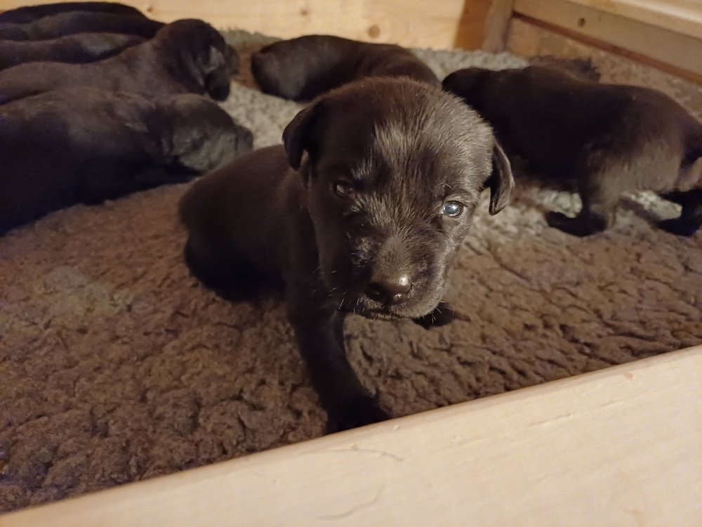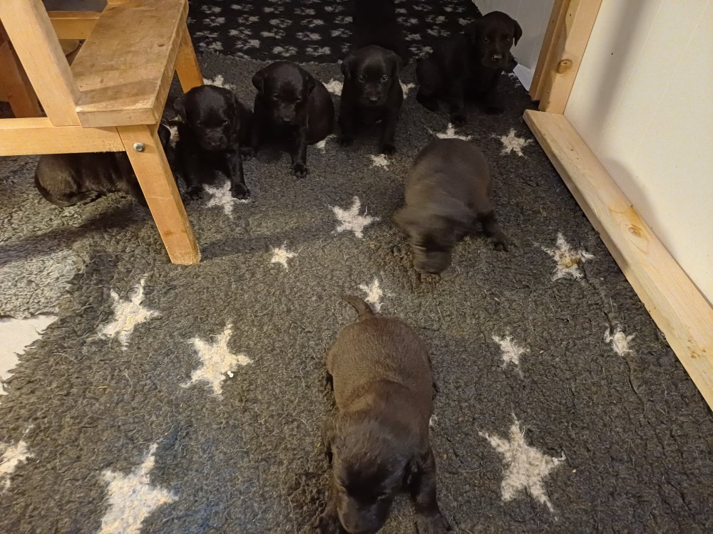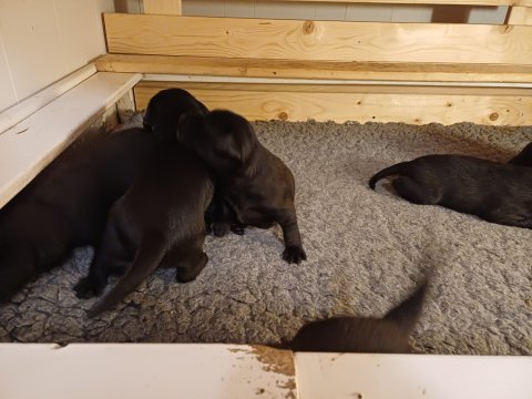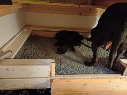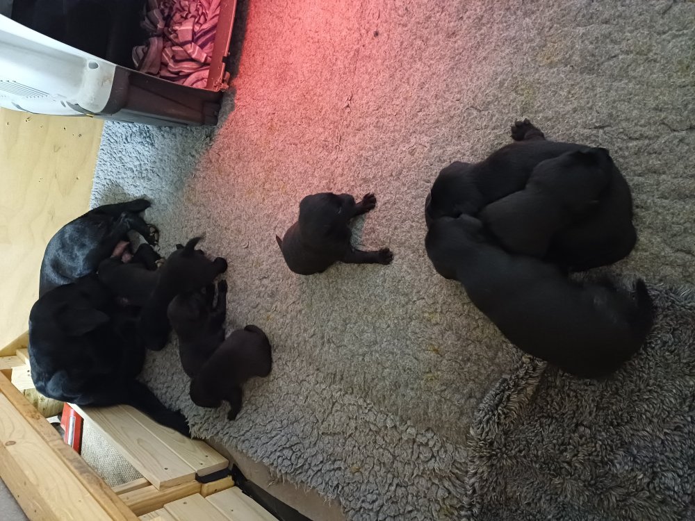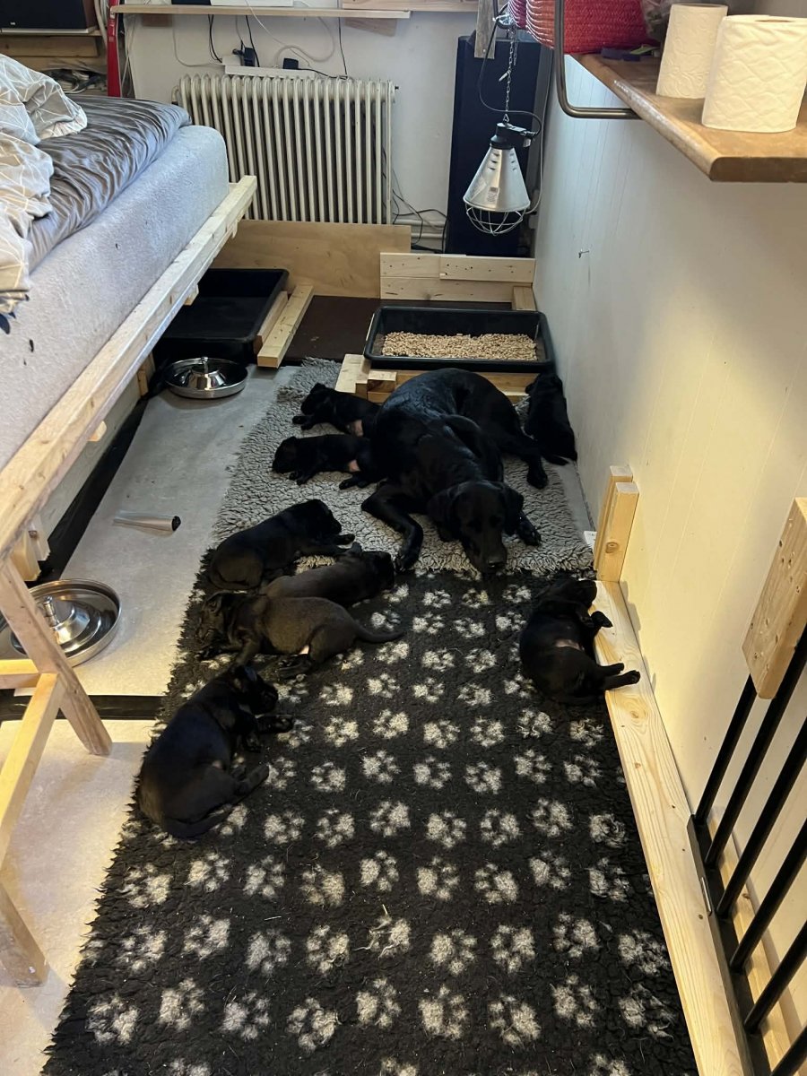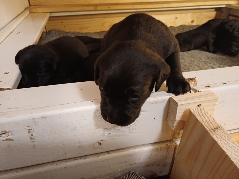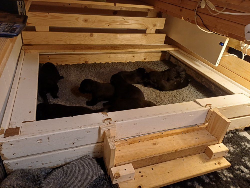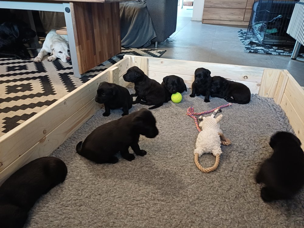 I denne uge er der sket meget med hvalpene. Den dag de blev 2 uger, kunne vi se øjne på dem alle.De er begyndt at bevæge sig rundt i kassen næste som rigtig som hunde, nogle af dem er også begyndt at øve deres kald, nogle gange kommer der noget der lidt et bjæf/gø 😊.De har også opdaget de andre hvalpe i kasse, så de er begyndt at "slås" med hinanden og med deres mor. .Hvalpene er begyndt at kræve lidt mere plads, så de flyttet udfra "hvalpehul uden bordet og i rummet så der plads til at nyde Kate´s mælkebar