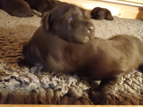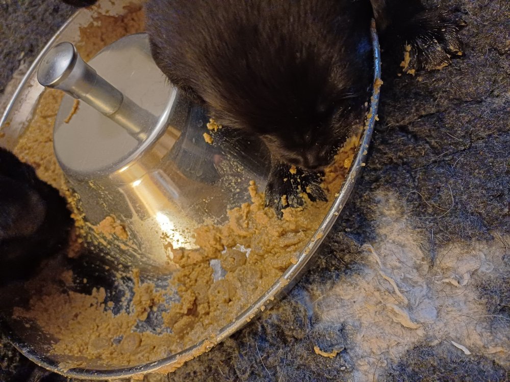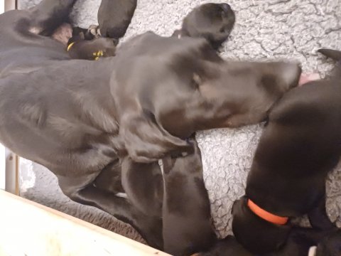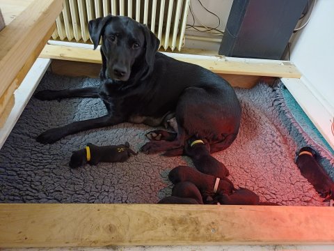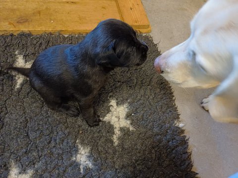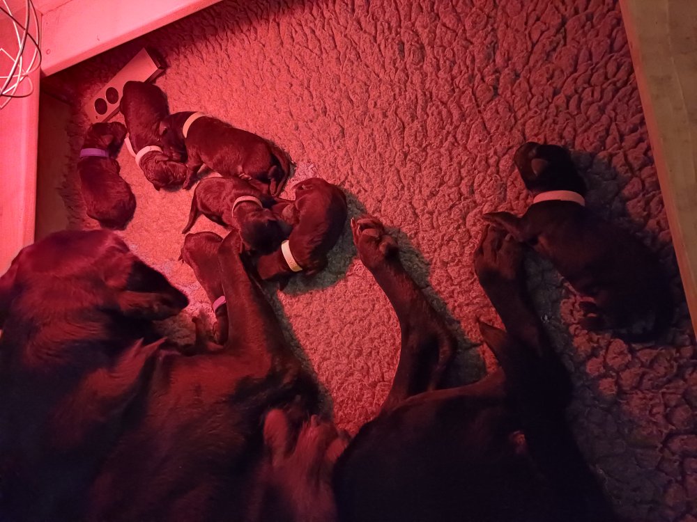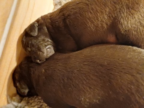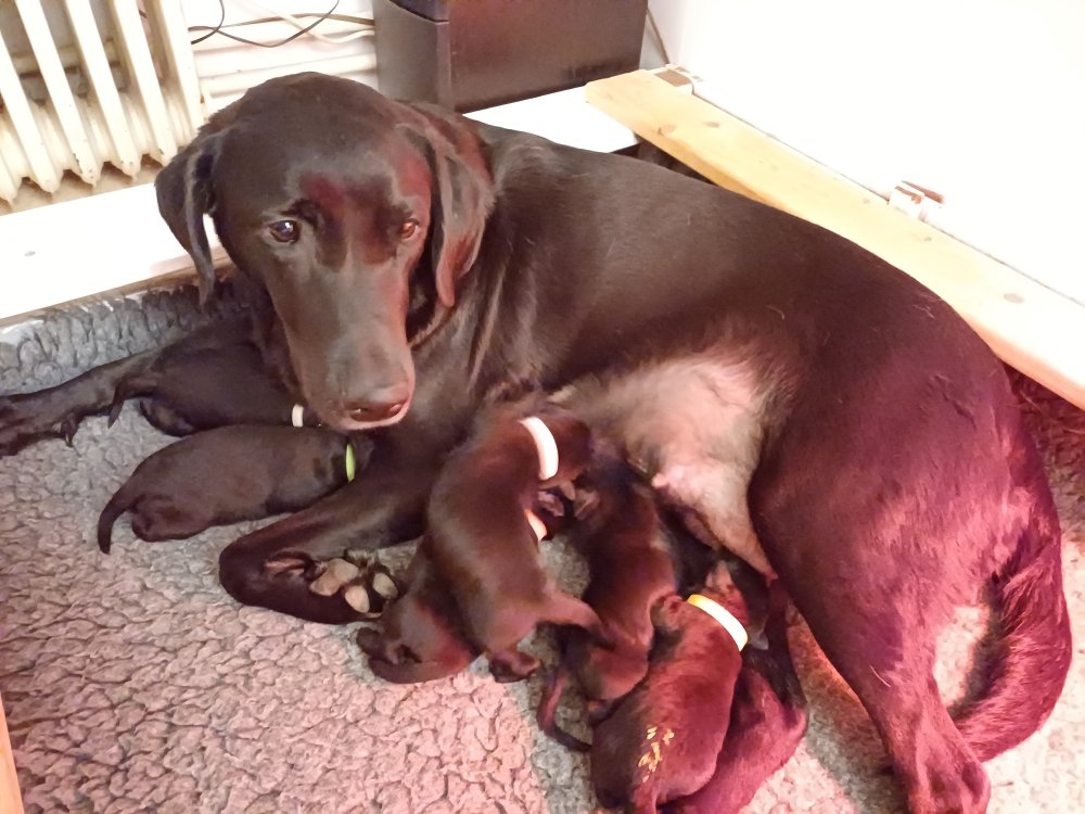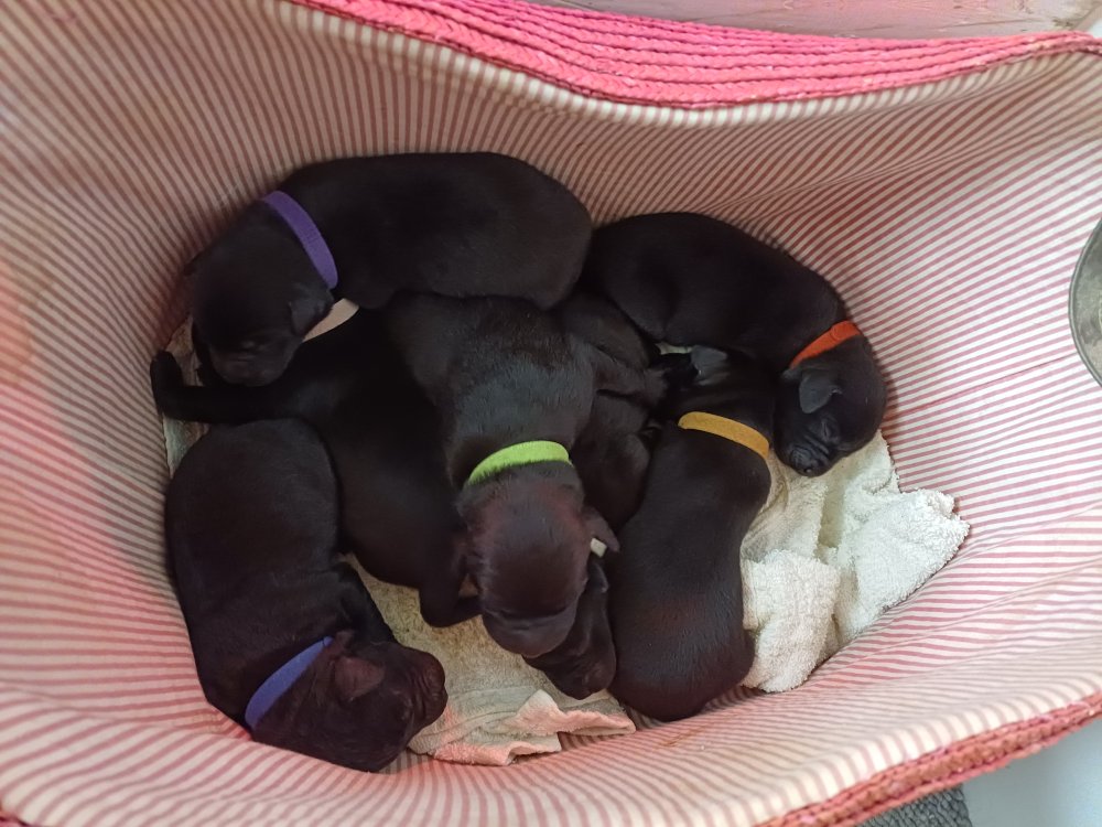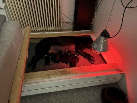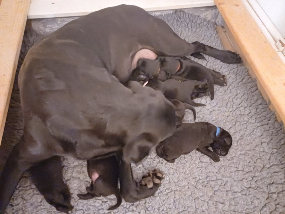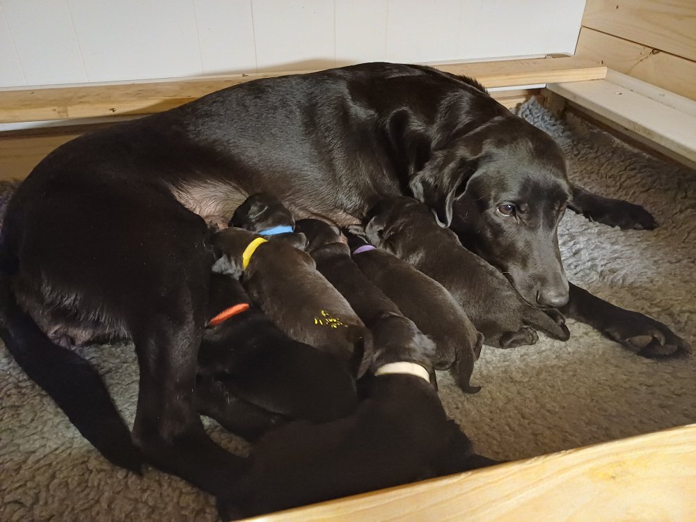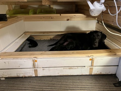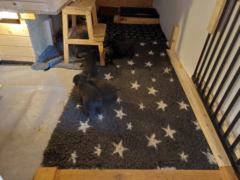 I denne uge er der sket meget med hvalpene. Den dag de blev 2 uger, kunne vi se øjne på dem alle.De er begyndt at bevæge sig rundt i kassen næste som rigtig som hunde, nogle af dem er også begyndt at øve deres kald, nogle gange kommer der noget der lidt et bjæf/gø 😊.De har også opdaget de andre hvalpe i kasse, så de er begyndt at "slås" med hinanden og med deres mor. .Hvalpene er begyndt at kræve lidt mere plads, så de flyttet udfra "hvalpehul uden bordet og i rummet så der plads til at nyde Kate´s mælkebar