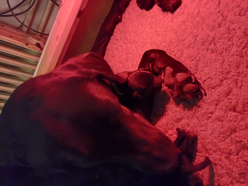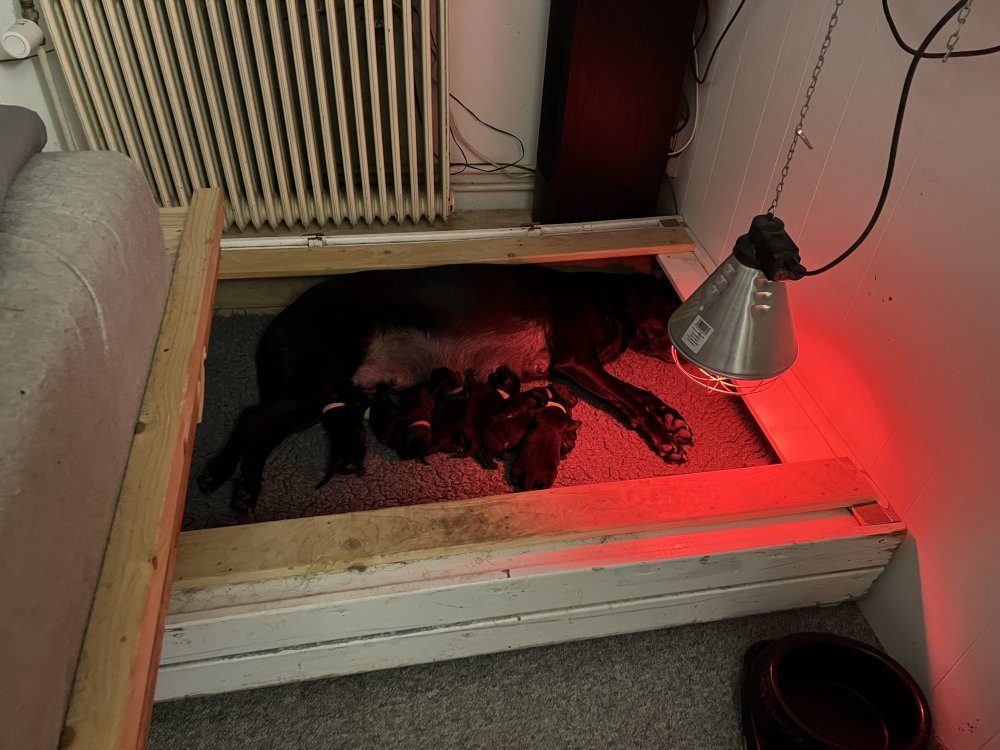 Vi er også begyndt at kunne ane små sprækker ved øjnene, så det bliver så spændende at se de små øjne, når de kommer frem. Kate er en rigtig god mor og hun nyder livet i hvalpekassen, hvor tiden stadig væk går tiden med at spise og sove. De andre hunde er tit inde og hilse på. Kate kommer også ind til os andre i stuen, når der ro i hvalpekassen for være sammen med resten af familien.
