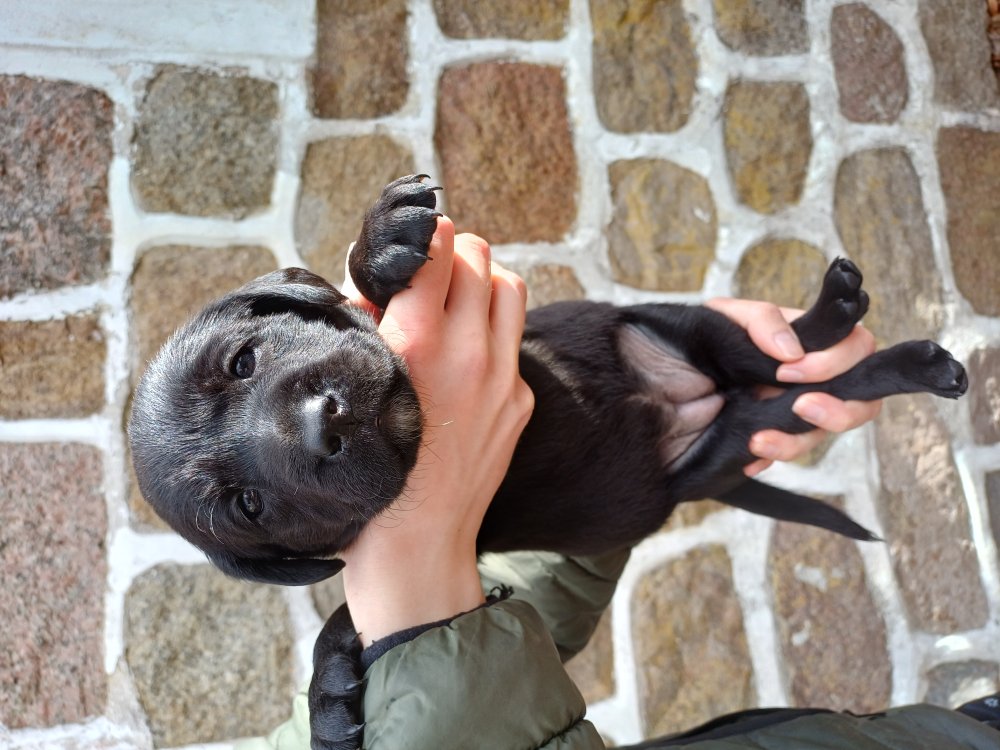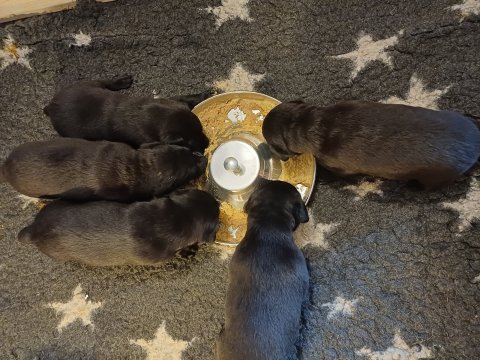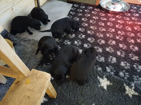 Hvalpene er flyttet ud af hvalpekasse og hvalpetoilette er kommet ind, så nu har de hele rummet.Når de er vågne, bliver der tumlet og prøvet kræfter med hinanden. Vi kan også se at de små hvalpetænder er ved at komme frem, så alt skal undersøges. Hvalpene får nu fast føde, opblødt hvalpefoder, og de er ved at være klar over at når der bliver fløjet kommer mad og bagefter er får mælk fra Kate´s mælkebar. Hvalpene har fået små fine hvalpetænder, så det er ikke altid rart at være Kate