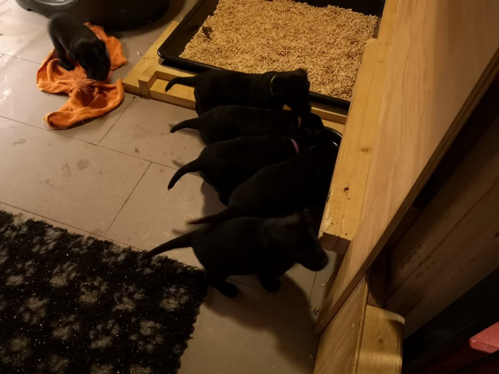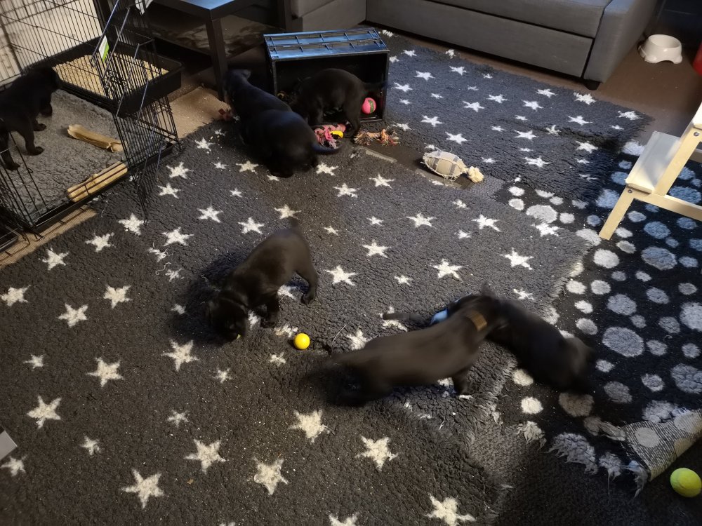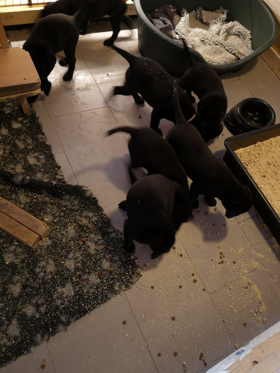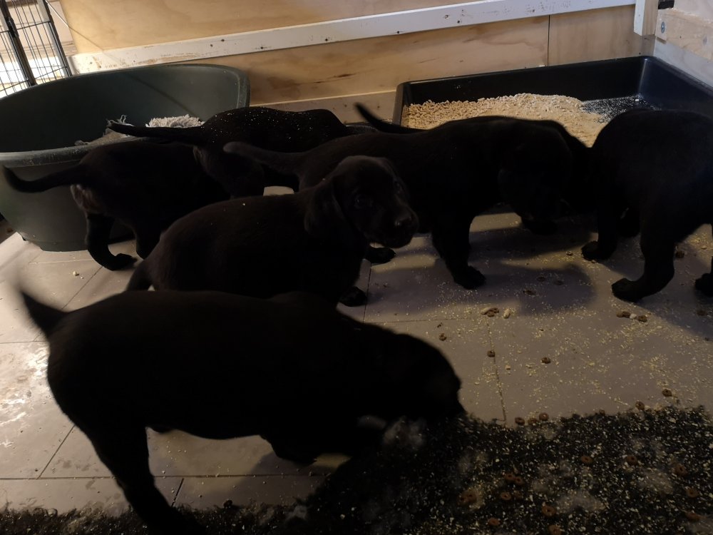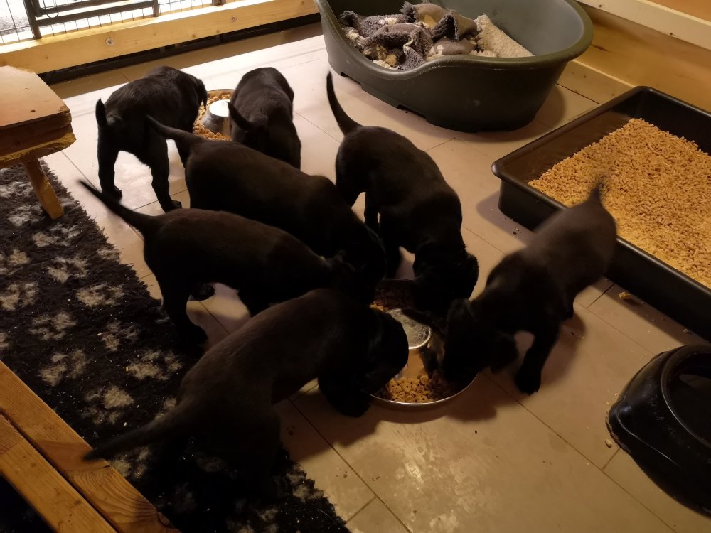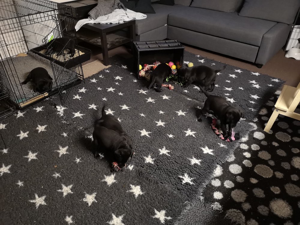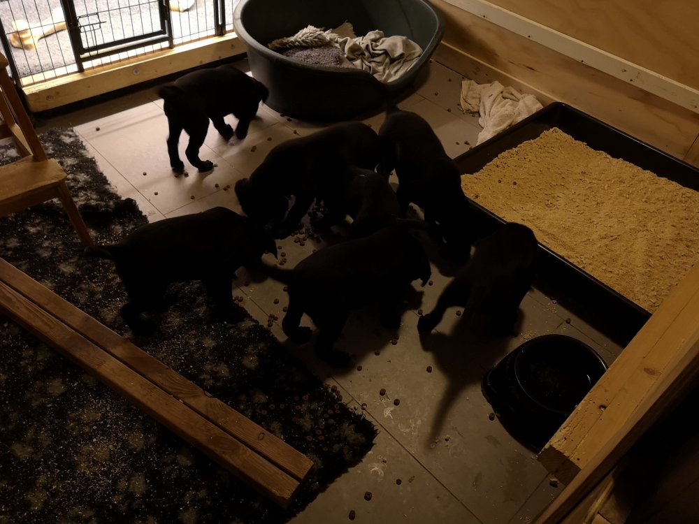 Hvalpene er flyttet ud af hvalpekasse og hvalpetoilette er kommet ind, så nu har de hele rummet. Der er kommet mere liv i rummet og der bliver tumlet og prøvet kræfter med hinanden. De små hvalpetænder er kommet frem, så alt skal undersøges. De får nu fast føde opblødt i vand, og de er ved at lærer at de ikke må gå i maden.