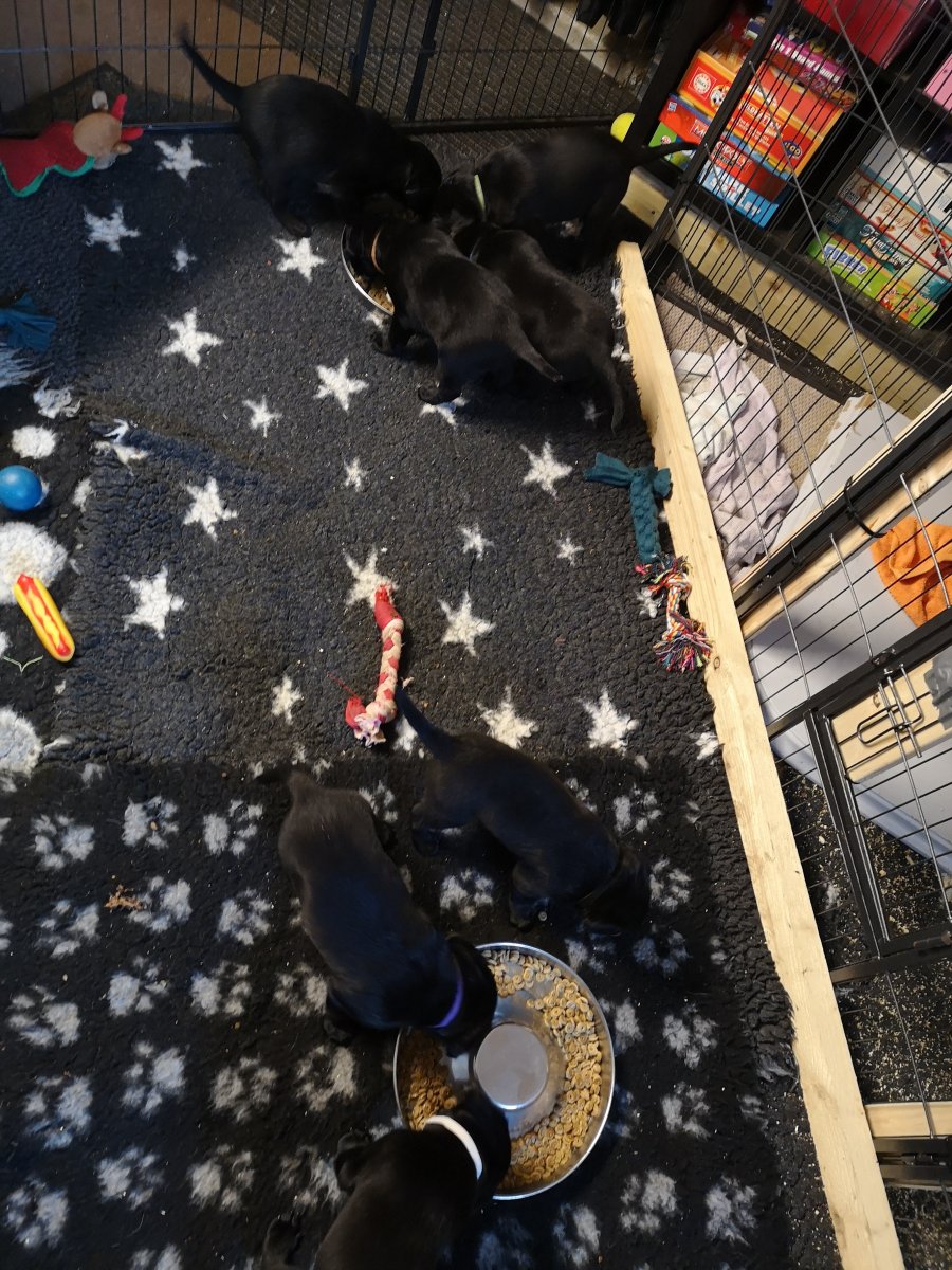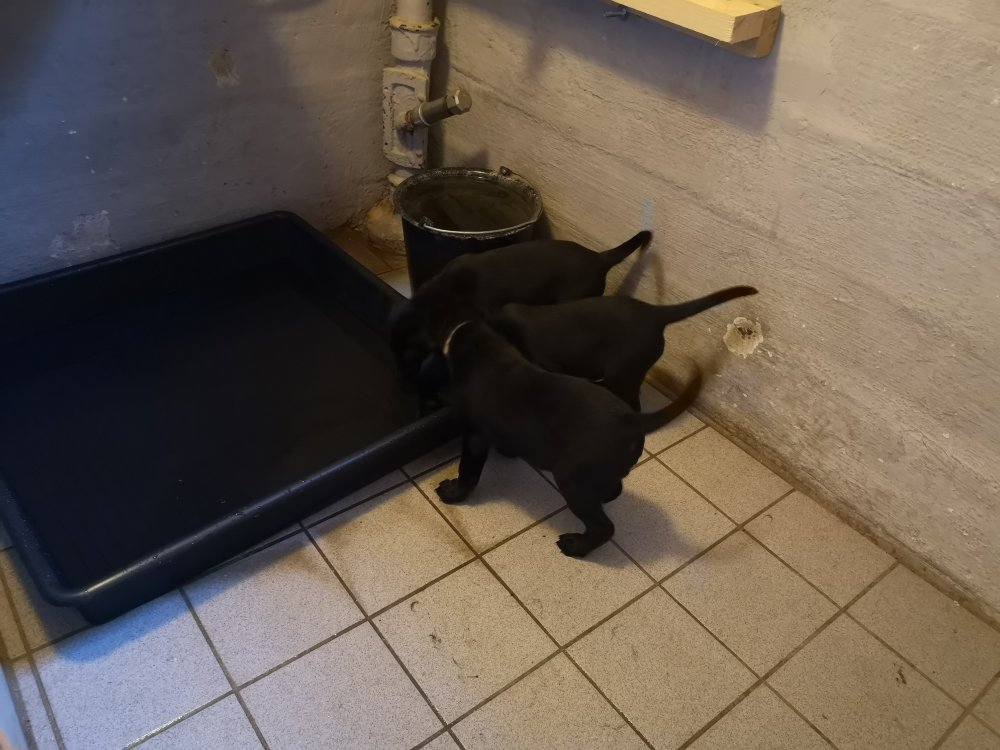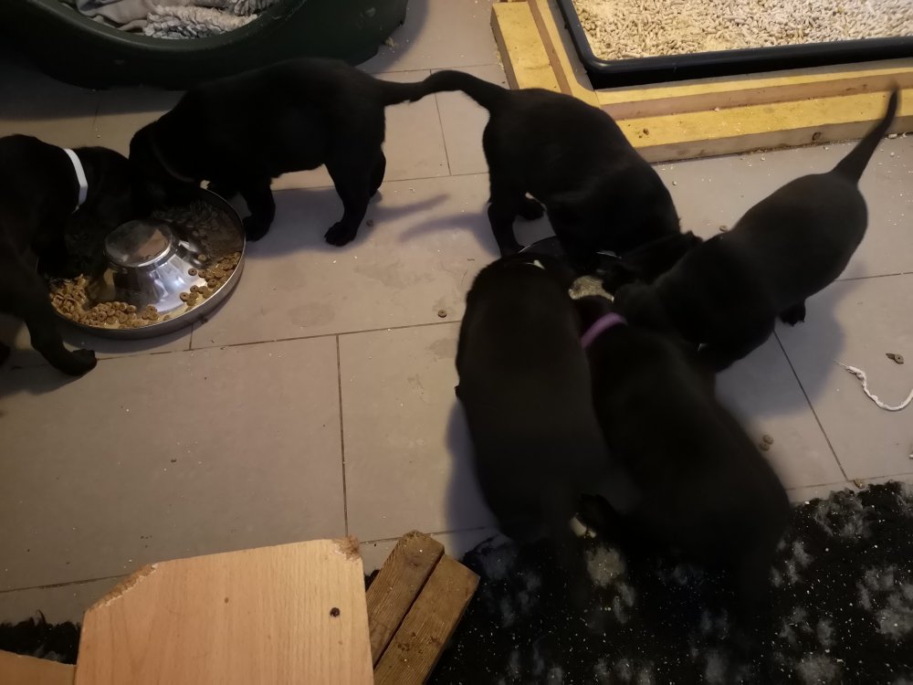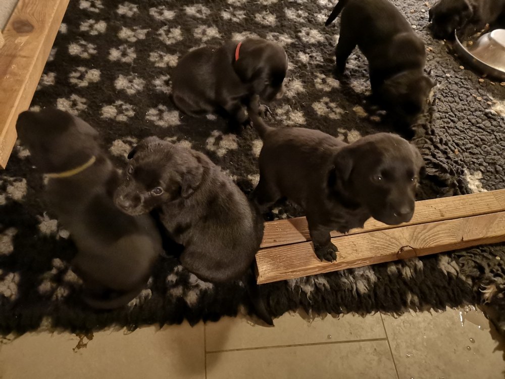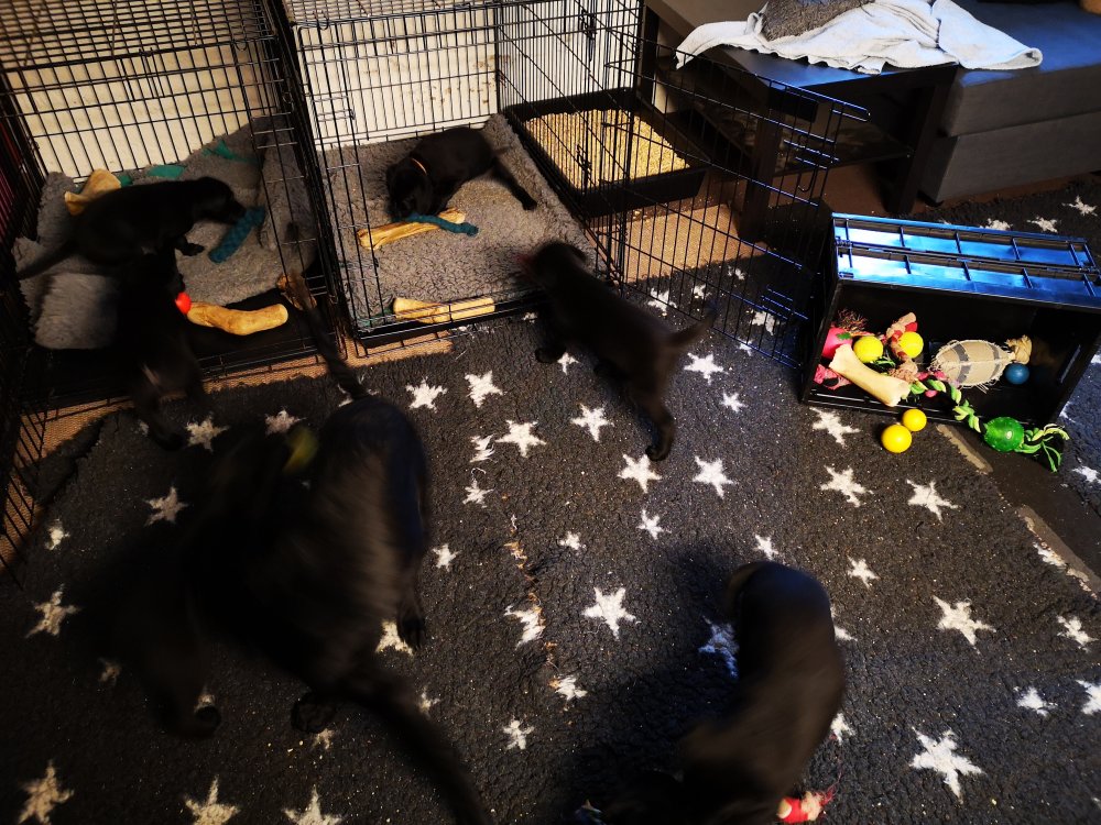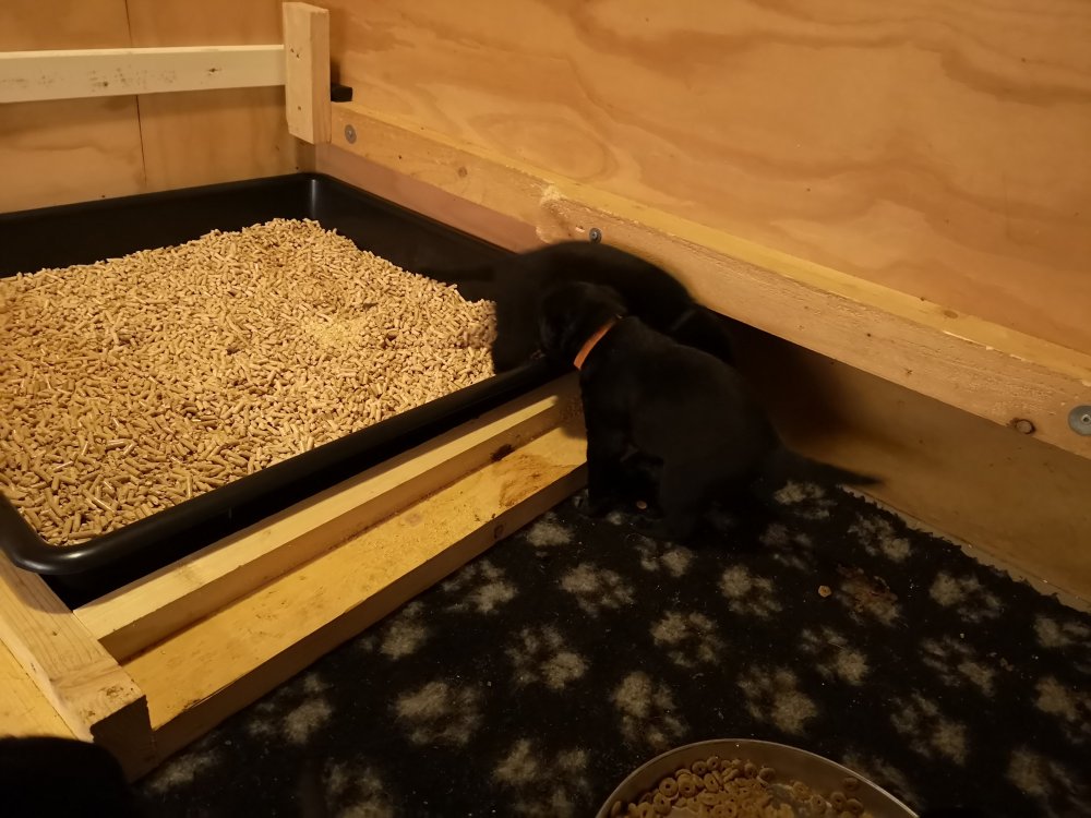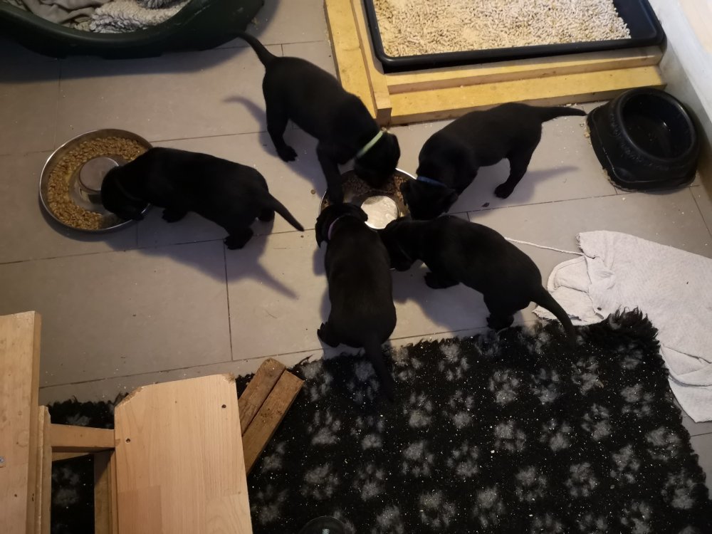Hvalpene er flyttet ud af hvalpekasse og hvalpetoilette er kommet ind, så nu har de hele rummet. Der er kommet mere liv i rummet og der bliver tumlet og prøvet kræfter med hinanden. De små hvalpetænder er kommet frem, så alt skal undersøges. De får nu fast føde opblødt i vand, og de er ved at lærer at de ikke må gå i maden.