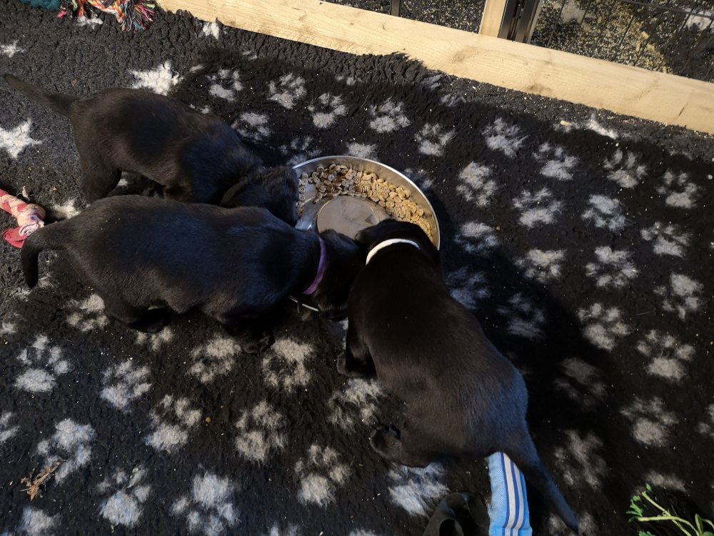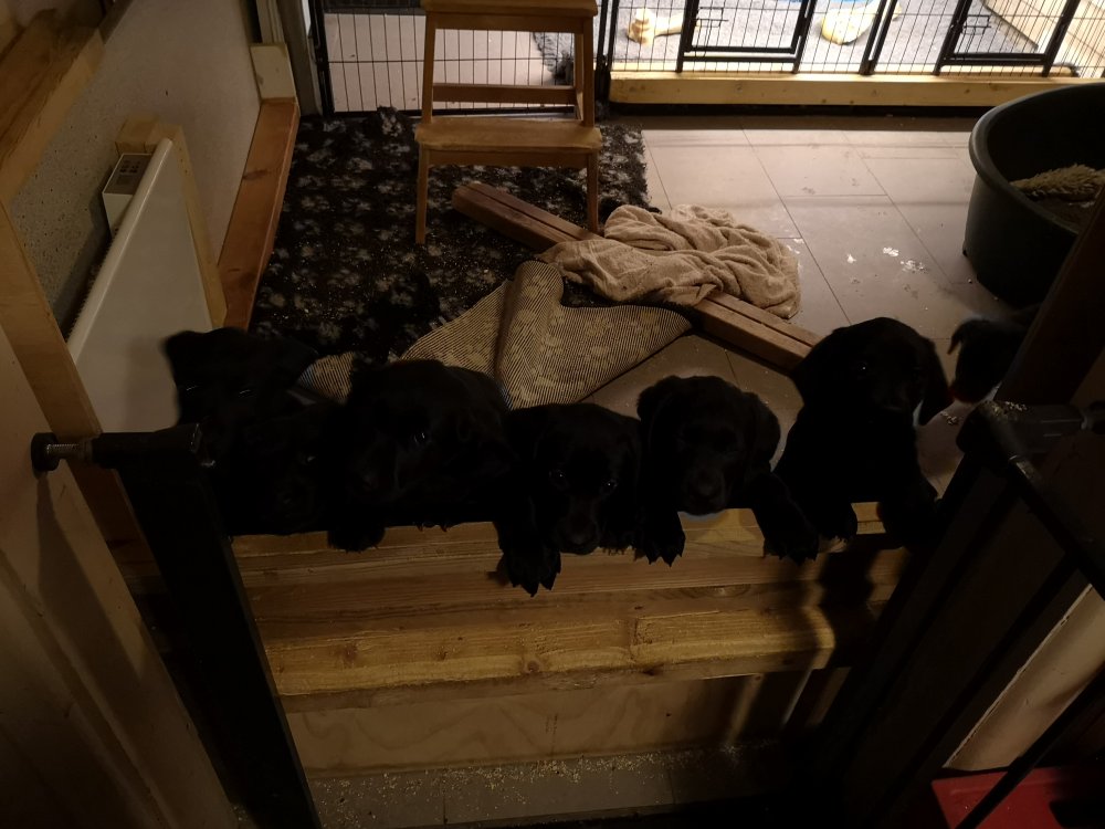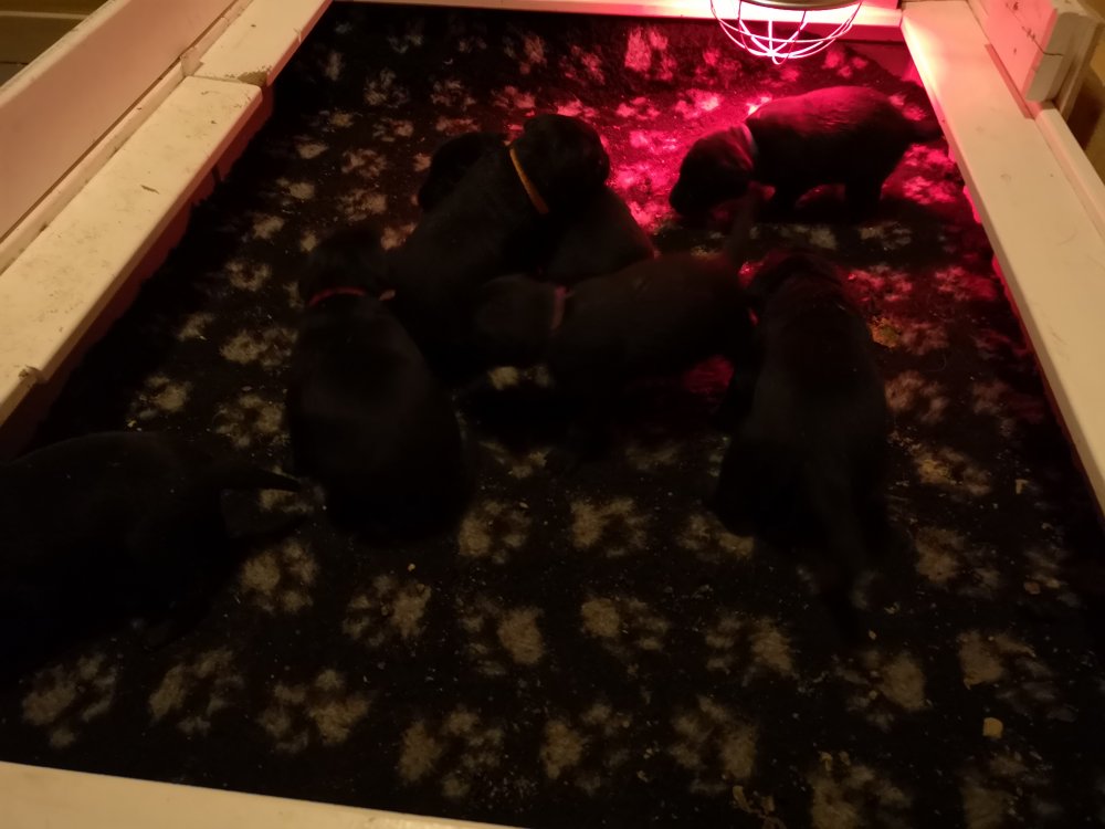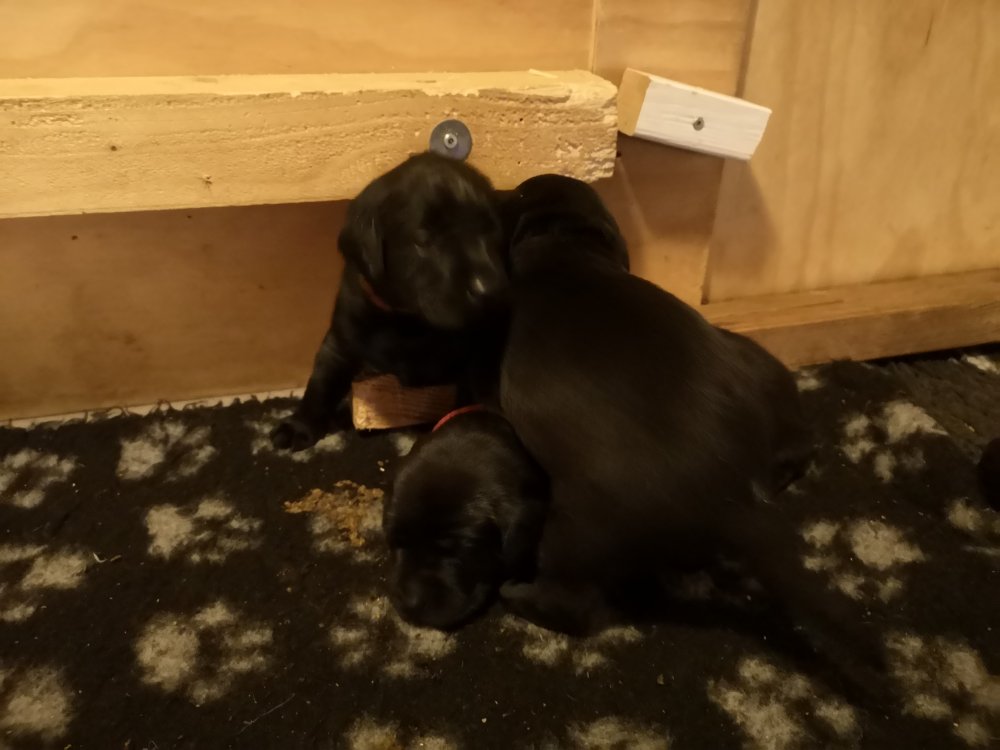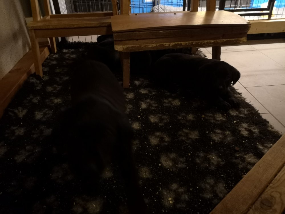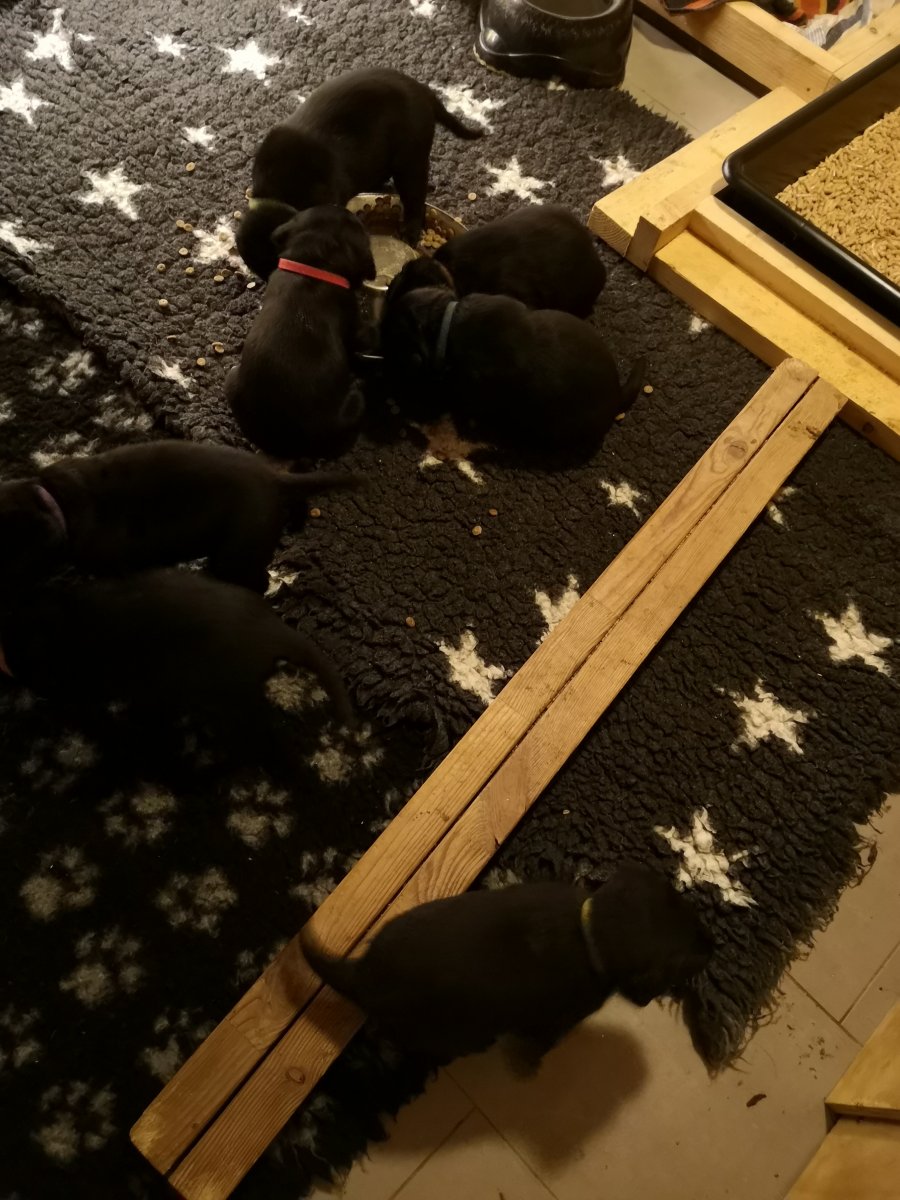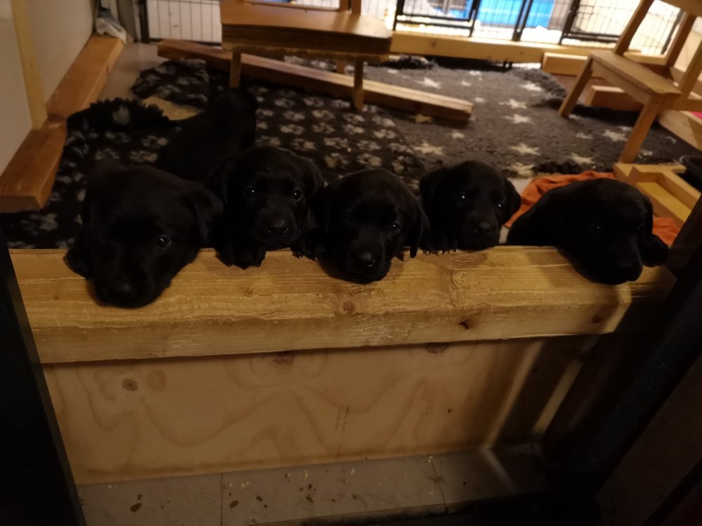 Hvalpene er flyttet ud af hvalpekasse og hvalpetoilette er kommet ind, så nu har de hele rummet. Der er kommet mere liv i rummet og der bliver tumlet og prøvet kræfter med hinanden. De små hvalpetænder er kommet frem, så alt skal undersøges. De får nu fast føde opblødt i vand, og de er ved at lærer at de ikke må gå i maden.