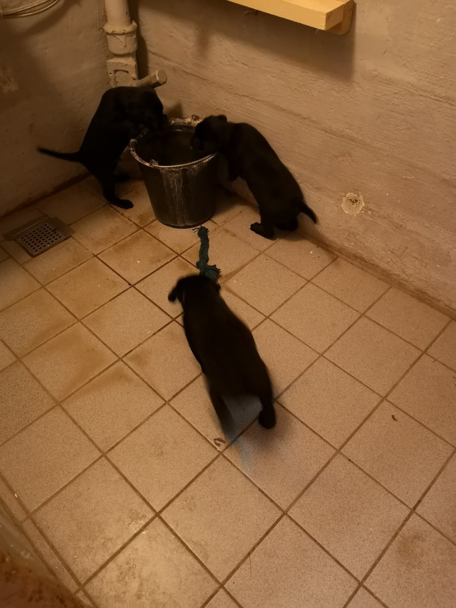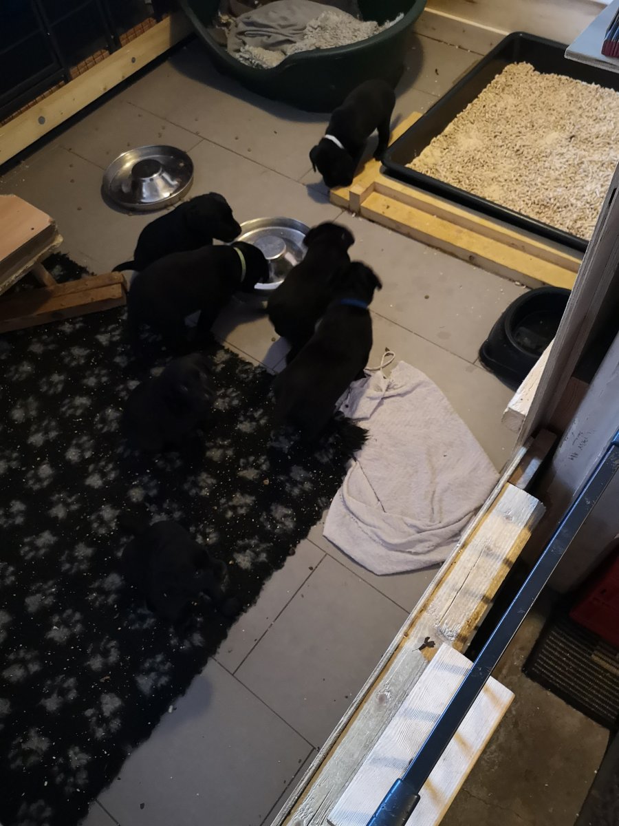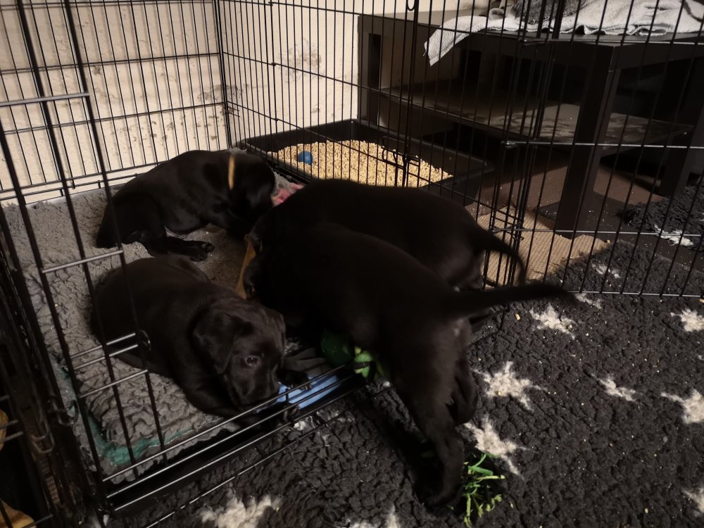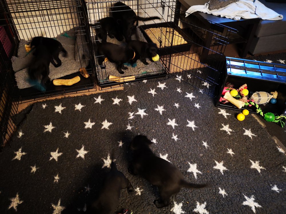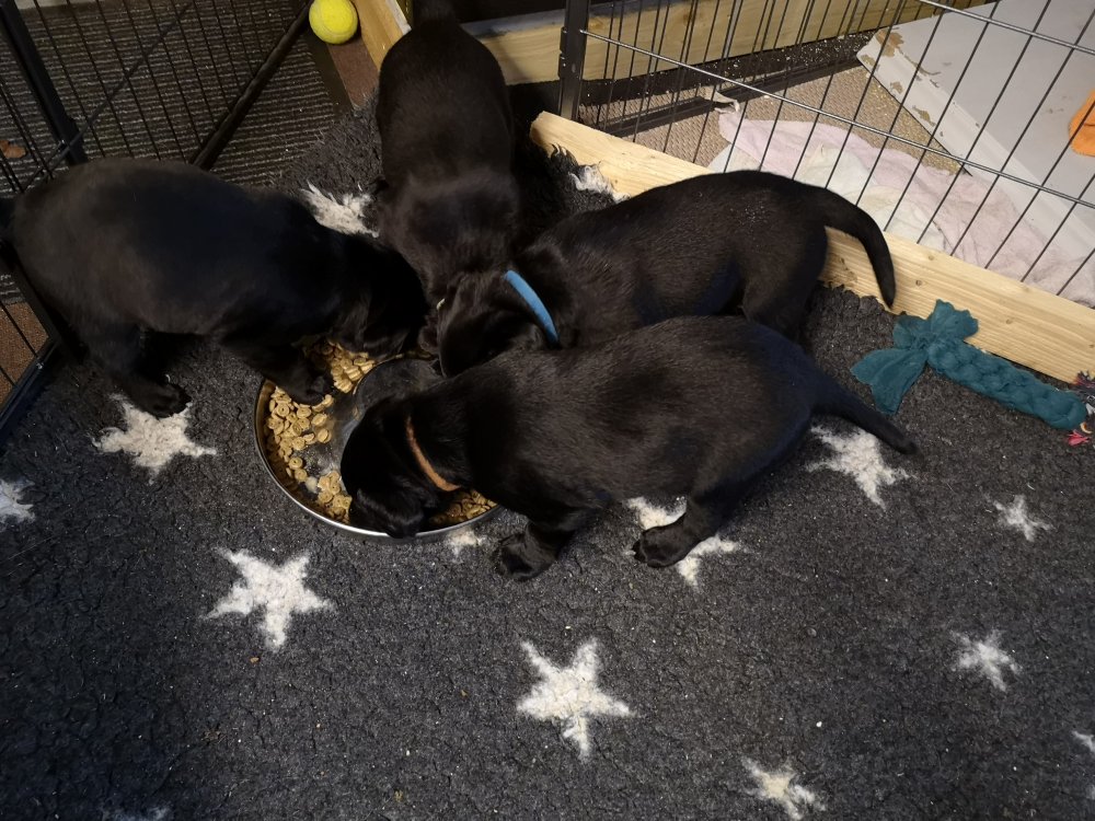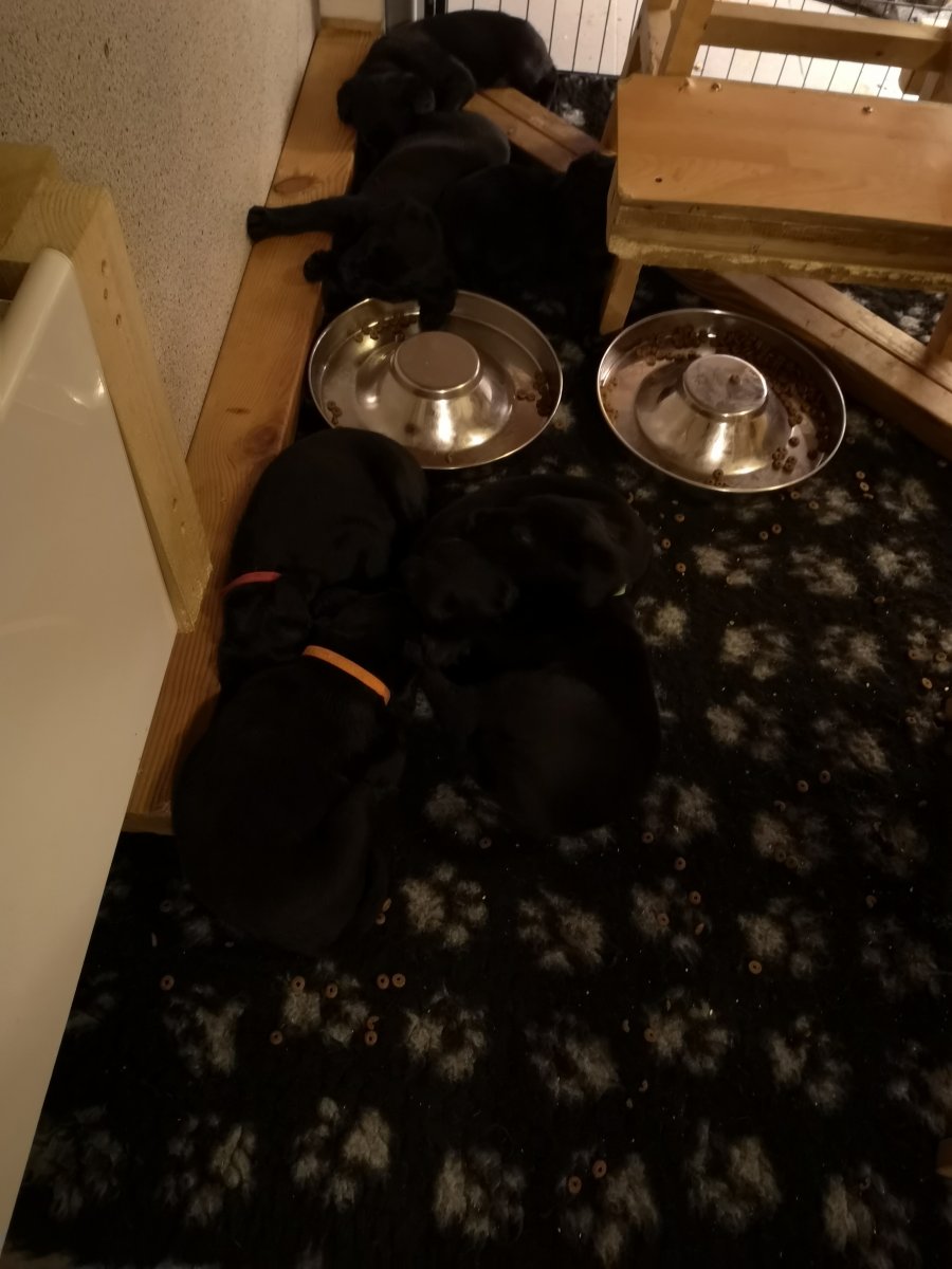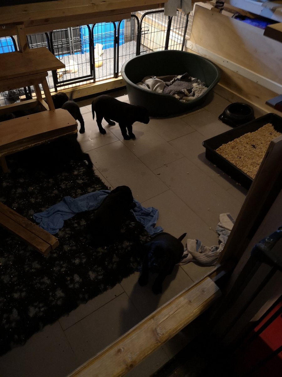Hvalpene er flyttet ud af hvalpekasse og hvalpetoilette er kommet ind, så nu har de hele rummet. Der er kommet mere liv i rummet og der bliver tumlet og prøvet kræfter med hinanden. De små hvalpetænder er kommet frem, så alt skal undersøges. De får nu fast føde opblødt i vand, og de er ved at lærer at de ikke må gå i maden.