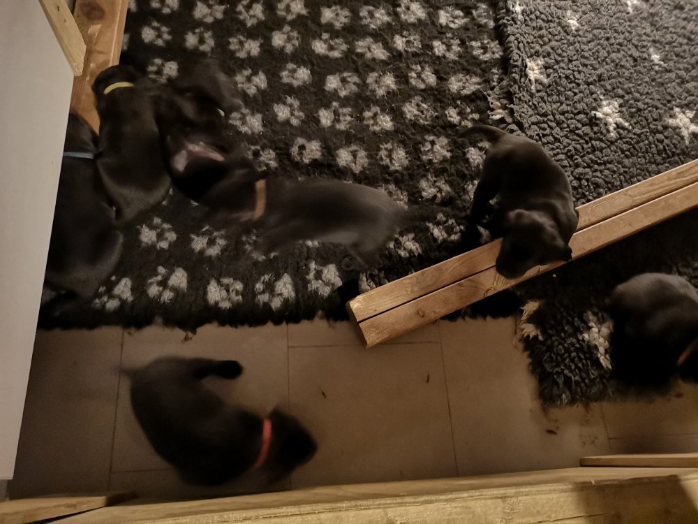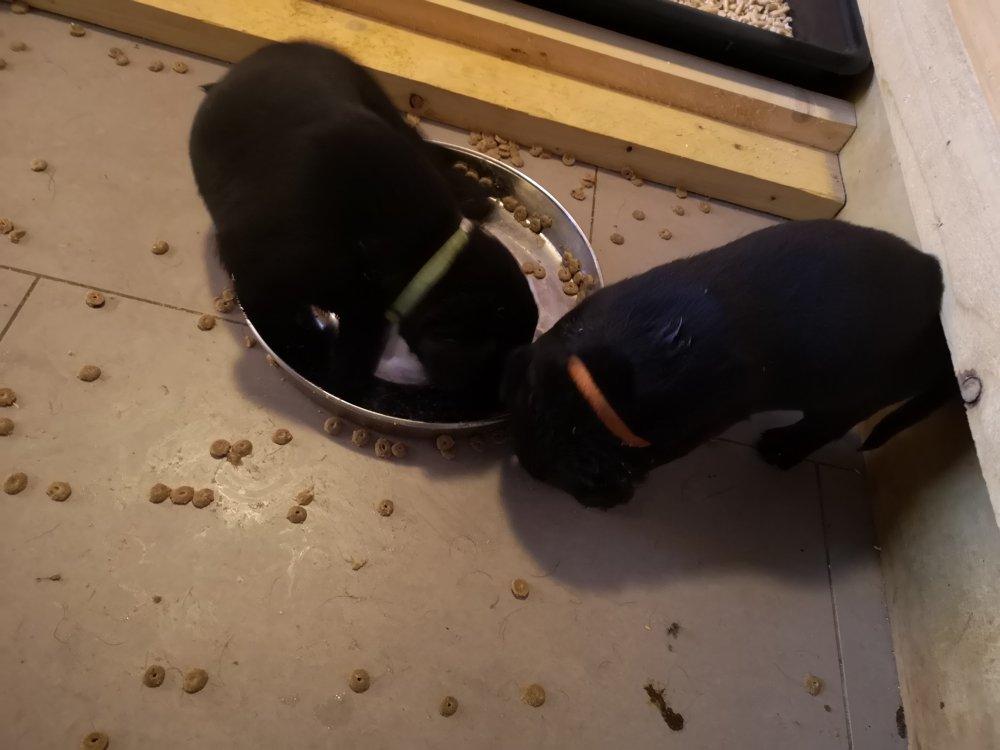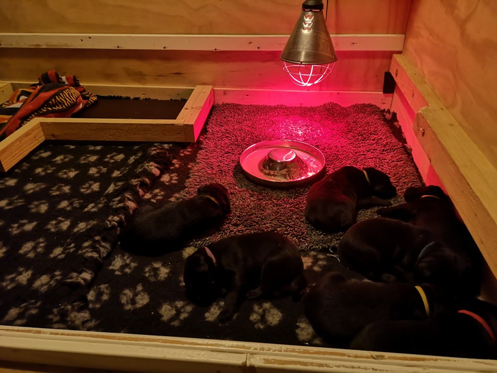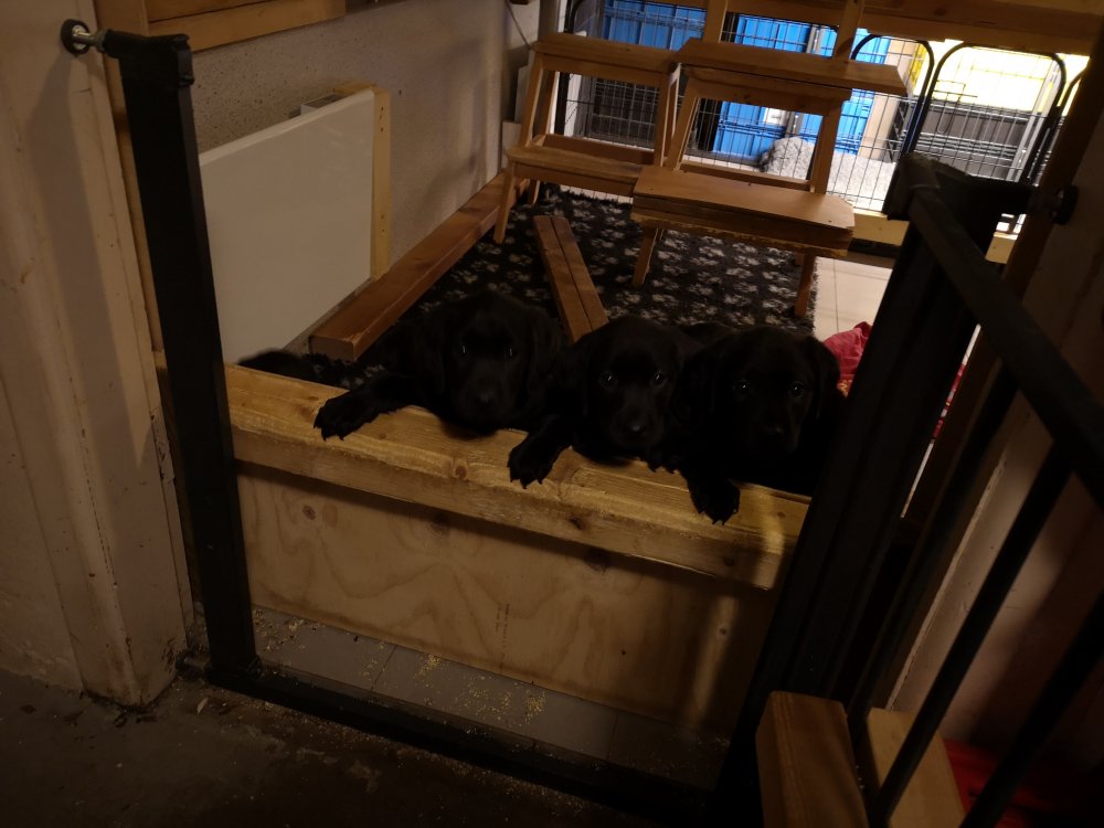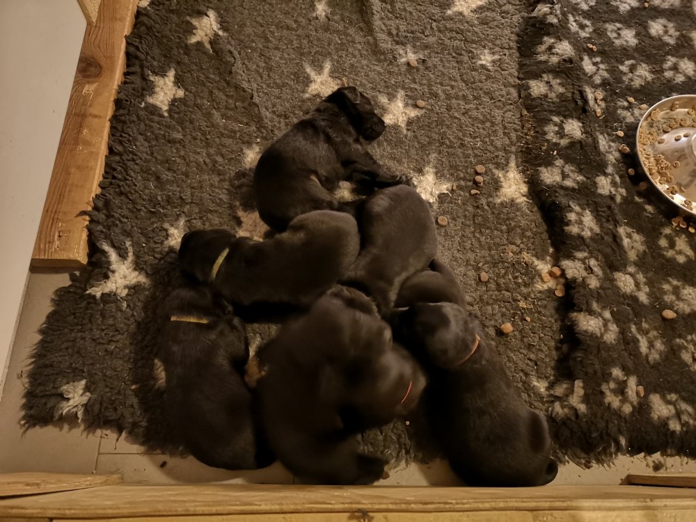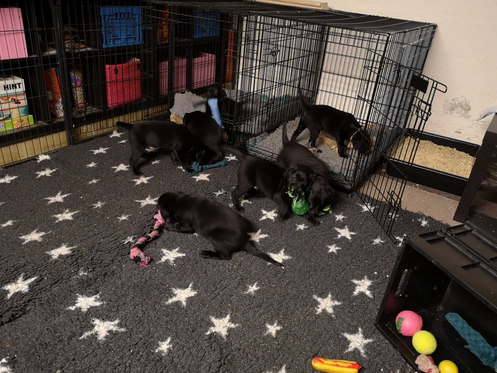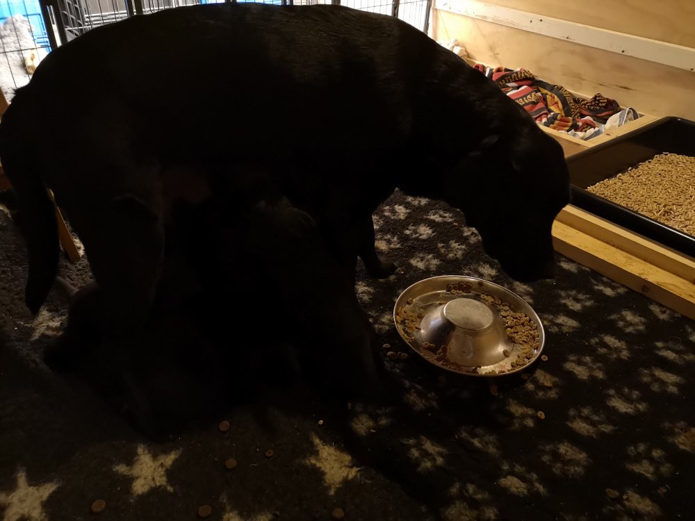 Hvalpene er flyttet ud af hvalpekasse og hvalpetoilette er kommet ind, så nu har de hele rummet. Der er kommet mere liv i rummet og der bliver tumlet og prøvet kræfter med hinanden. De små hvalpetænder er kommet frem, så alt skal undersøges. De får nu fast føde opblødt i vand, og de er ved at lærer at de ikke må gå i maden.