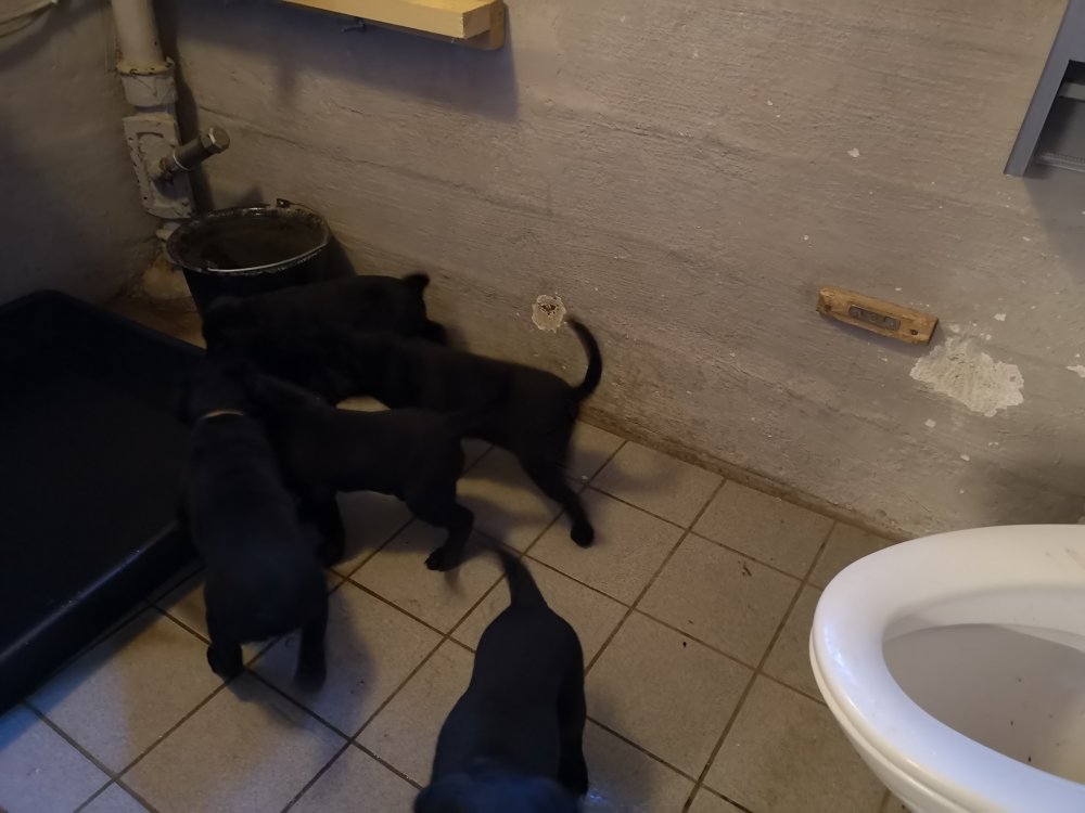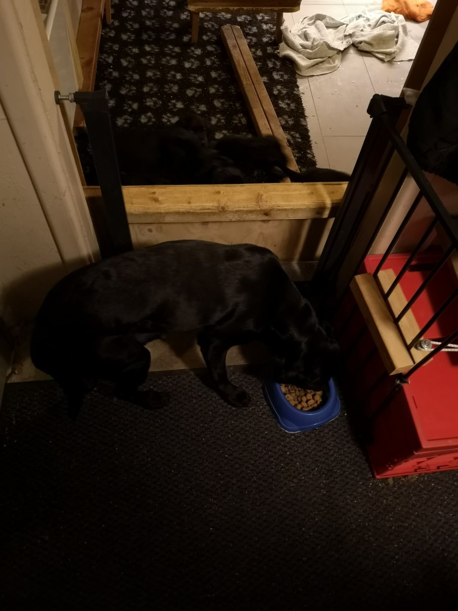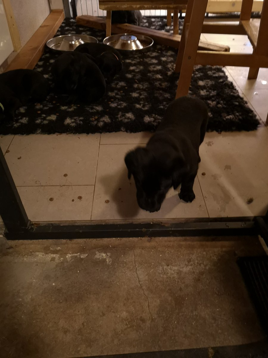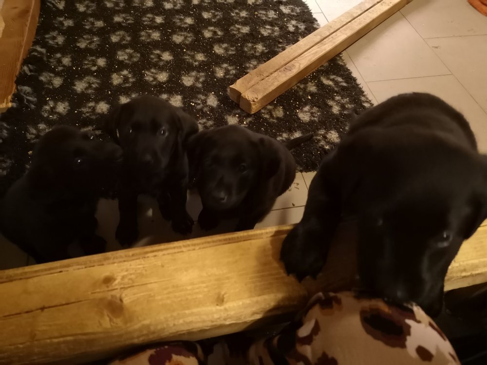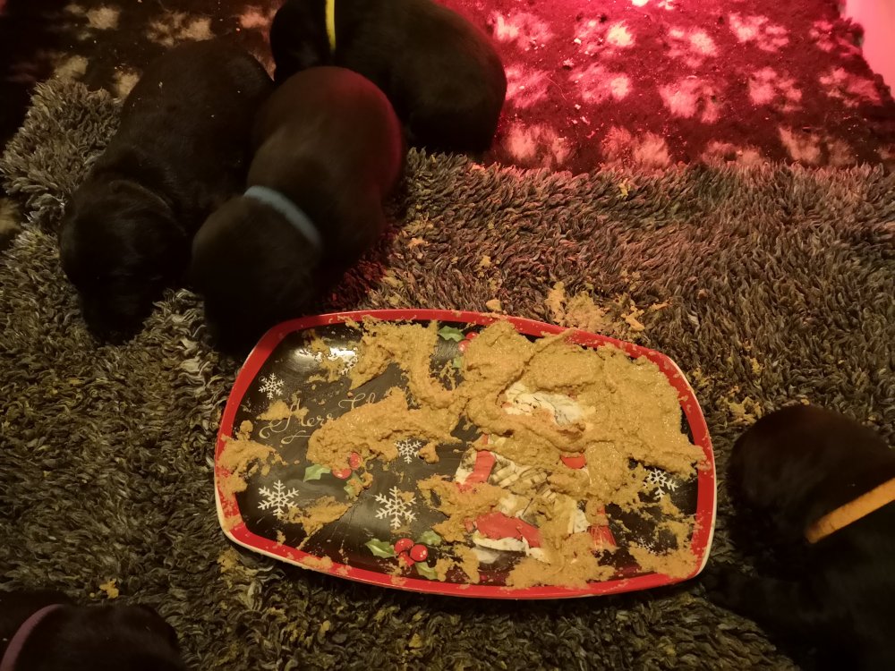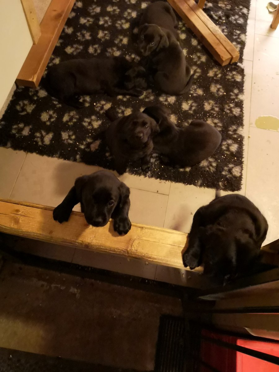 Hvalpene er flyttet ud af hvalpekasse og hvalpetoilette er kommet ind, så nu har de hele rummet. Der er kommet mere liv i rummet og der bliver tumlet og prøvet kræfter med hinanden. De små hvalpetænder er kommet frem, så alt skal undersøges. De får nu fast føde opblødt i vand, og de er ved at lærer at de ikke må gå i maden.