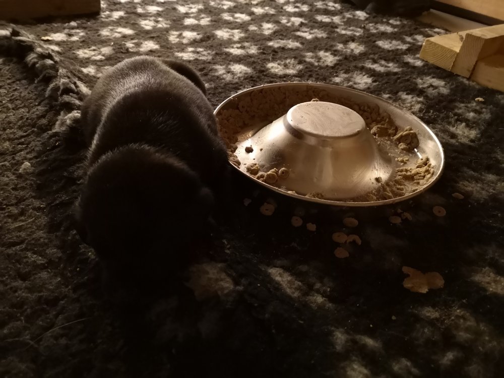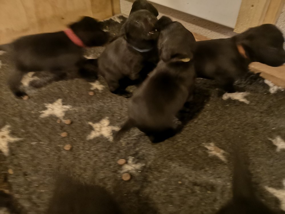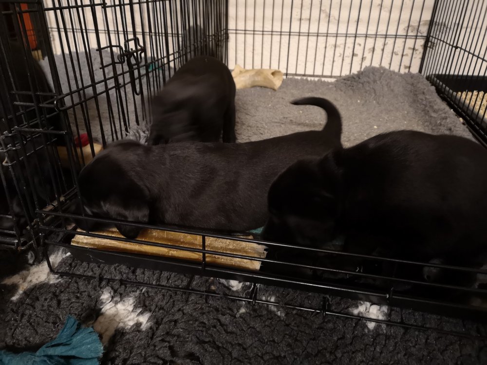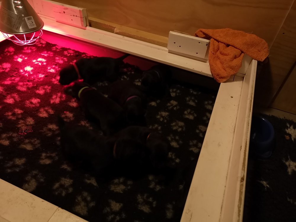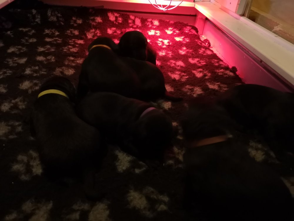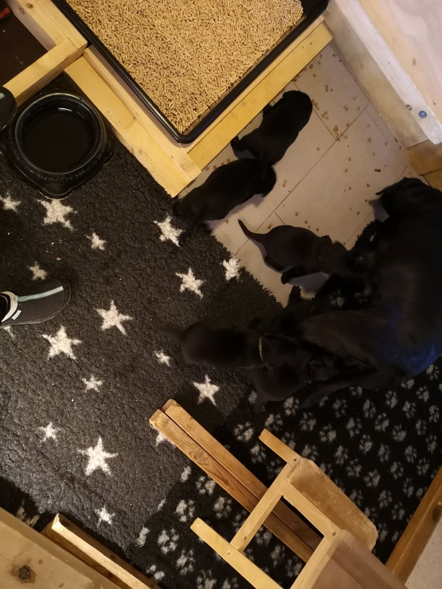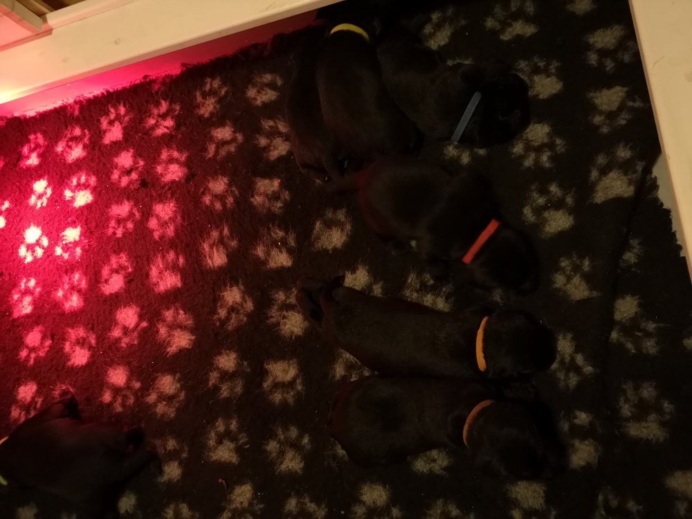 Hvalpene er flyttet ud af hvalpekasse og hvalpetoilette er kommet ind, så nu har de hele rummet. Der er kommet mere liv i rummet og der bliver tumlet og prøvet kræfter med hinanden. De små hvalpetænder er kommet frem, så alt skal undersøges. De får nu fast føde opblødt i vand, og de er ved at lærer at de ikke må gå i maden.