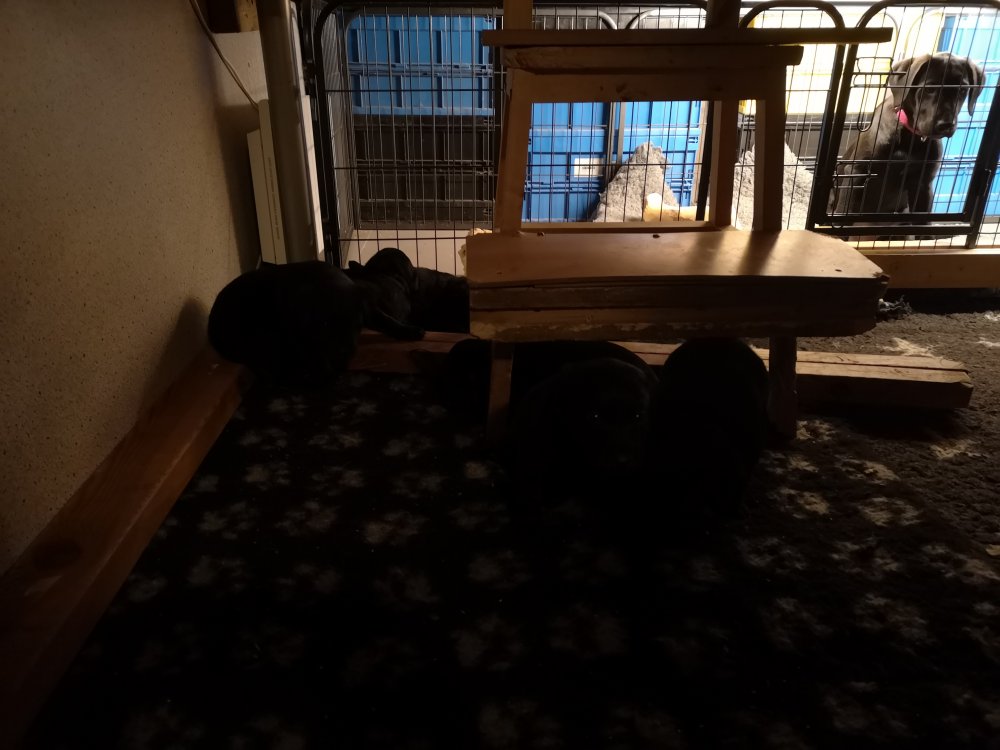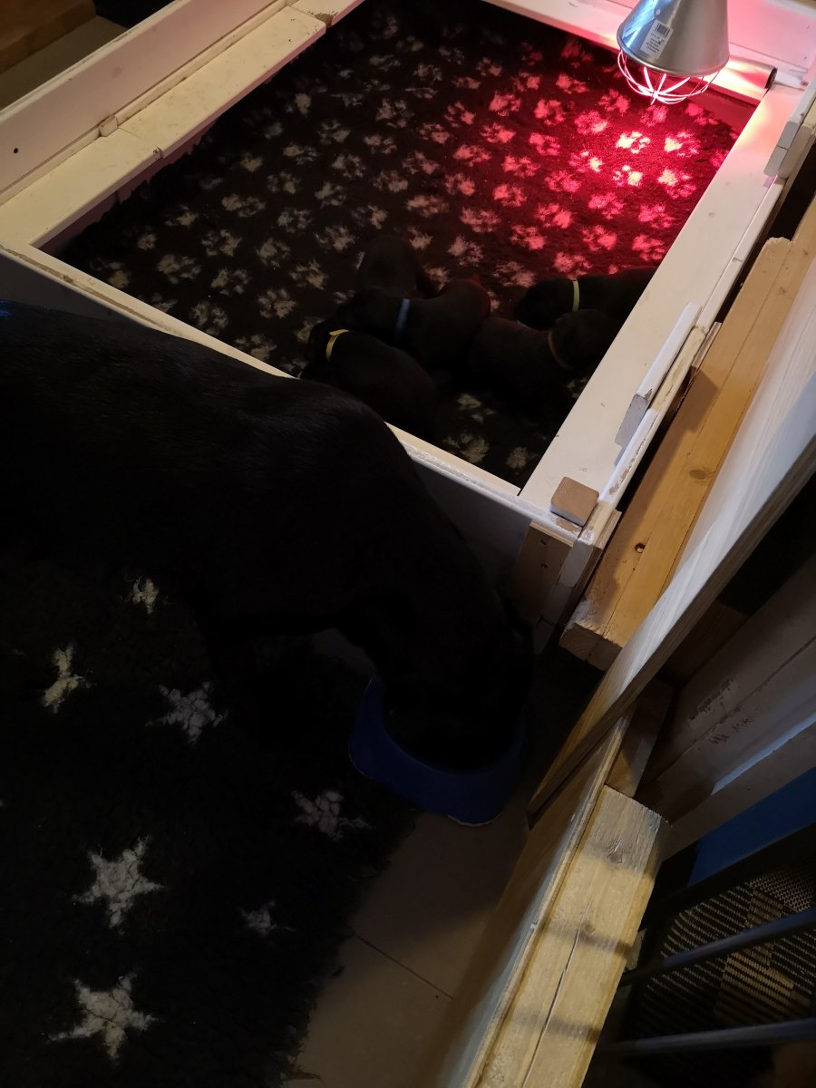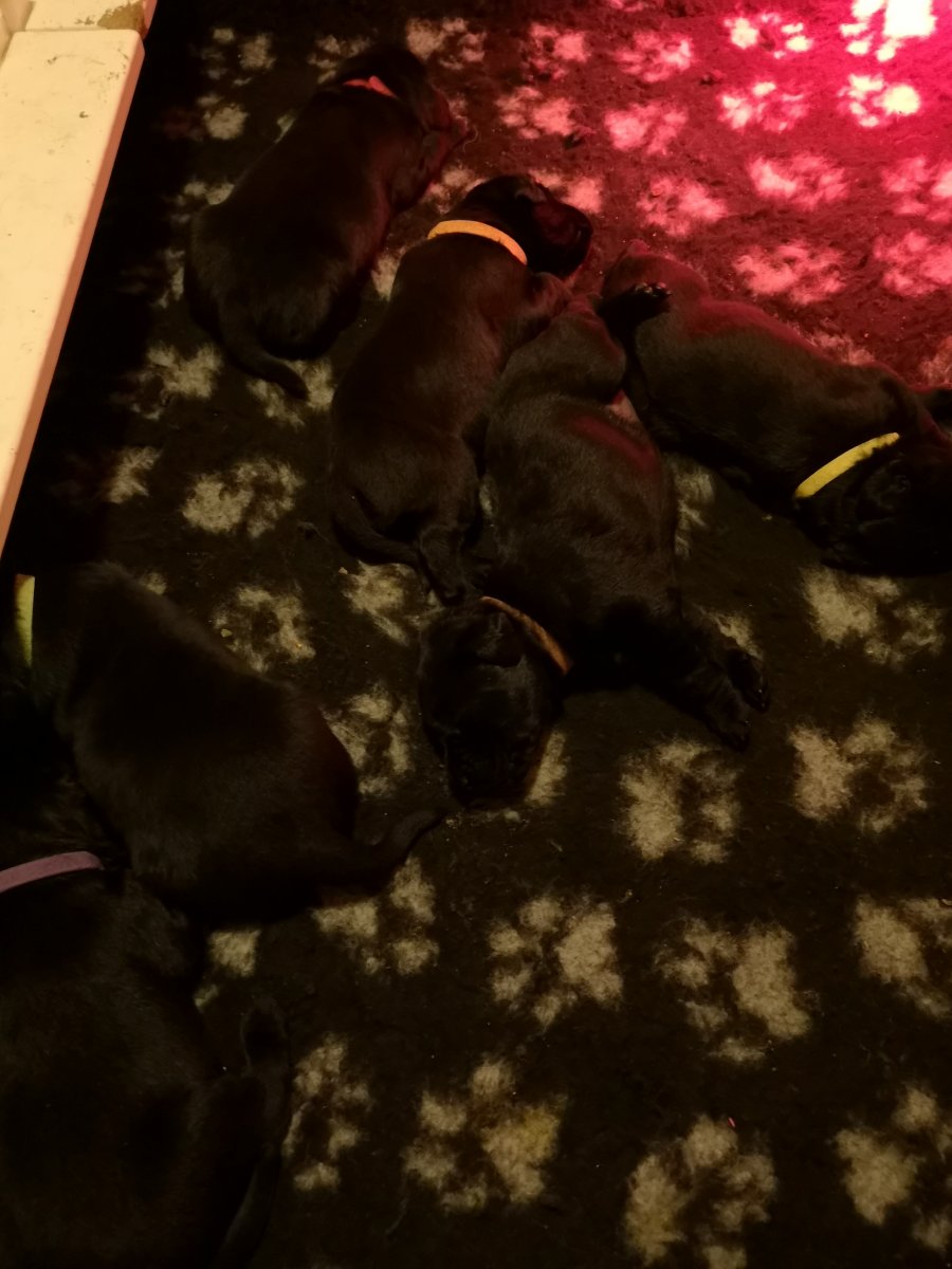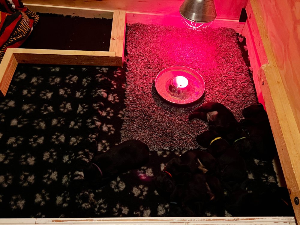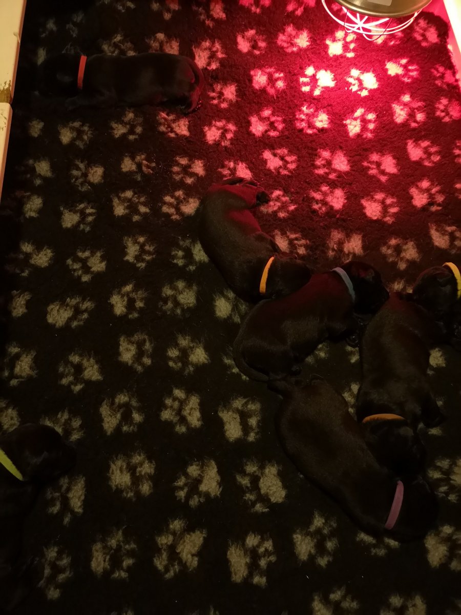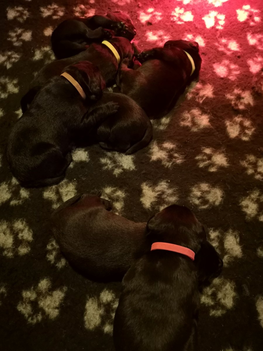 Hvalpene er flyttet ud af hvalpekasse og hvalpetoilette er kommet ind, så nu har de hele rummet. Der er kommet mere liv i rummet og der bliver tumlet og prøvet kræfter med hinanden. De små hvalpetænder er kommet frem, så alt skal undersøges. De får nu fast føde opblødt i vand, og de er ved at lærer at de ikke må gå i maden.