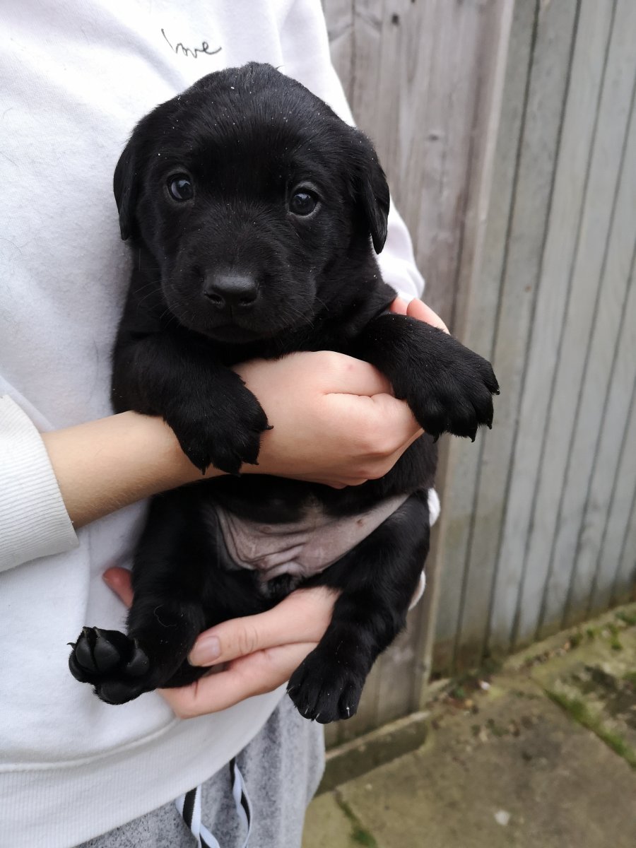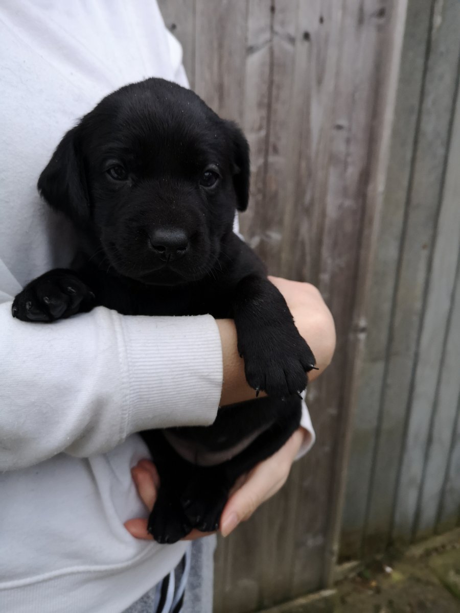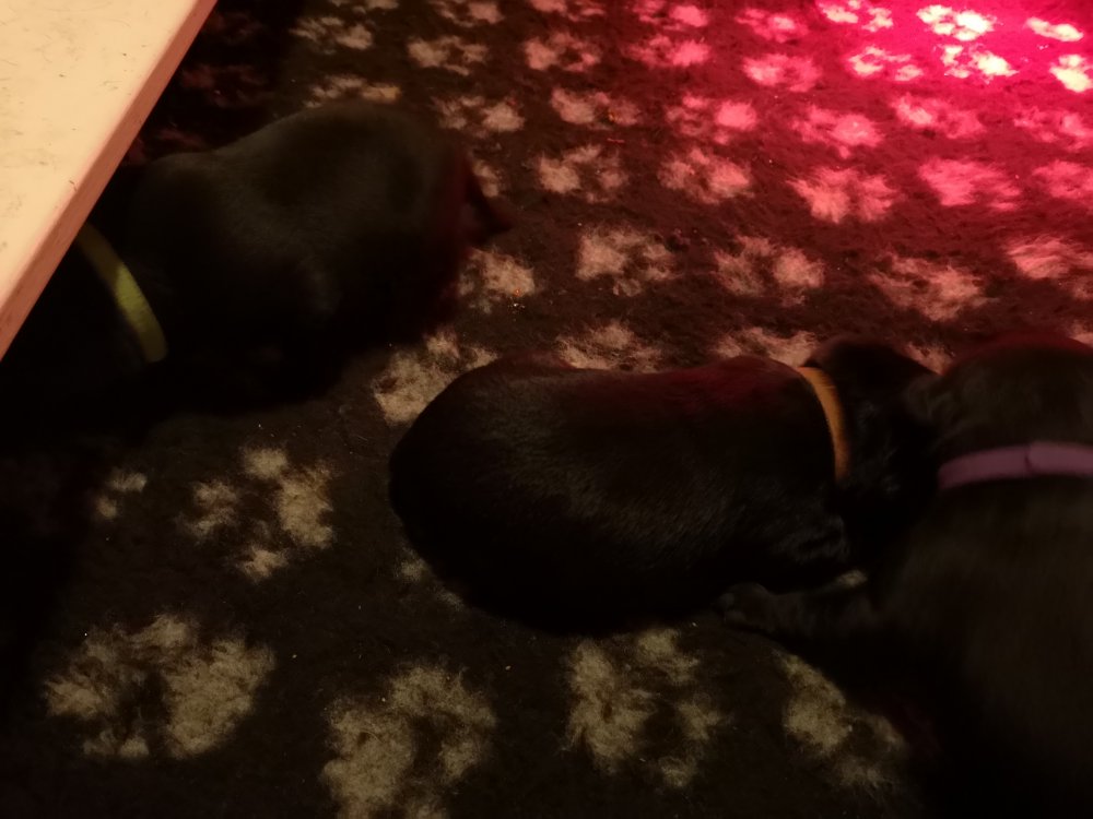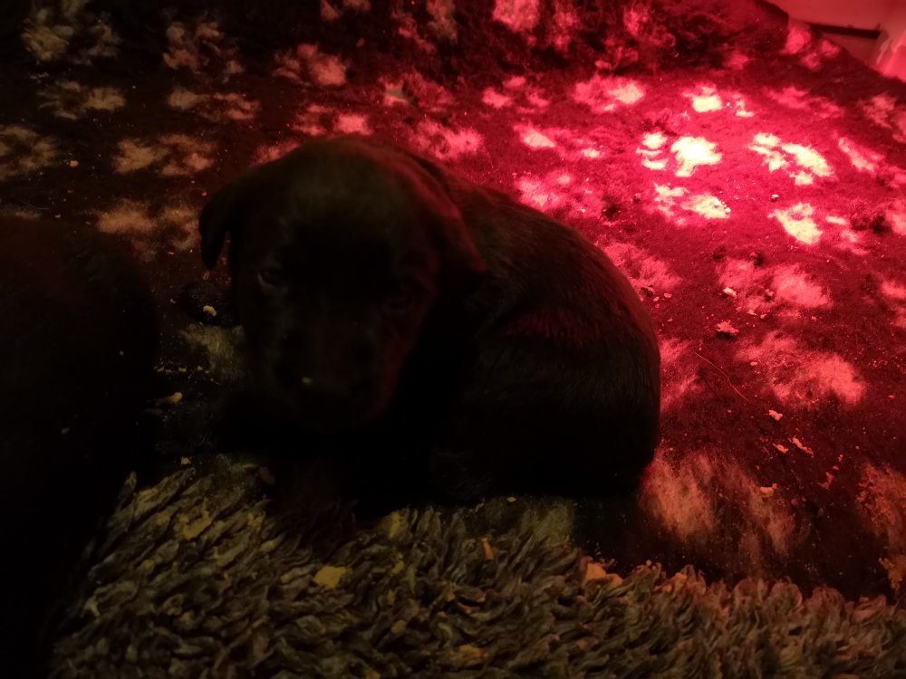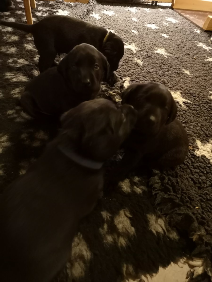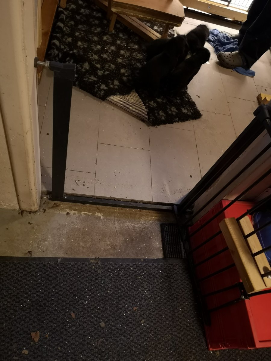 Hvalpene er flyttet ud af hvalpekasse og hvalpetoilette er kommet ind, så nu har de hele rummet. Der er kommet mere liv i rummet og der bliver tumlet og prøvet kræfter med hinanden. De små hvalpetænder er kommet frem, så alt skal undersøges. De får nu fast føde opblødt i vand, og de er ved at lærer at de ikke må gå i maden.