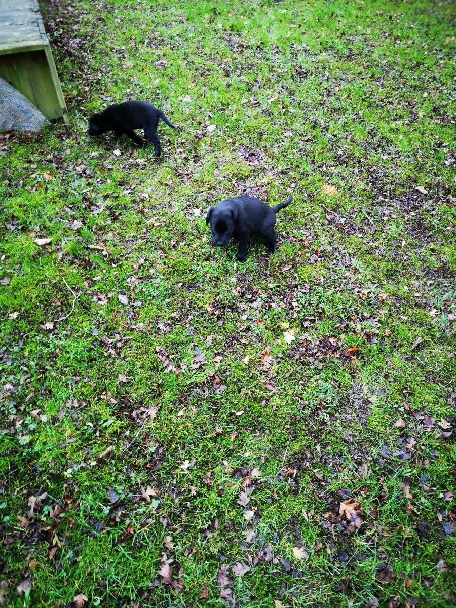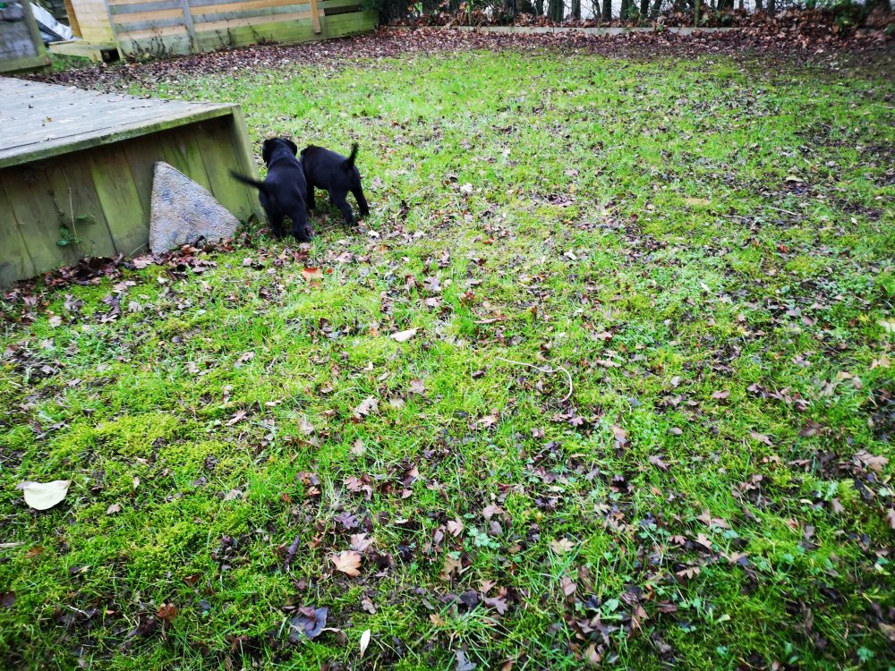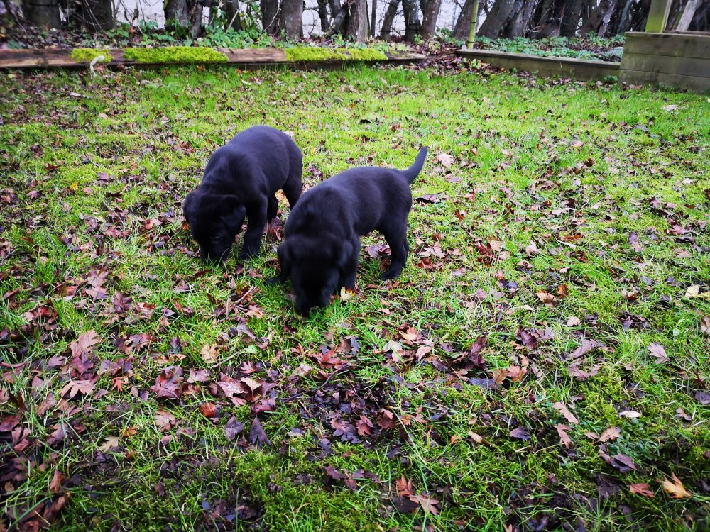 Hvalpene har næsten hverdag været udenfor deres hvalperum enten i "hvalpe børnehaven" eller udenfor når vejret har været til det, nogle gang 2 og 2, det er nemmer for os at styre, for ALT bliver samlet op når de skal på nye oplevelser. De bliver mere og mere modige, alt bliver undersøgt og de løber lidt længere væk fra os, når vi fløjter/kalder kommer de rigtig glade hen til os igen. Når de er i "hvalpebørnehaven", starter de ofte med at finde noget de kan have i munden også komme de stolte hen til os og viser det som små jagthunde. Bagefter går de på opdagelse løber frem og tilbage. prøver kræfter med sig selv og hinanden. De er også blevet svære at fotografer, for der hele tiden gang i dem.Hvalpene vil rigtig gerne snakke med os når vi kommer ned til dem og de komme ofte hen til lågen i hvalperummet og gør opmærksom på at de er i rummet, dog ikke når vi siger godnat, så er der ro i rummet indtil næste morgen. Alle hvalpene har haft besøg af deres kommende familier