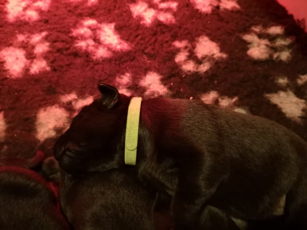 Hvalpene er i denne uge blevet chippet og har ikke længe deres halsbånd på, da det ikke holder i velcroen. Der er ikke meget forskel på dem, så er det godt de er blevet chippet.