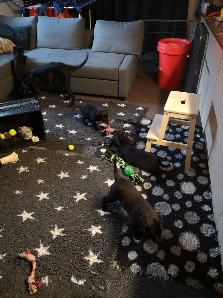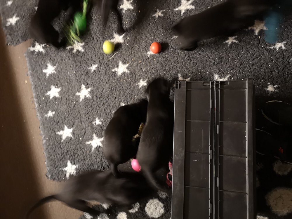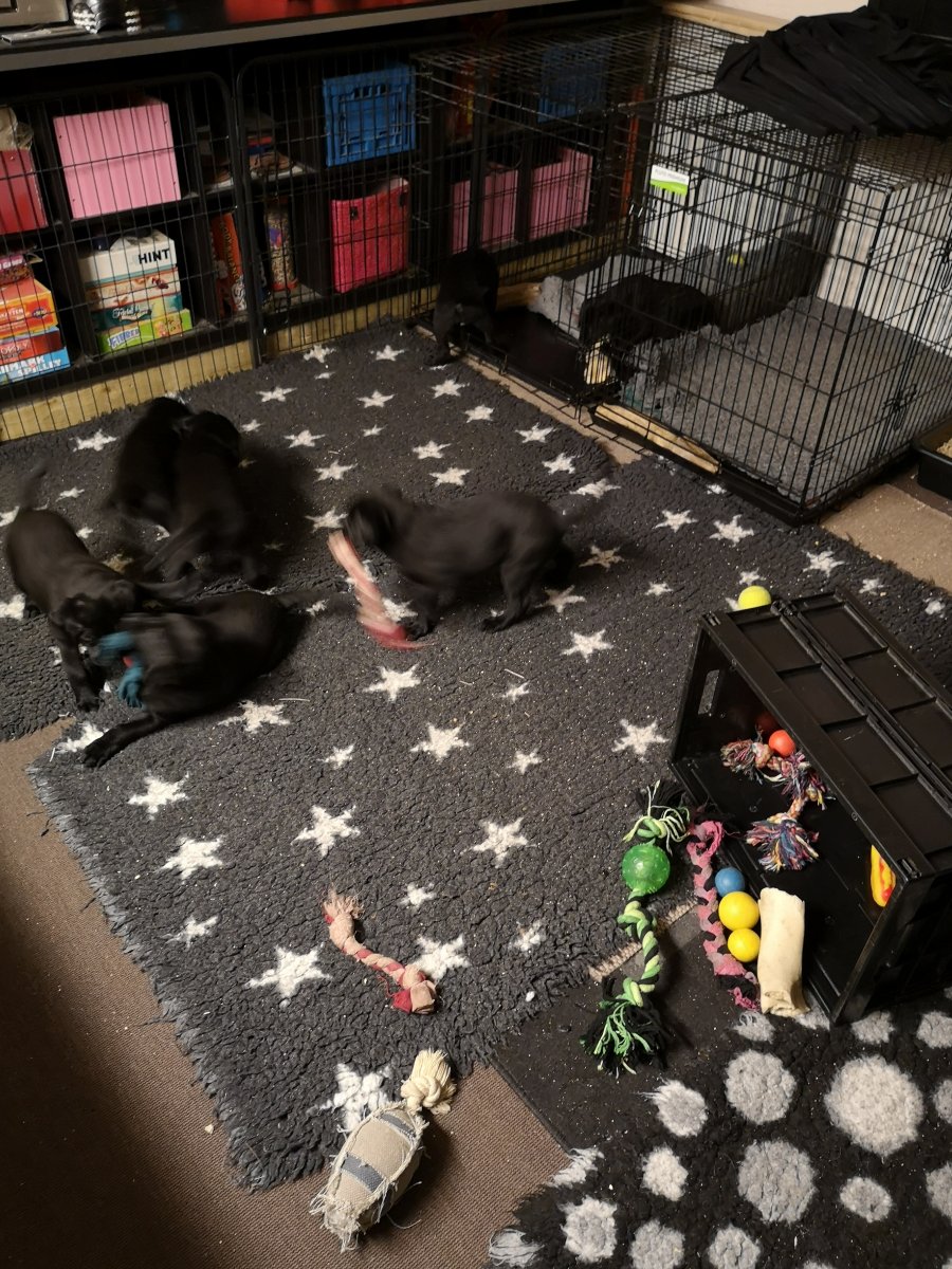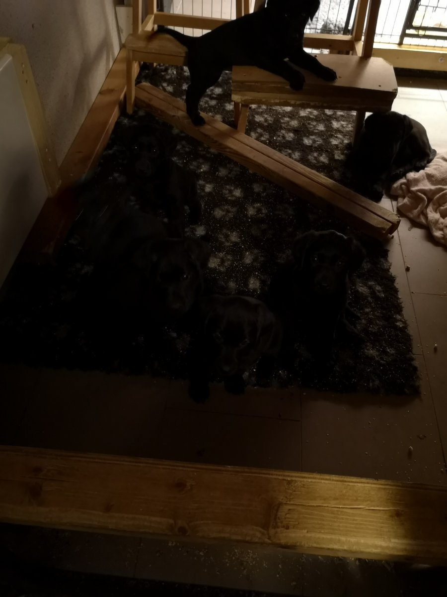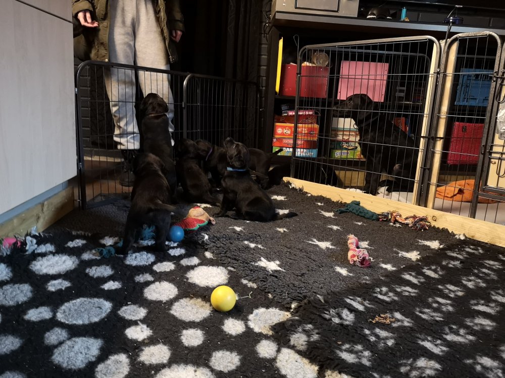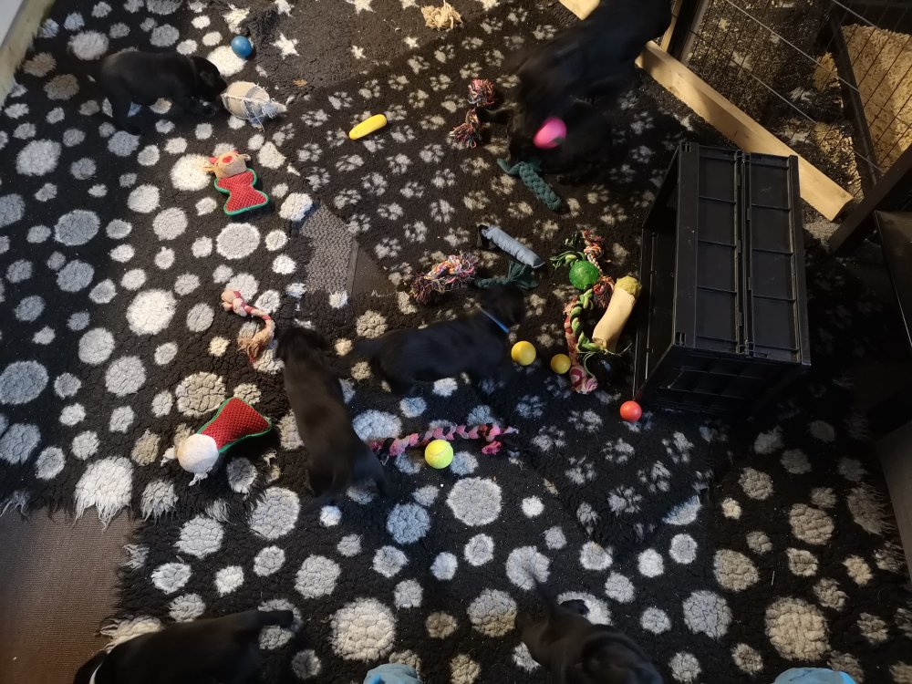 Det er den sidste uge i hvalpekassen, hvor der har været rigtig gang i rummet der er blevet tumlet, leget m.m. Flokken hygger sig i rummet,men vil rigtig gerne ud og gå på opdagelse og prøve nye grænser. De har været heldig at være ude i sne hvilket de synes var rigtig sjovt. Når vi kommer ind rummet er der med det samme og vil meget gerne snakkes med.De er alle klar og nysgerrig til at komme ud i verden ud på nye oplevelser i deres nye familier.