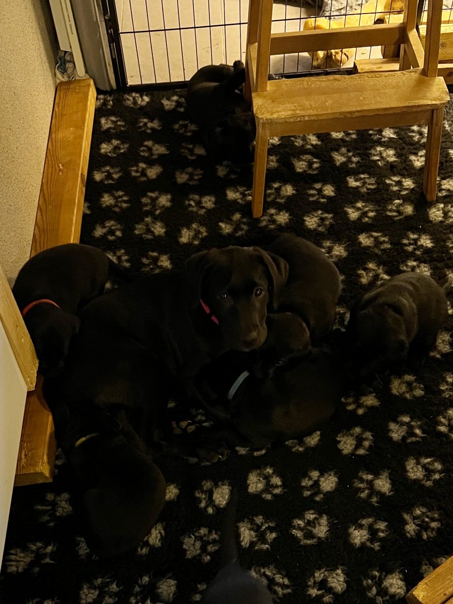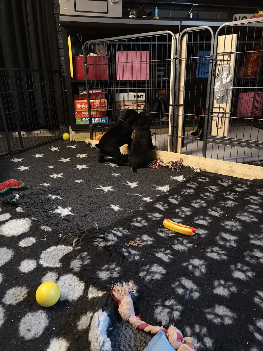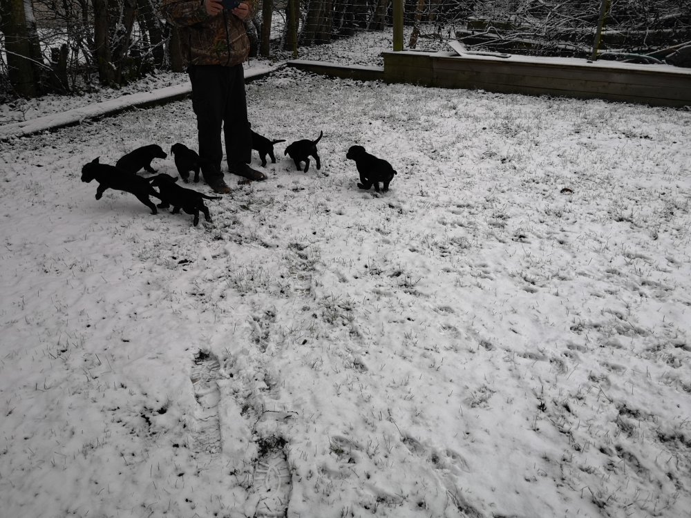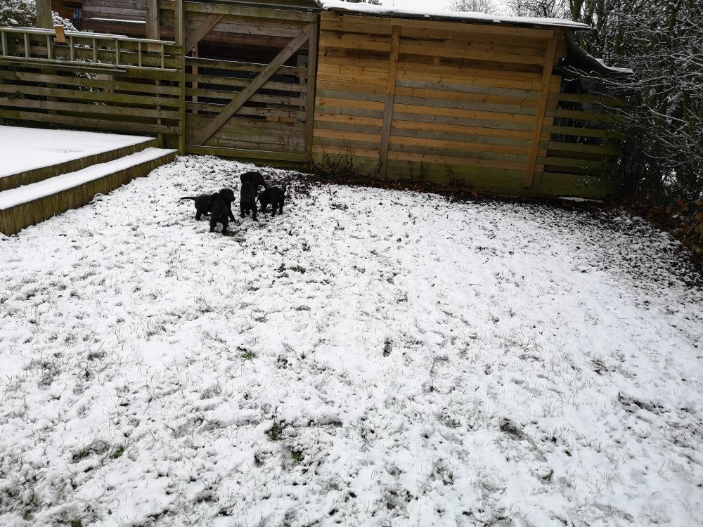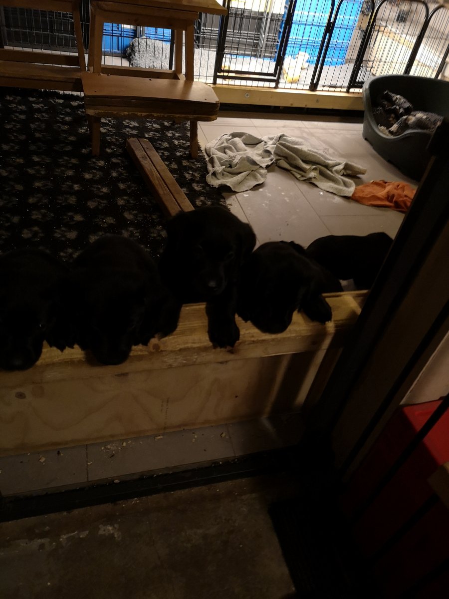 Det er den sidste uge i hvalpekassen, hvor der har været rigtig gang i rummet der er blevet tumlet, leget m.m. Flokken hygger sig i rummet,men vil rigtig gerne ud og gå på opdagelse og prøve nye grænser. De har været heldig at være ude i sne hvilket de synes var rigtig sjovt. Når vi kommer ind rummet er der med det samme og vil meget gerne snakkes med.De er alle klar og nysgerrig til at komme ud i verden ud på nye oplevelser i deres nye familier.