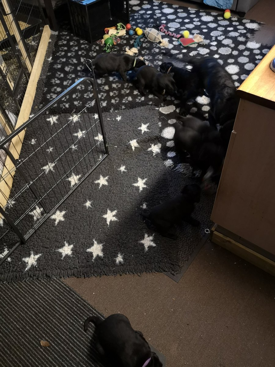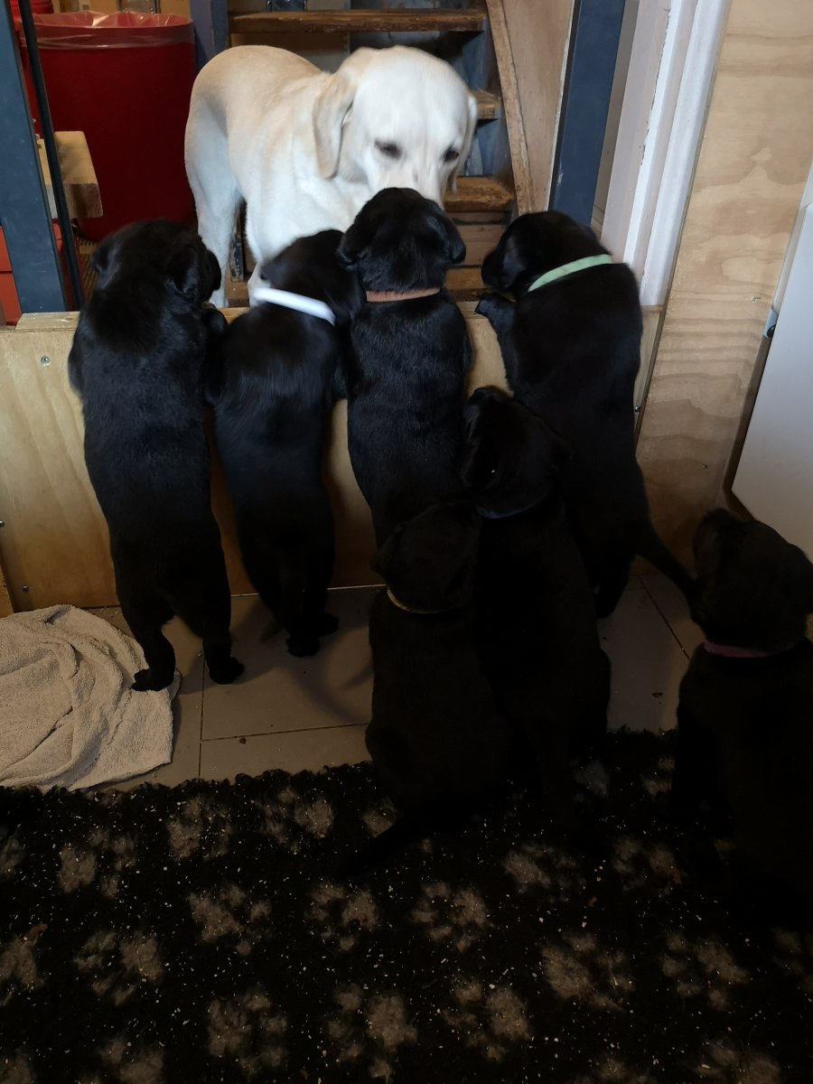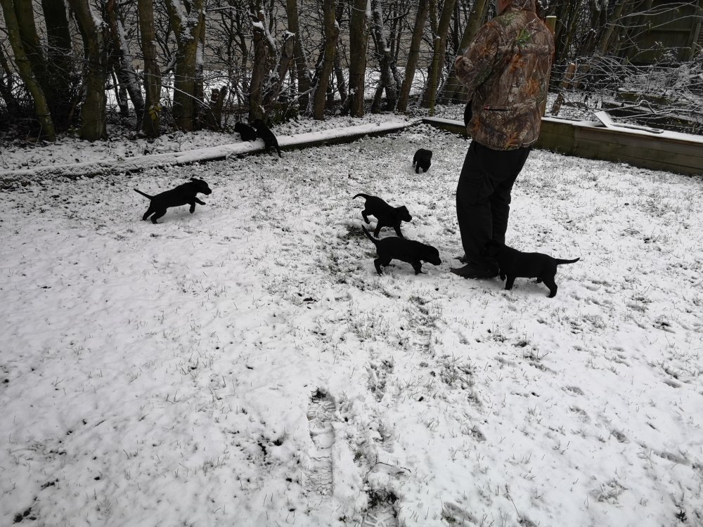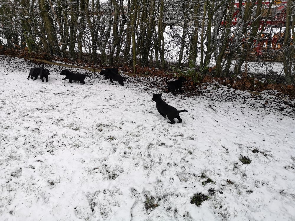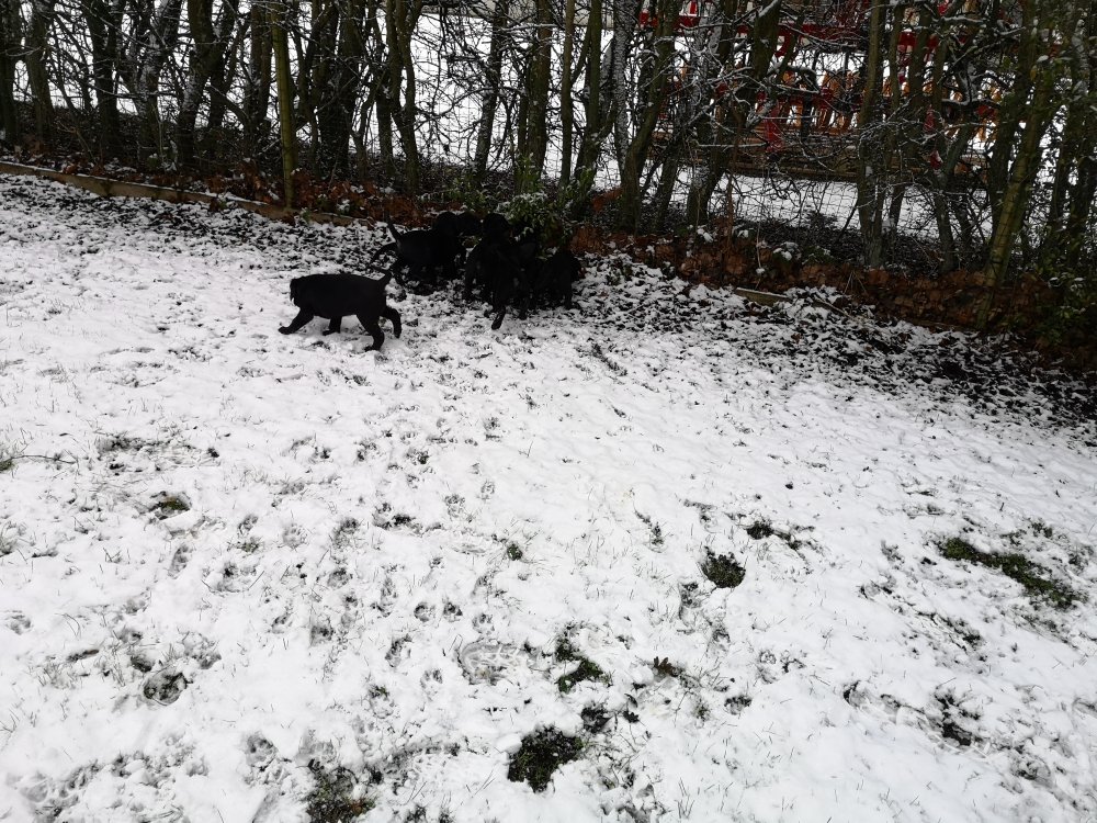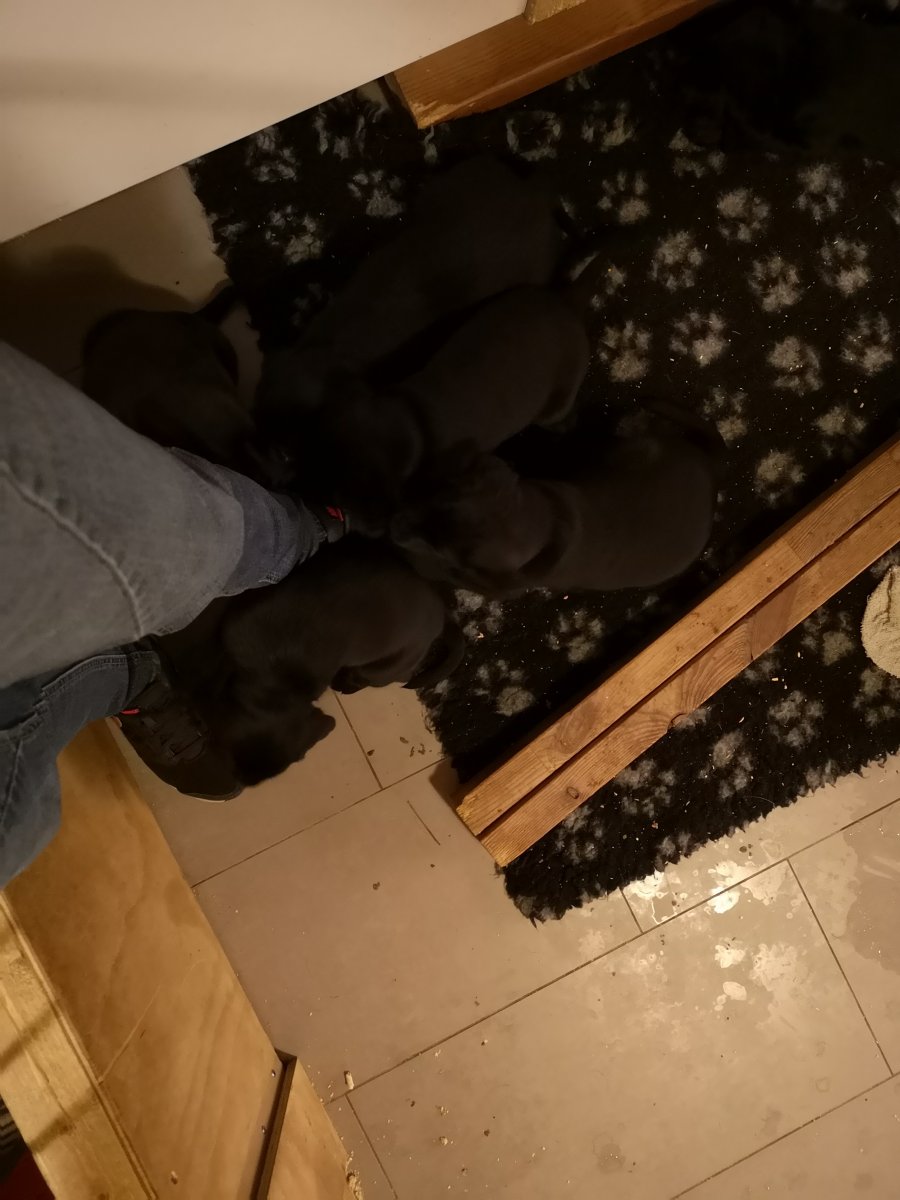 Det er den sidste uge i hvalpekassen, hvor der har været rigtig gang i rummet der er blevet tumlet, leget m.m. Flokken hygger sig i rummet,men vil rigtig gerne ud og gå på opdagelse og prøve nye grænser. De har været heldig at være ude i sne hvilket de synes var rigtig sjovt. Når vi kommer ind rummet er der med det samme og vil meget gerne snakkes med.De er alle klar og nysgerrig til at komme ud i verden ud på nye oplevelser i deres nye familier.