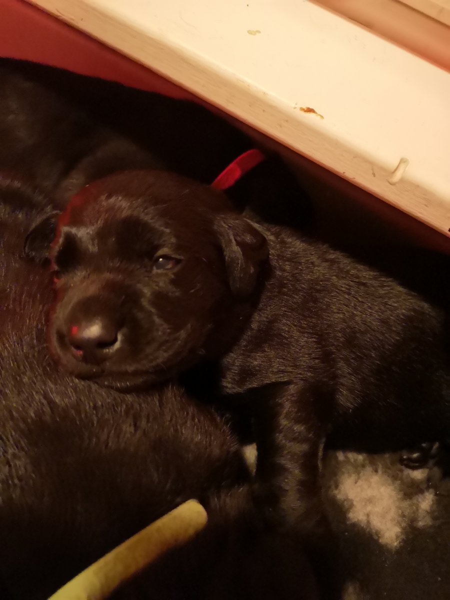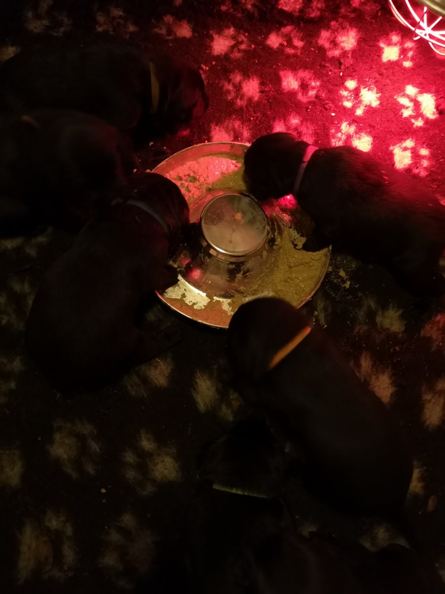 De har alle fået øjne og begyndt at bevæge sig rundt i kassen næsten som rigtig små hunde. De har også opdaget de andre hvalpe i kasse, så de er begyndt at "slås" med hinanden. De prøver også deres lyde og især når de gerne vil have mad fra Nata. De er begyndt at få opblødt hvalpefoder, som de alle spiser på hver deres forskellige måder ofte midt i maden, så de er ikke så pæne efter der har spist. Nata er god til at komme og gøre dem fine igen også får de også lidt fra Nata´s mælkebar