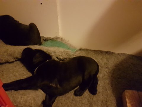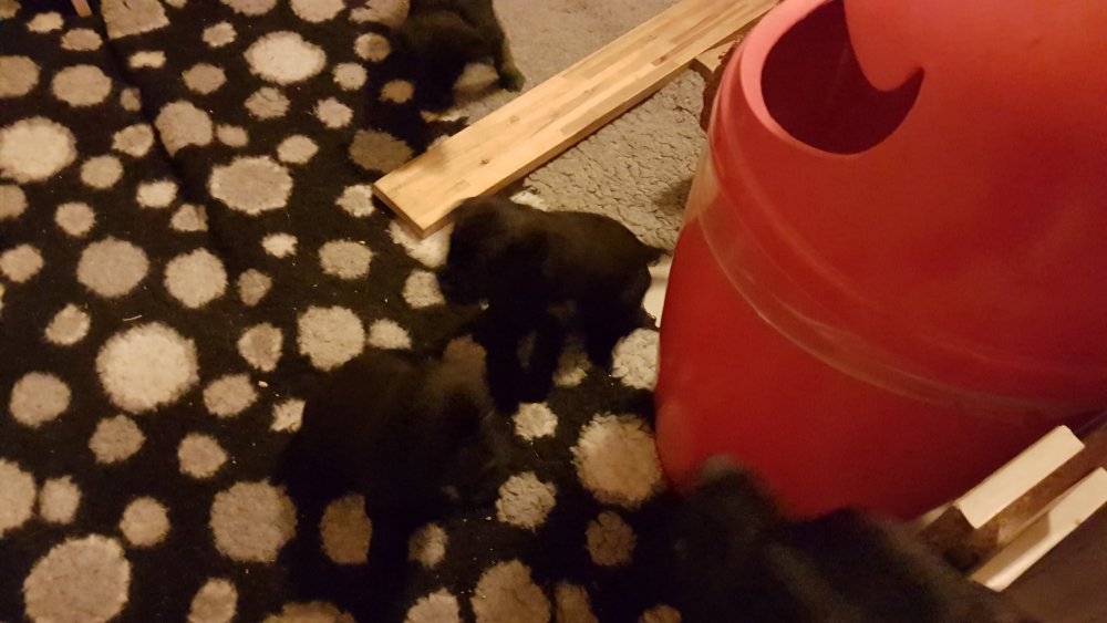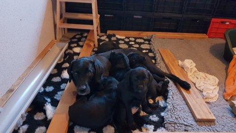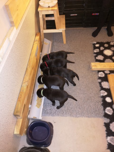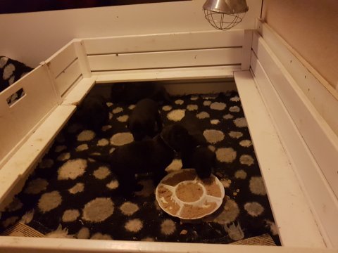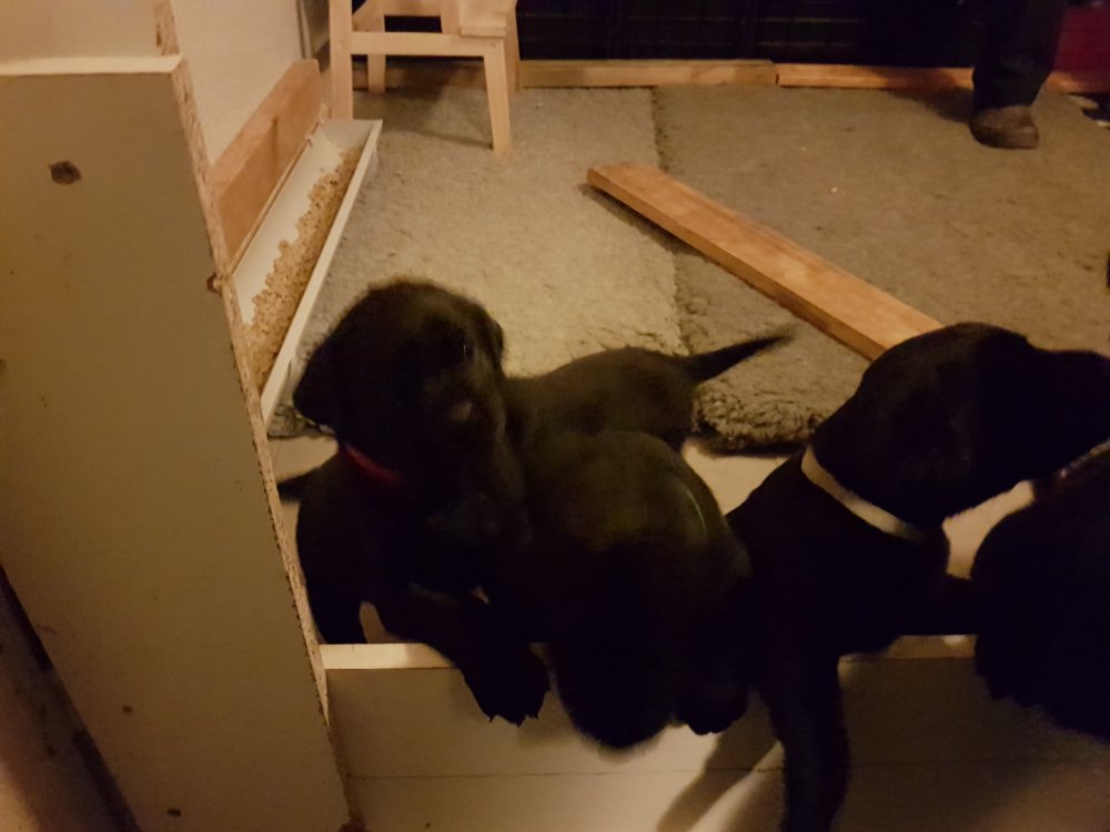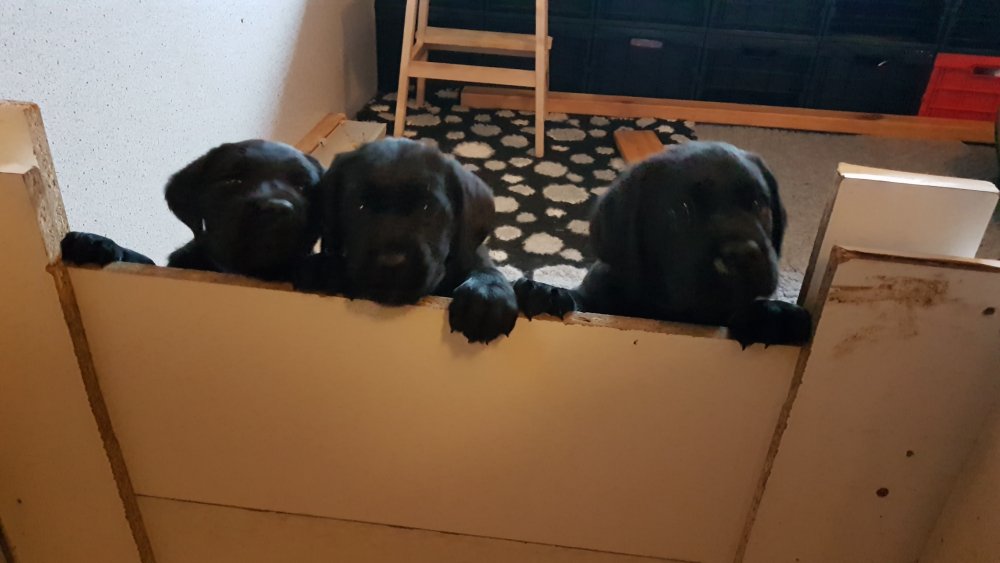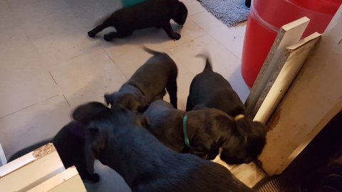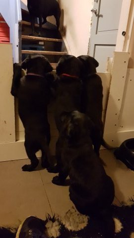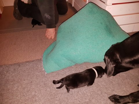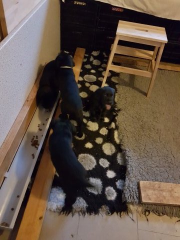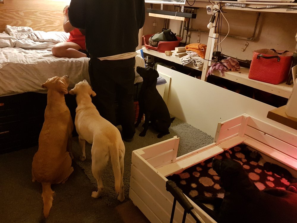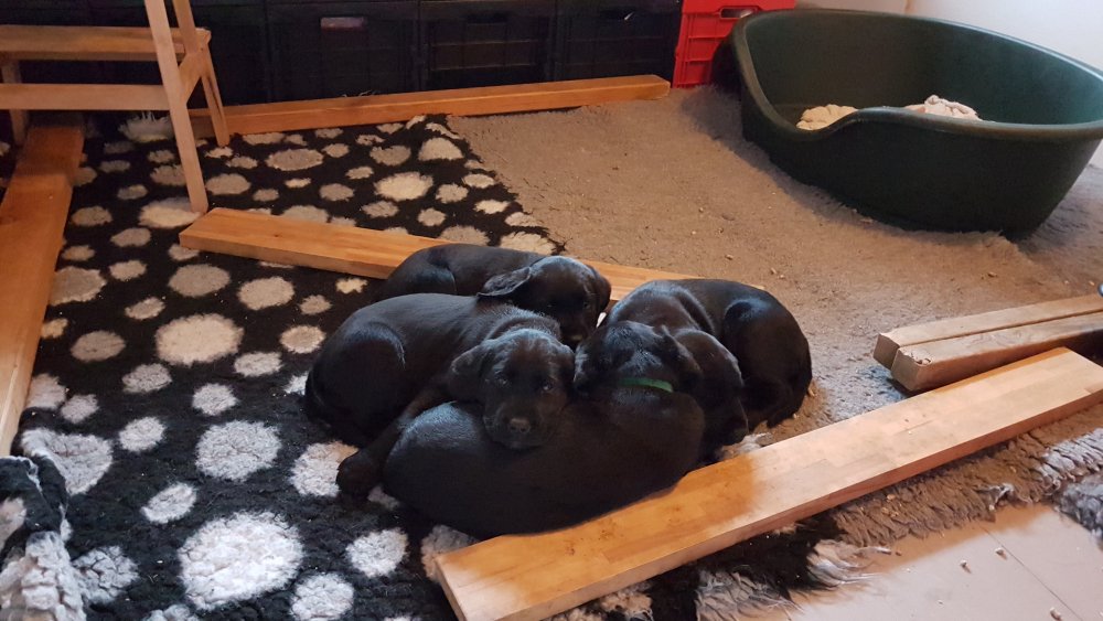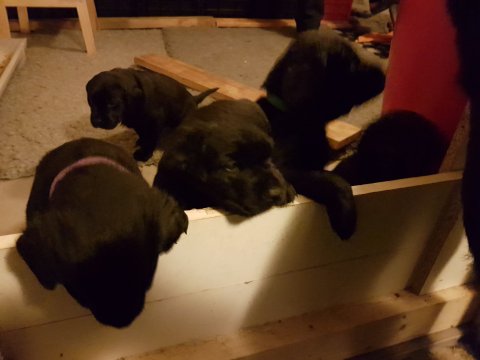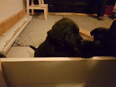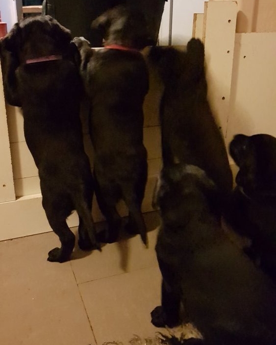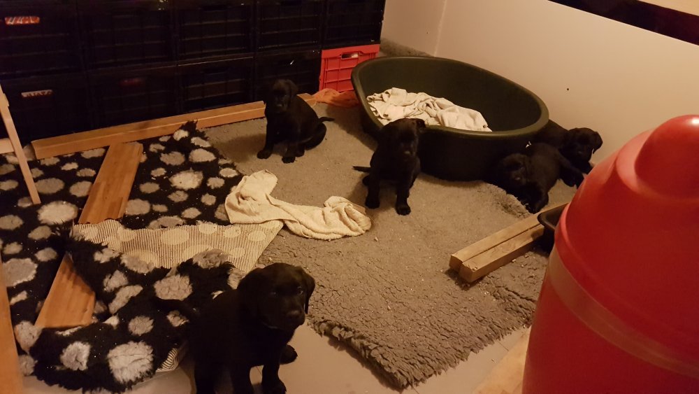 Hvalpene er blevet rigtig aktive der sker noget mere i hvalperummet.Men overveje de om de skal komme til lågen, når vi kommer ned eller om de bare skal ligge og slappe af. Det er andeledes hvis de andre hunde kommer ned så er de klar ved lågen.