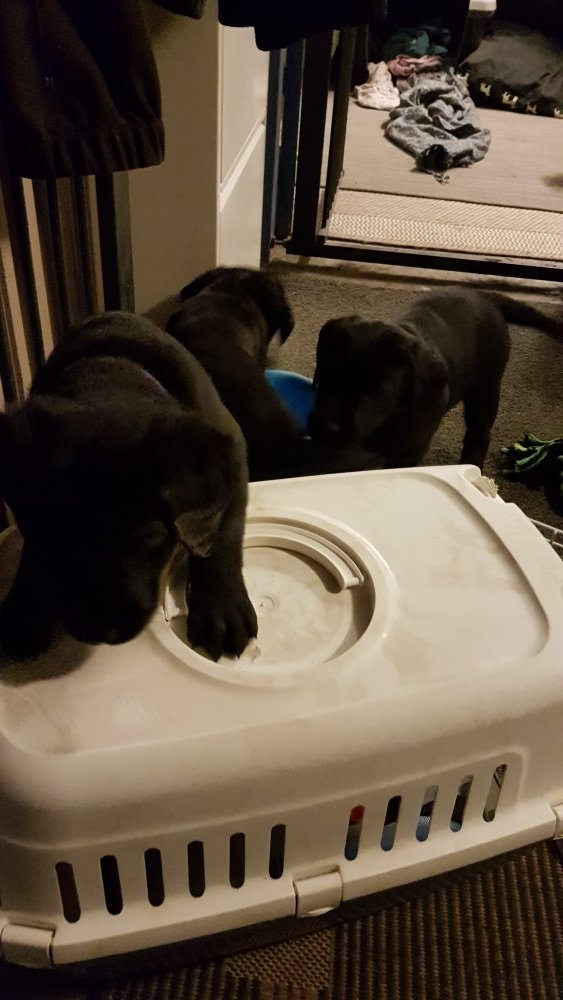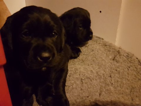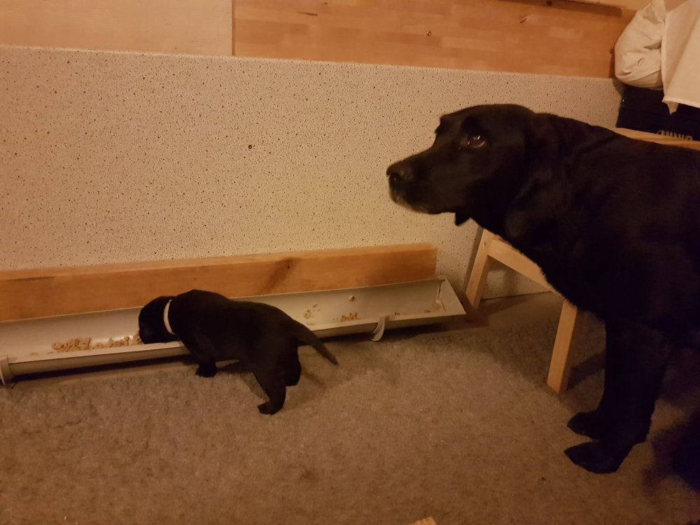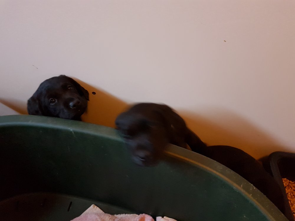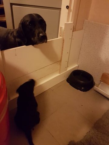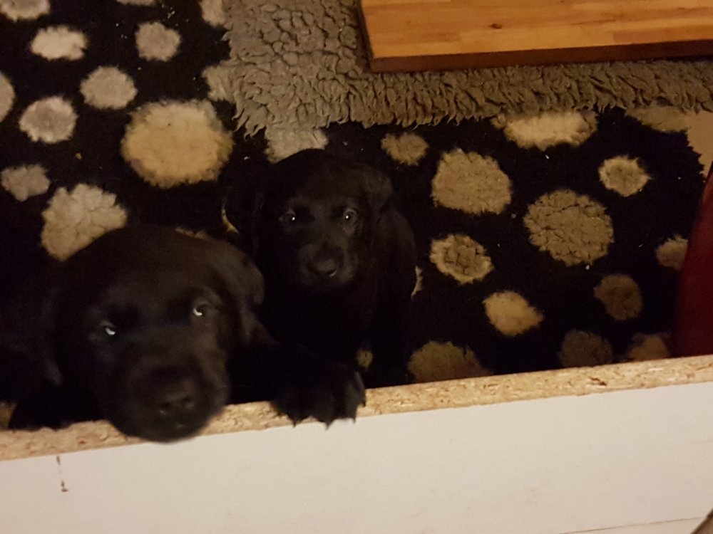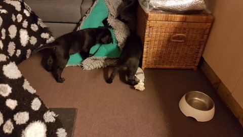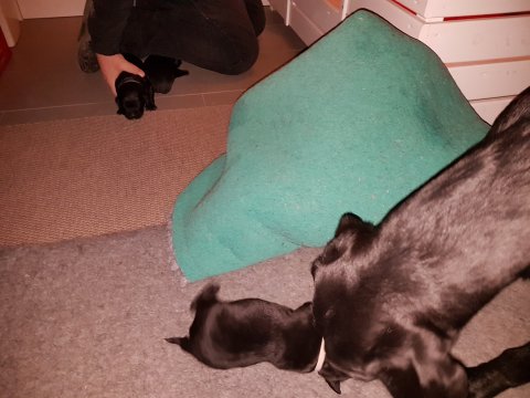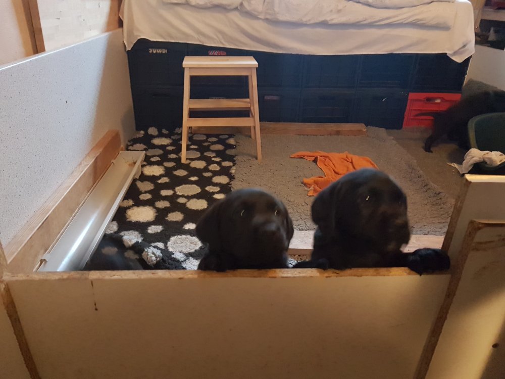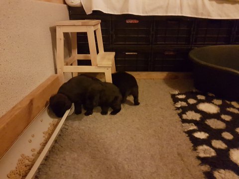 Når vi kommer ned til rummet begynder de at komme på deres små ben når vi snakker til dem. Når de andre hunde står uden for rummet komme de til lågen og sidder og kigger på dem. De er også begyndt at bruge "hunde WCét" mere