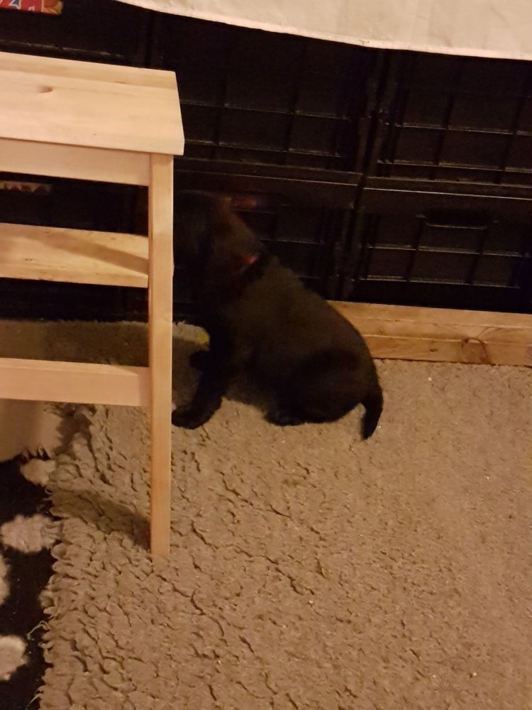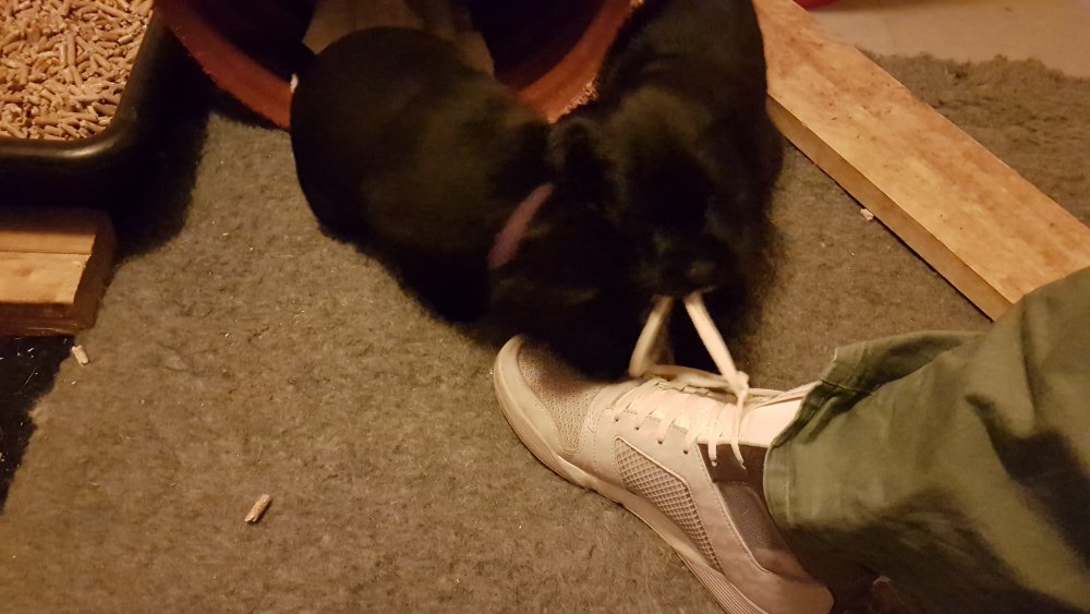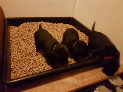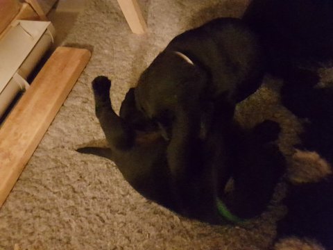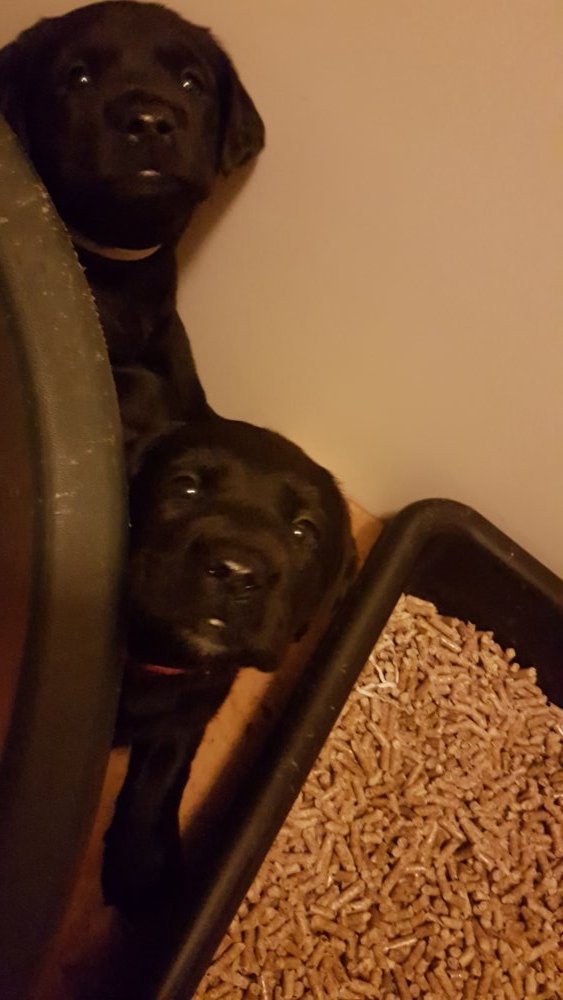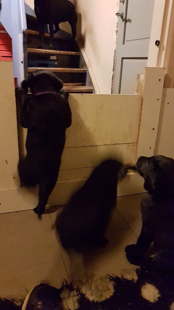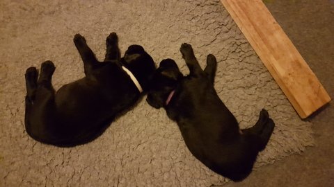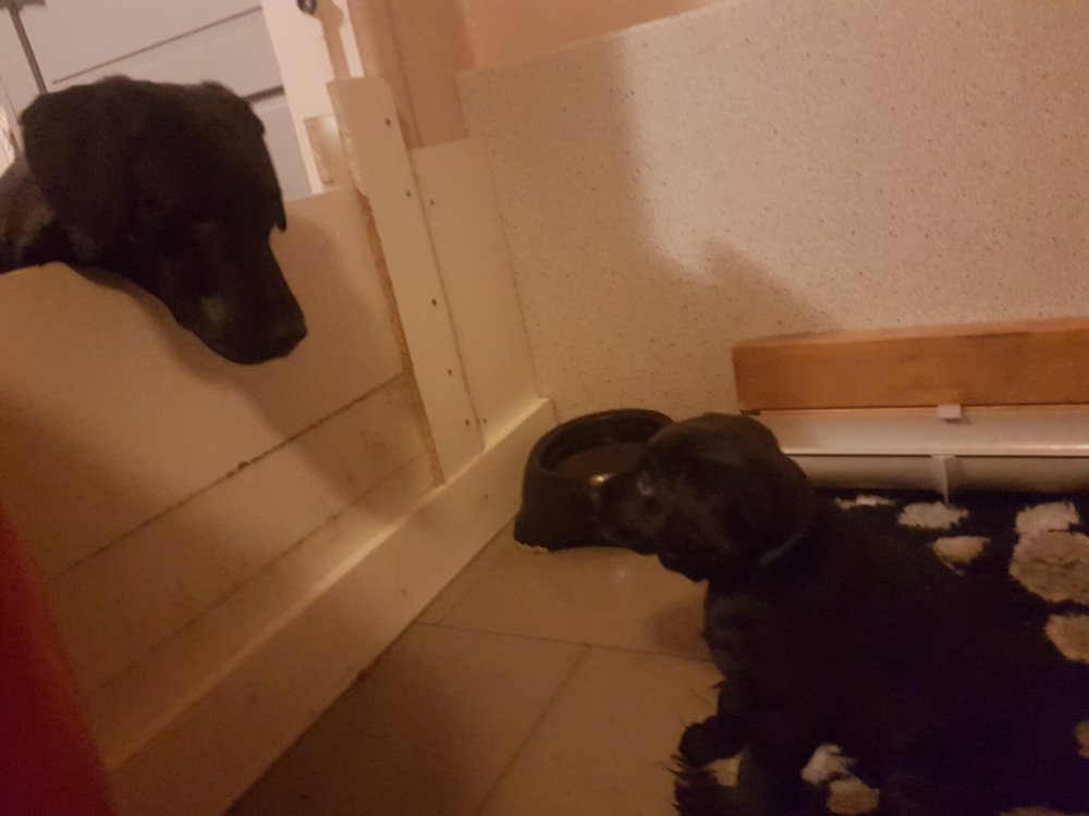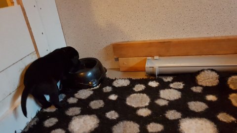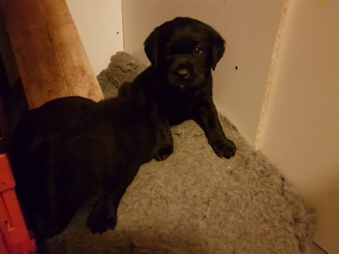 Når vi kommer ned til rummet begynder de at komme på deres små ben når vi snakker til dem. Når de andre hunde står uden for rummet komme de til lågen og sidder og kigger på dem. De er også begyndt at bruge "hunde WCét" mere