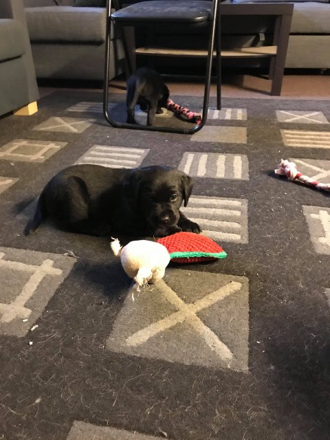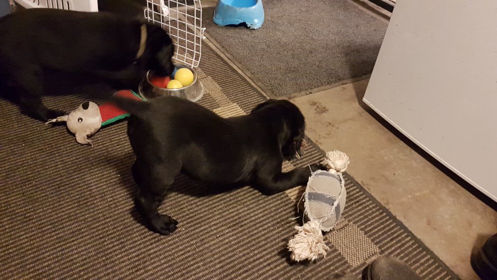 Hvalpene har nu hele rummet.