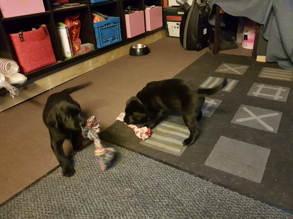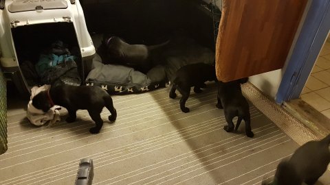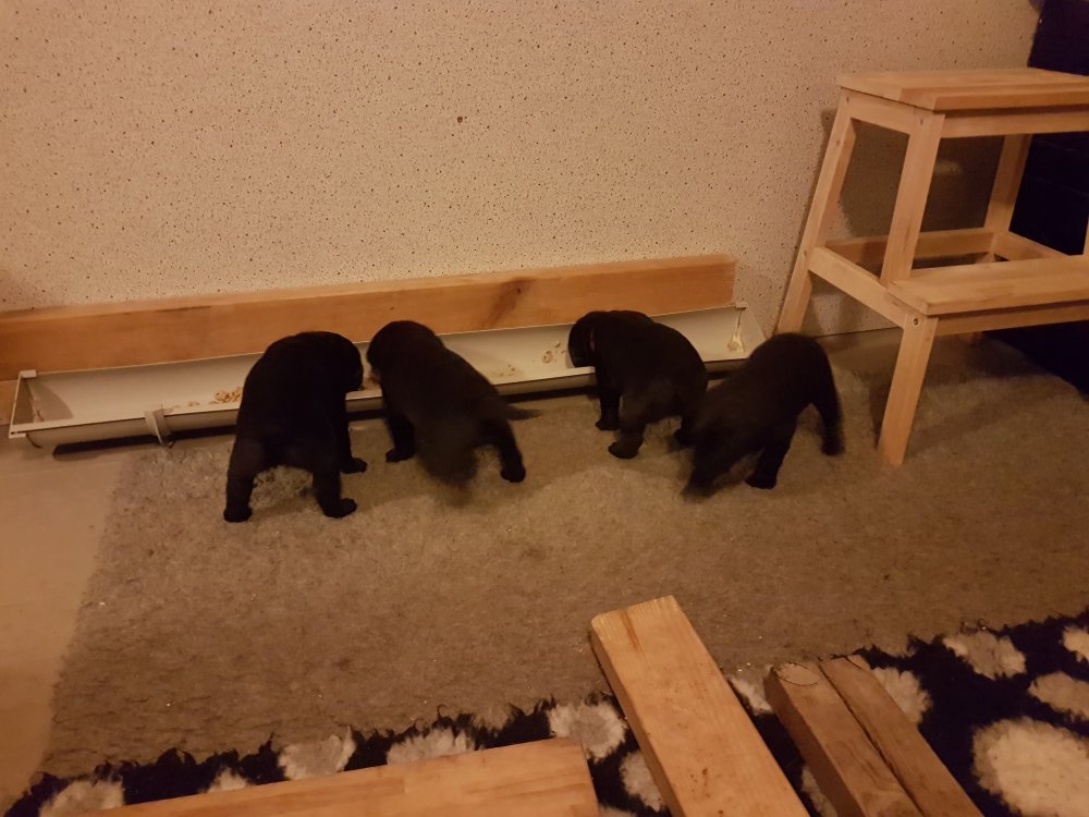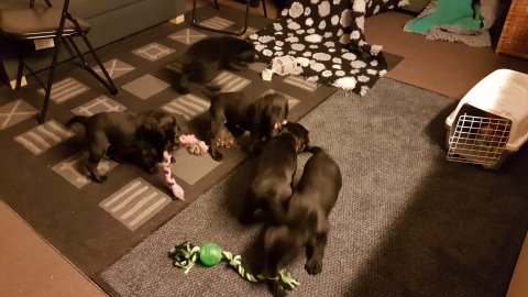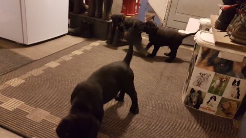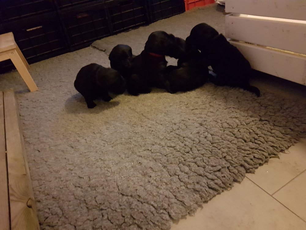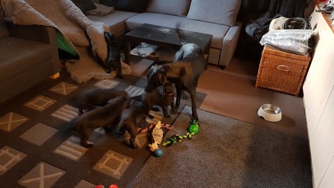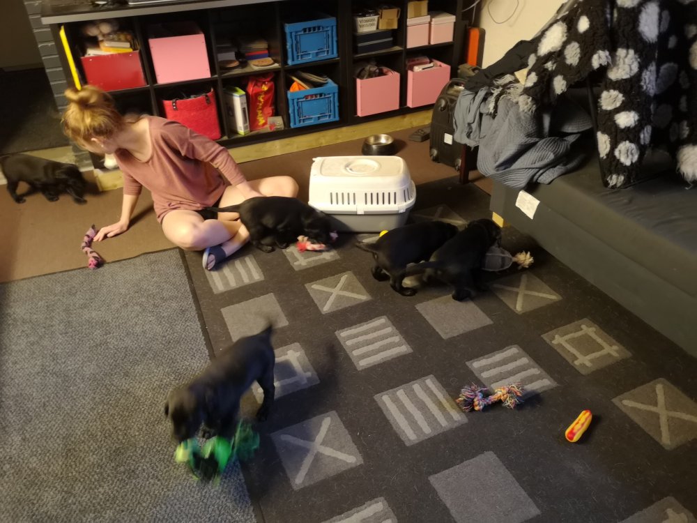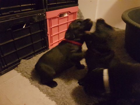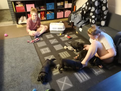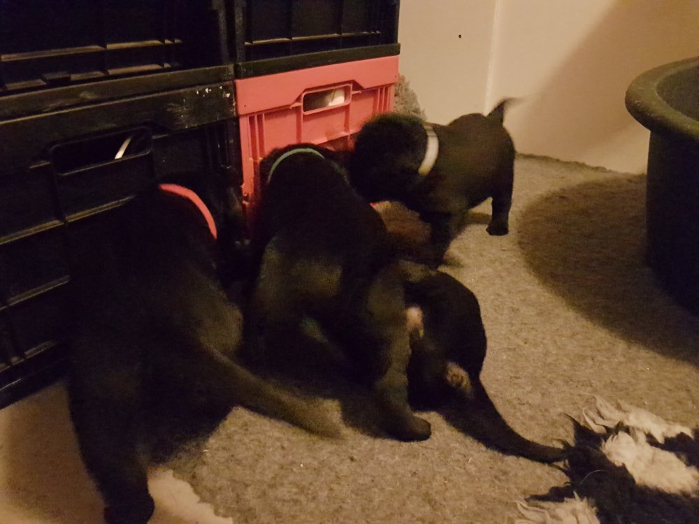 De er næsten altid klar når vi kommer ned ad trappen, især hvis de andre hunde kommer med ned, så står de strakts ved lågen. Malou elsker hendes små hvalpe men hun er også begyndt at opdrage på dem. Hvalpene har deres egne opdragelses metoder, der bliver kæmpe, leget og sovet. Det store hit lige nu et vandskålen, ofte er det vand ud over det hele. Hvalpene også begyndt at komme ud i "hvalpebørnehaven" og det er ikke altid de synes at de er færdig med at lege, når vi sætter dem i rummet igen.