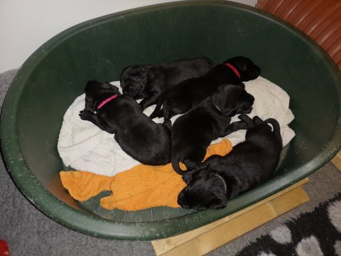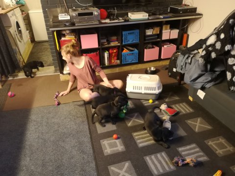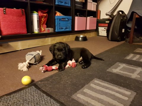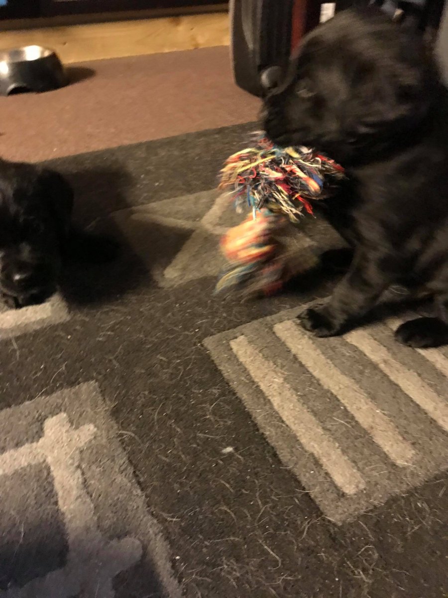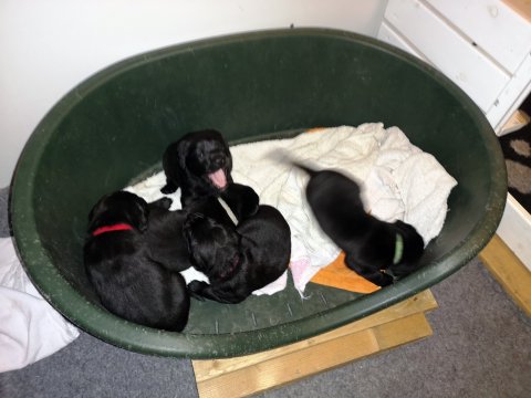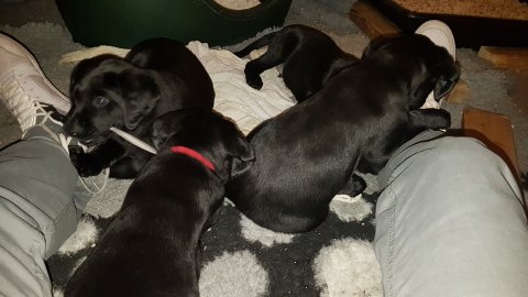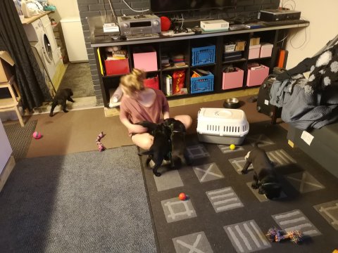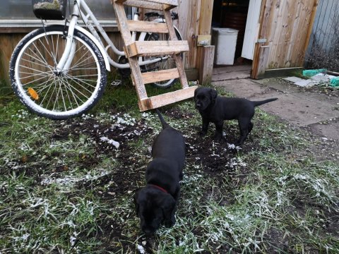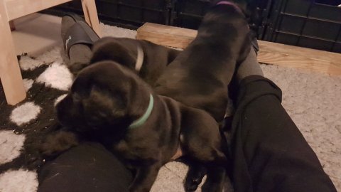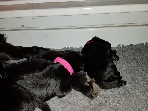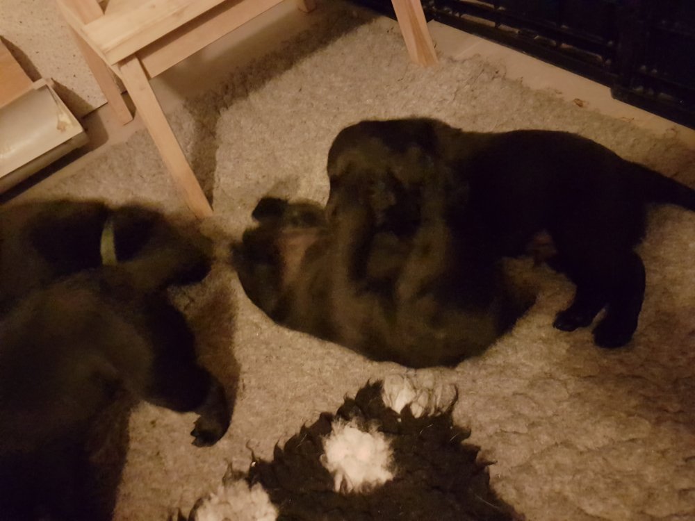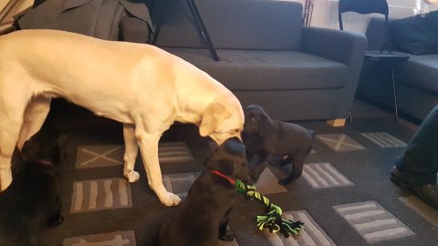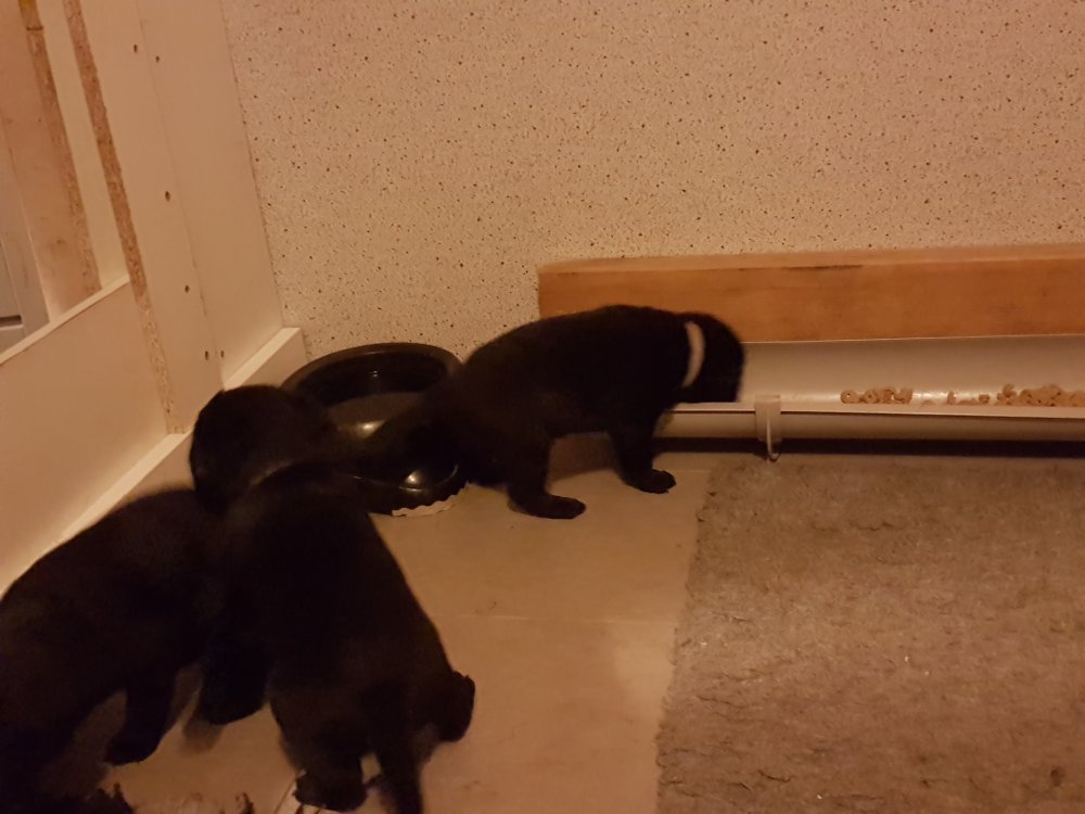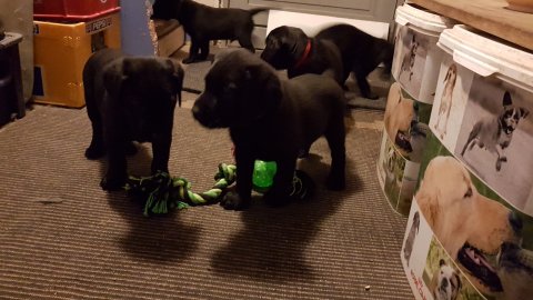 De er næsten altid klar når vi kommer ned ad trappen, især hvis de andre hunde kommer med ned, så står de strakts ved lågen. Malou elsker hendes små hvalpe men hun er også begyndt at opdrage på dem. Hvalpene har deres egne opdragelses metoder, der bliver kæmpe, leget og sovet. Det store hit lige nu et vandskålen, ofte er det vand ud over det hele. Hvalpene også begyndt at komme ud i "hvalpebørnehaven" og det er ikke altid de synes at de er færdig med at lege, når vi sætter dem i rummet igen.