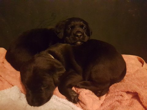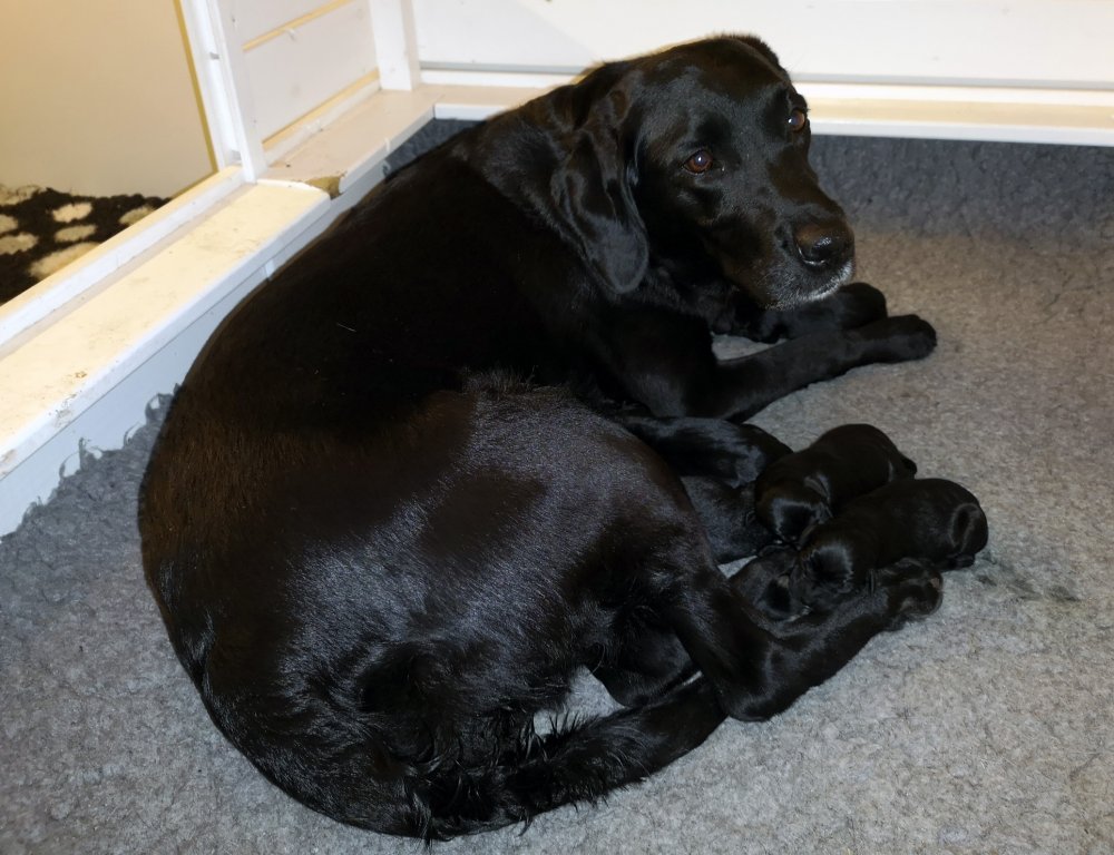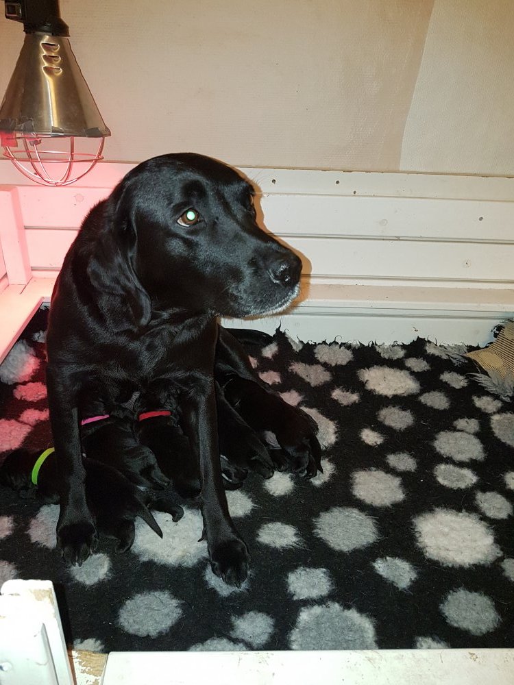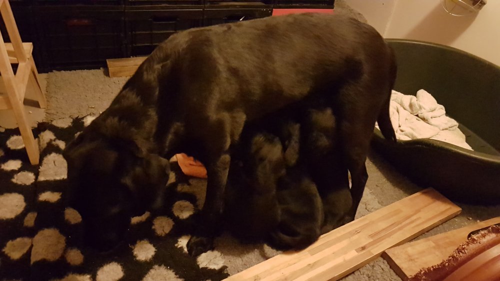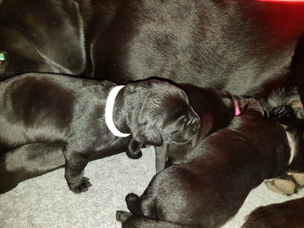 Hvalpene er nu godt 2 uger og kan næsten gå, se og spise, mens Malou står op.