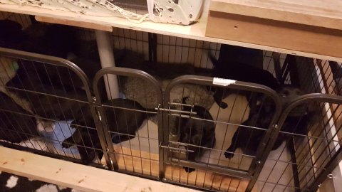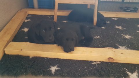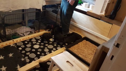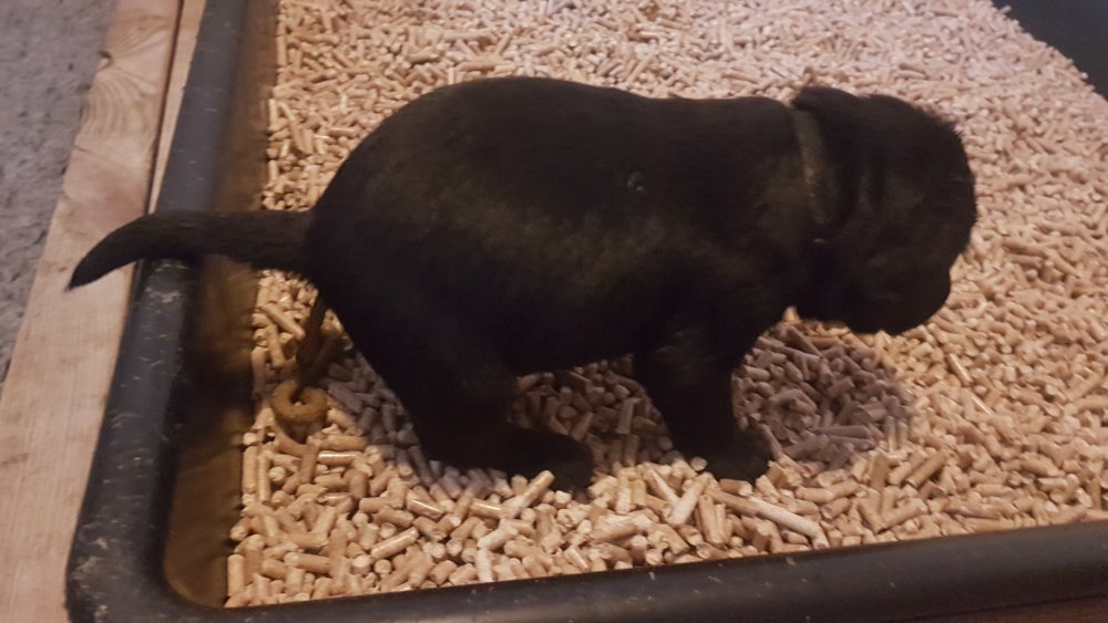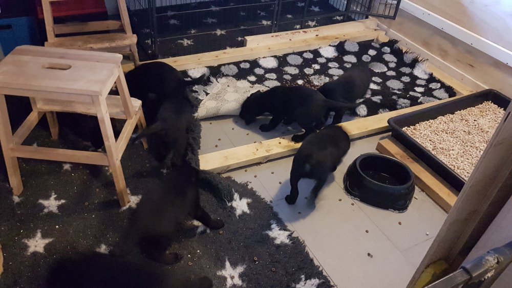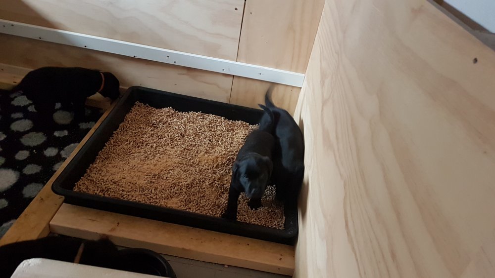 Hvalpene er også flytte ud af hvalpekassen, så de har fået mere plads og de har fået hvalpe wc´et og startet med toilettræning.