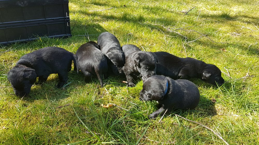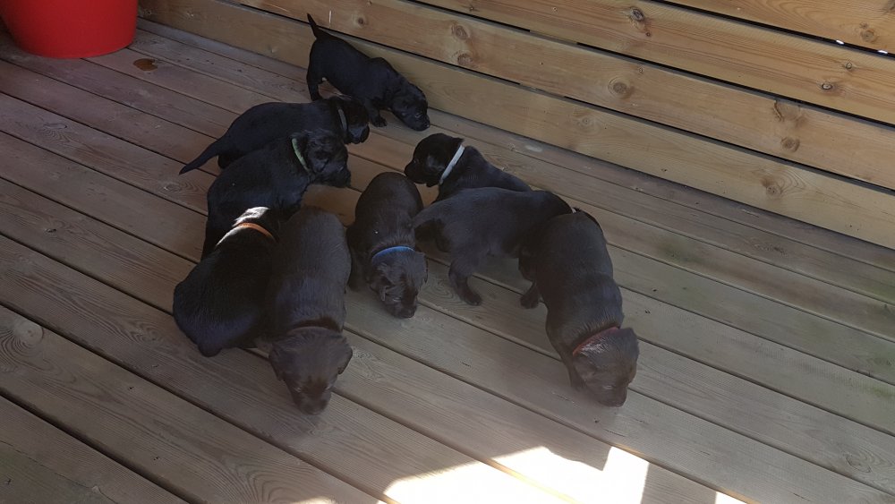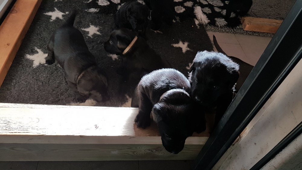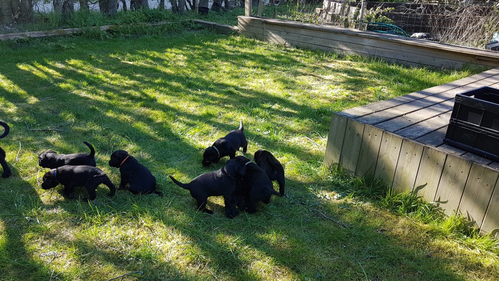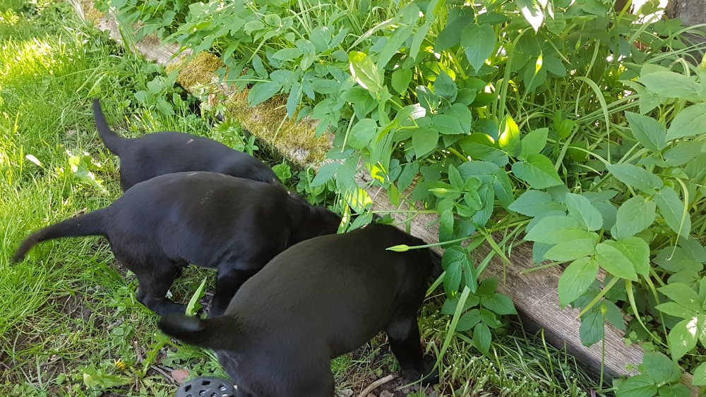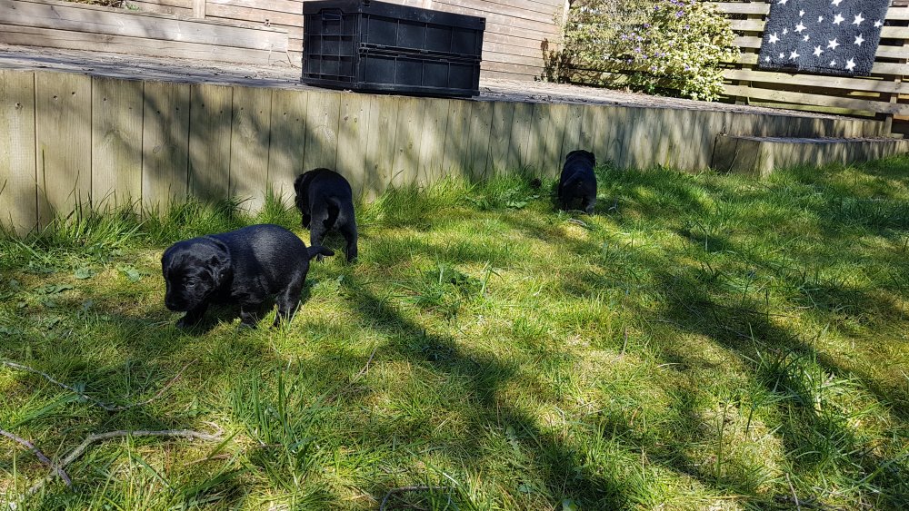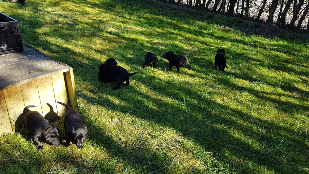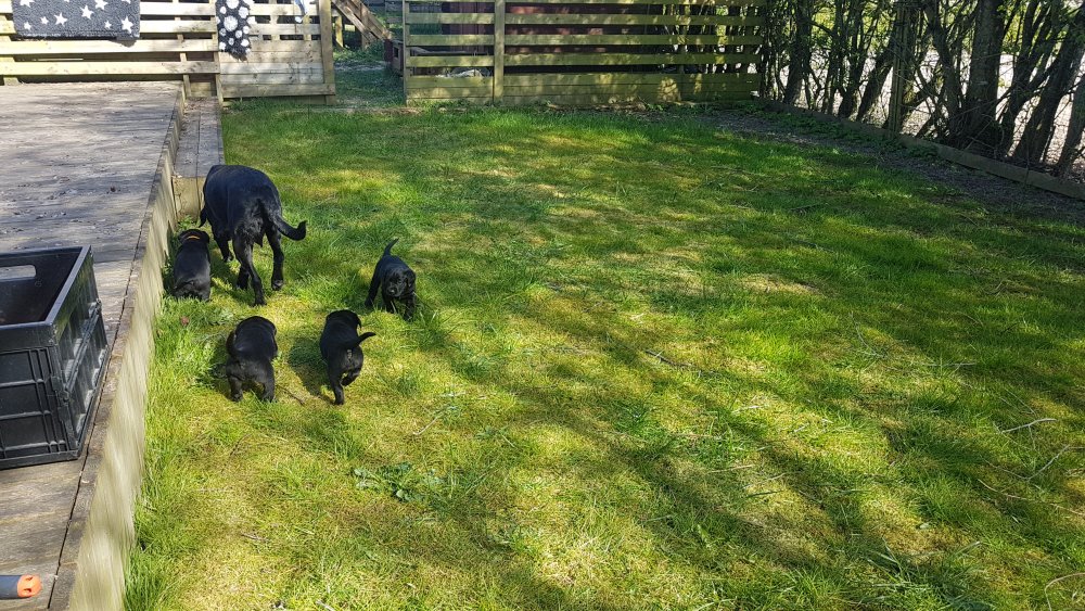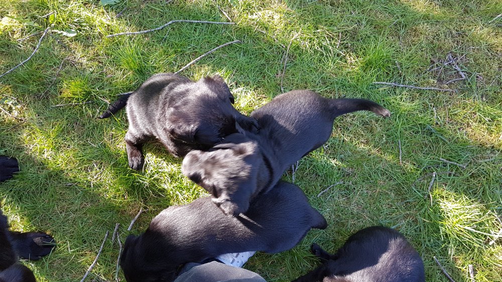 Der er kommet mere liv i hvalperummet.Hvalpene har nu hel rummet og der bliver tumle og prøvet kræfter med hinanden, når de er vågne. De er ved at finde deres egen lyd, så vi kan ofte høre små bjæf. Vi kan også se at de små hvalpetænder er ved at komme frem, så alt skal undersøges. I denne uge har vi også haft dem lidt ude i det fine vejr,