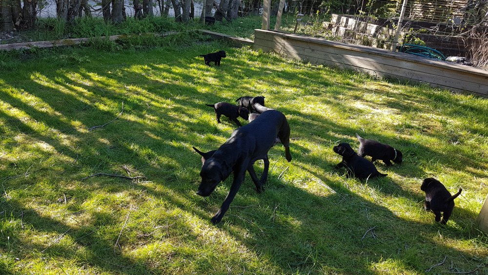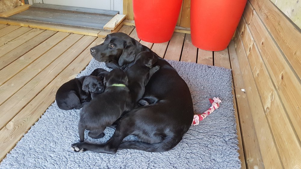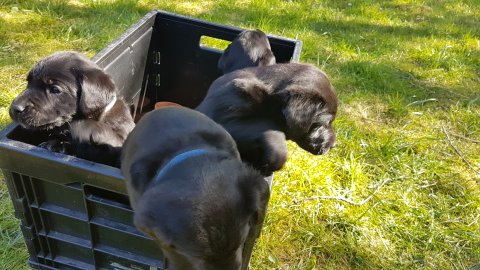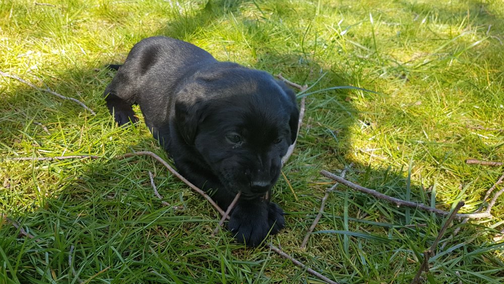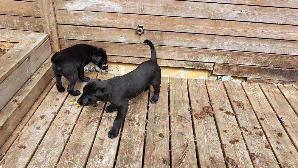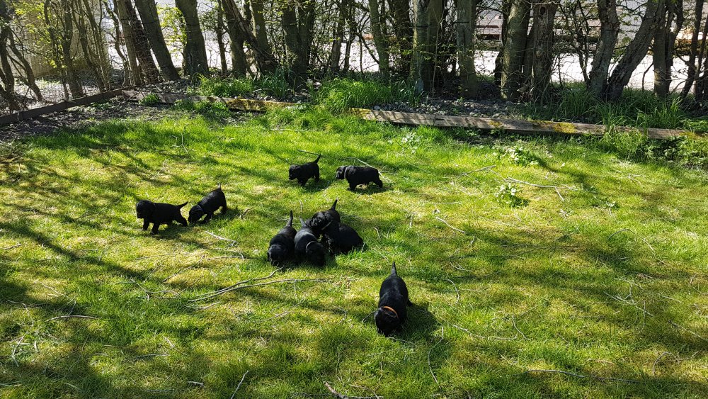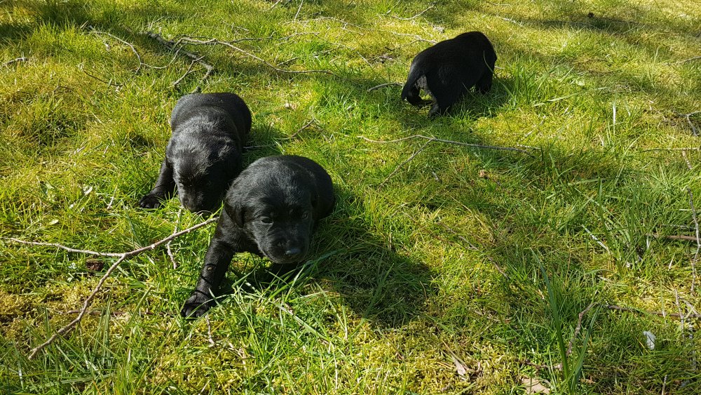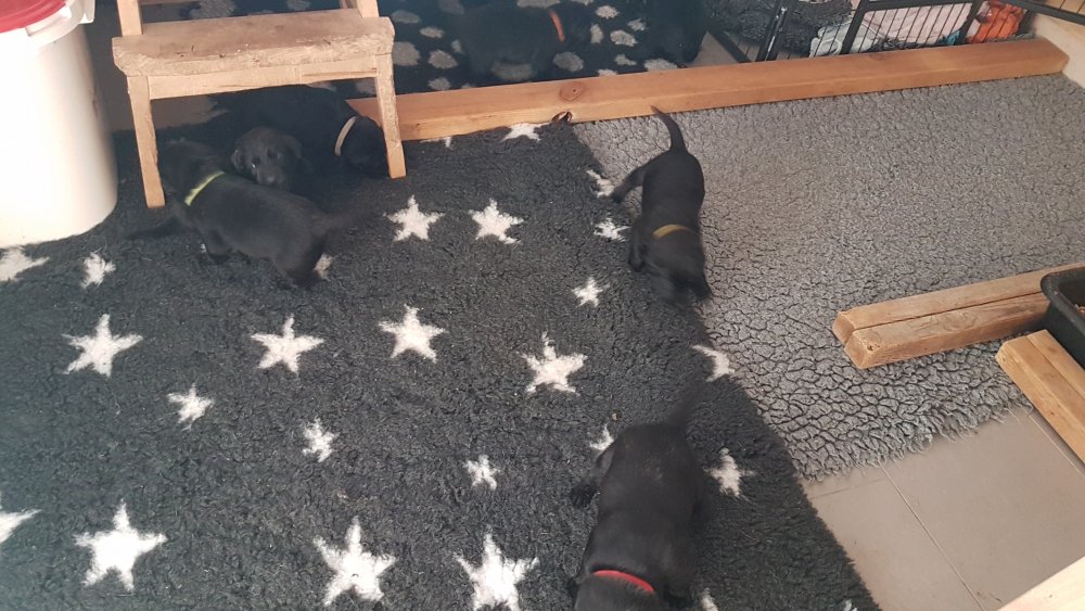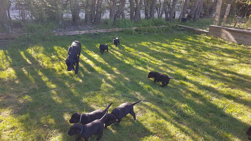 Der er kommet mere liv i hvalperummet.Hvalpene har nu hel rummet og der bliver tumle og prøvet kræfter med hinanden, når de er vågne. De er ved at finde deres egen lyd, så vi kan ofte høre små bjæf. Vi kan også se at de små hvalpetænder er ved at komme frem, så alt skal undersøges. I denne uge har vi også haft dem lidt ude i det fine vejr,