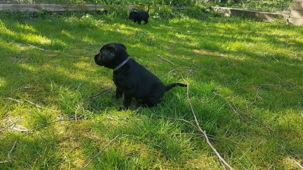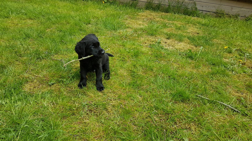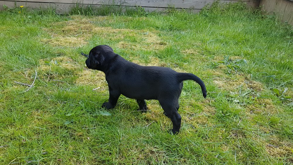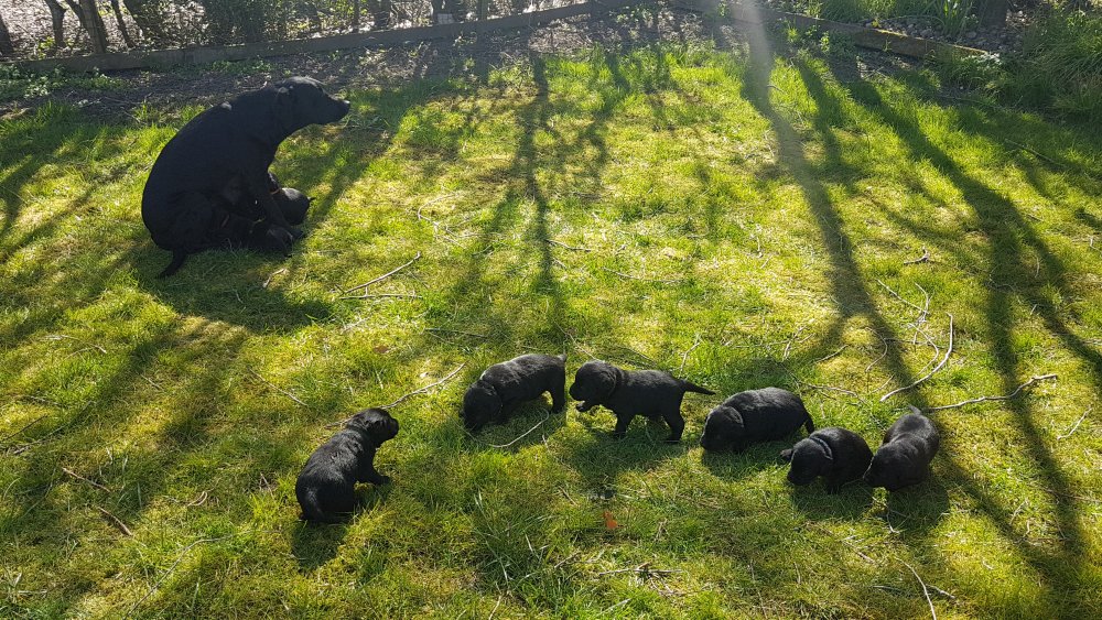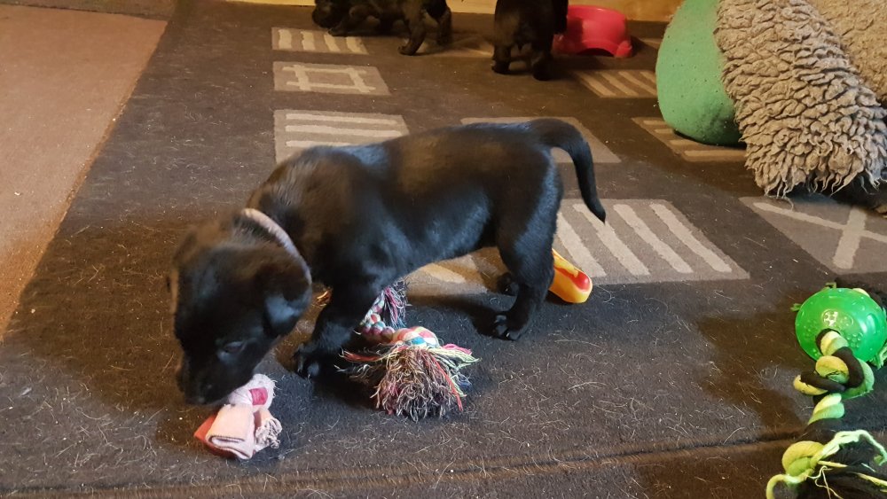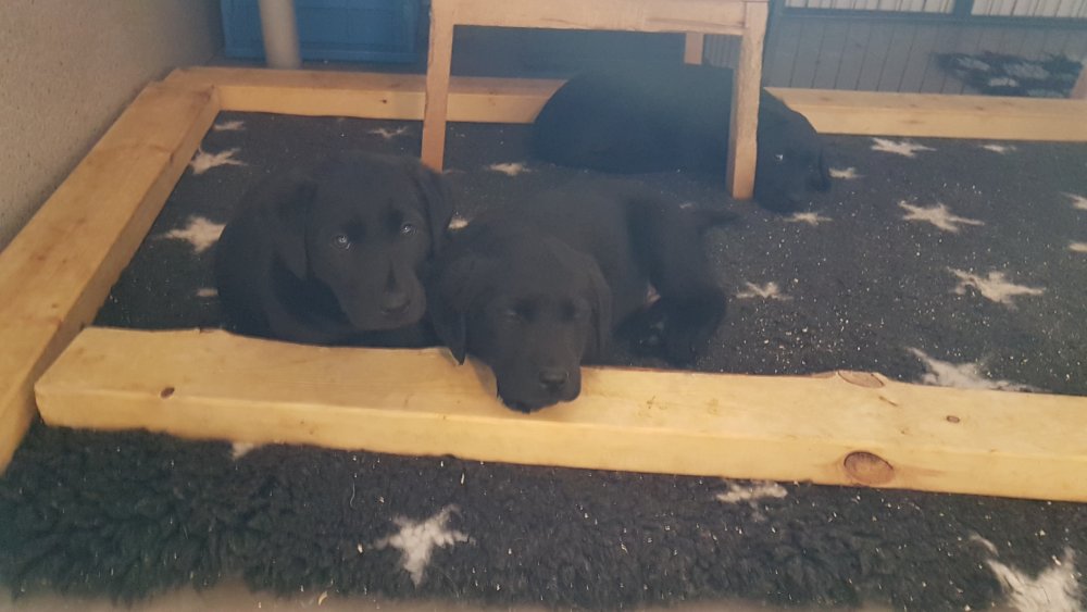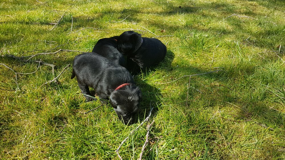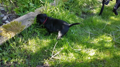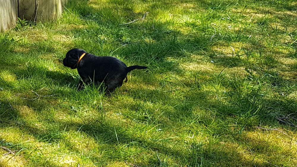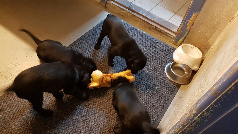 Der er kommet mere liv i hvalperummet.Hvalpene har nu hel rummet og der bliver tumle og prøvet kræfter med hinanden, når de er vågne. De er ved at finde deres egen lyd, så vi kan ofte høre små bjæf. Vi kan også se at de små hvalpetænder er ved at komme frem, så alt skal undersøges. I denne uge har vi også haft dem lidt ude i det fine vejr,