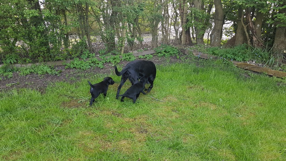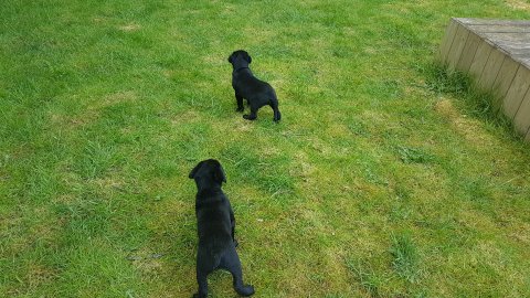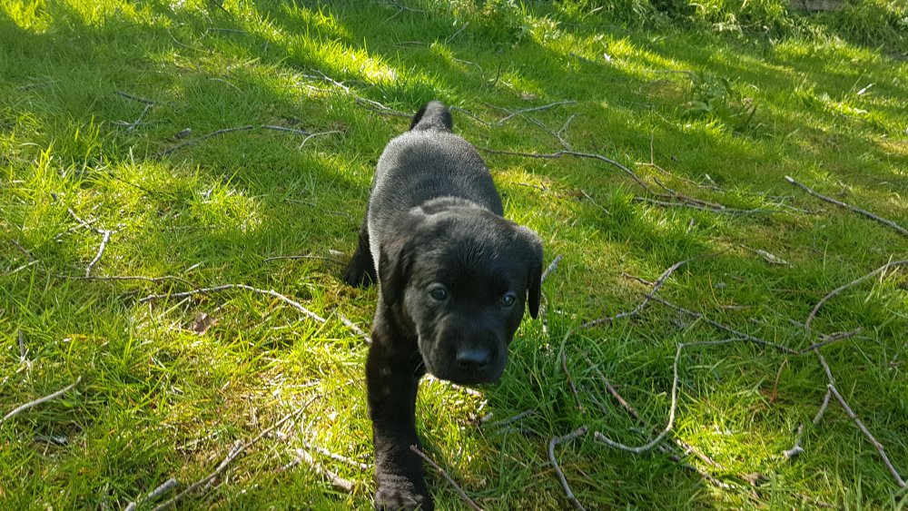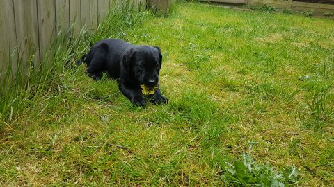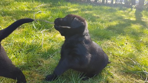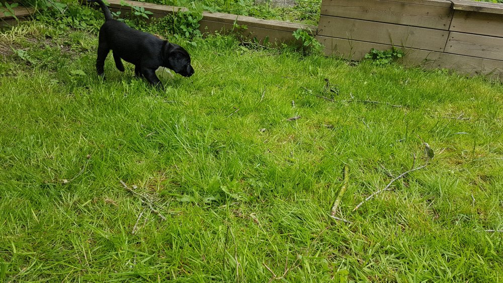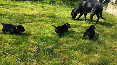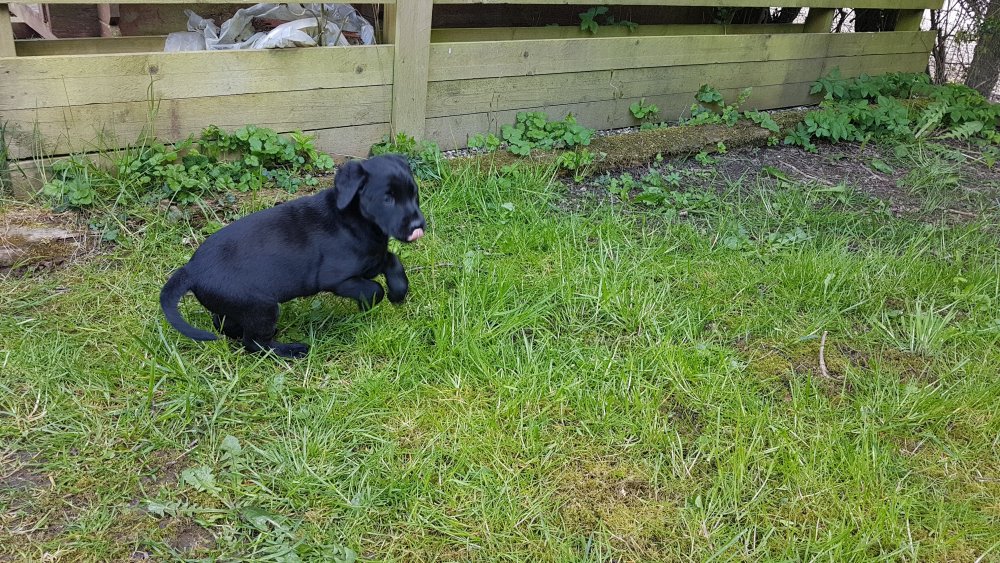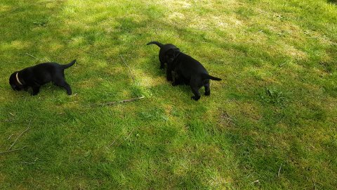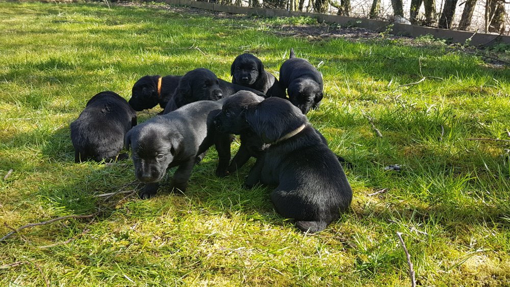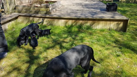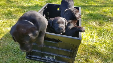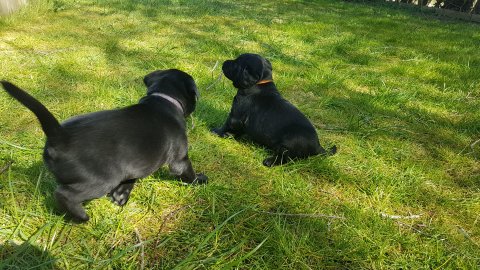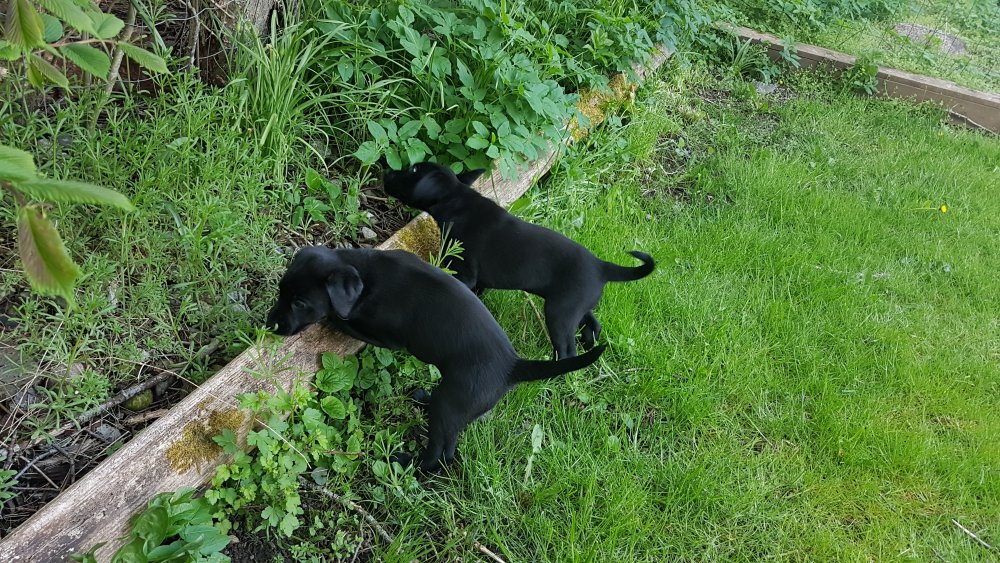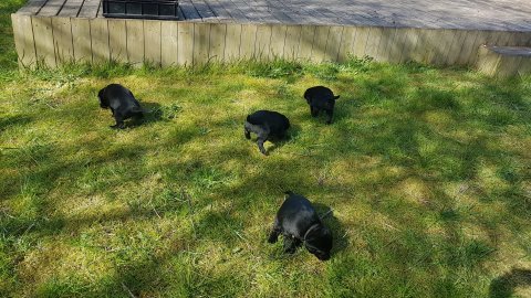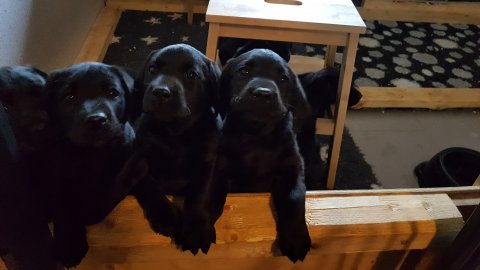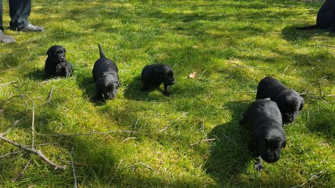 Der er kommet mere liv i hvalperummet.Hvalpene har nu hel rummet og der bliver tumle og prøvet kræfter med hinanden, når de er vågne. De er ved at finde deres egen lyd, så vi kan ofte høre små bjæf. Vi kan også se at de små hvalpetænder er ved at komme frem, så alt skal undersøges. I denne uge har vi også haft dem lidt ude i det fine vejr,