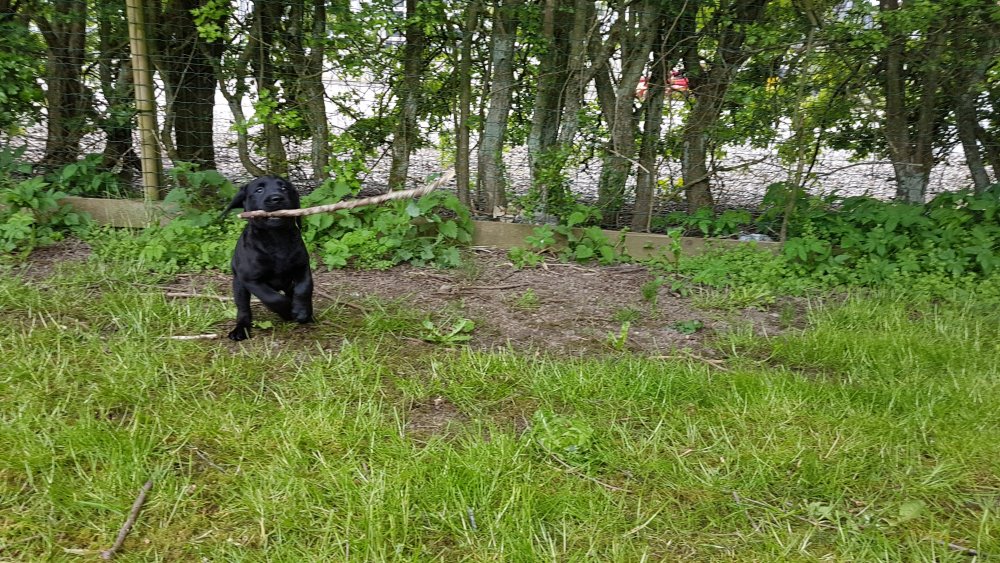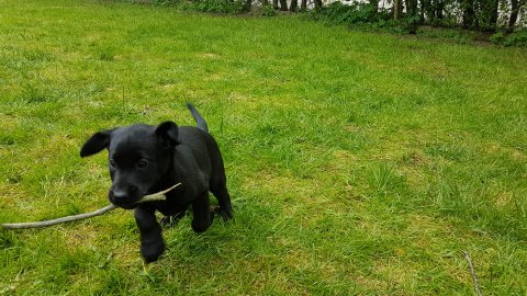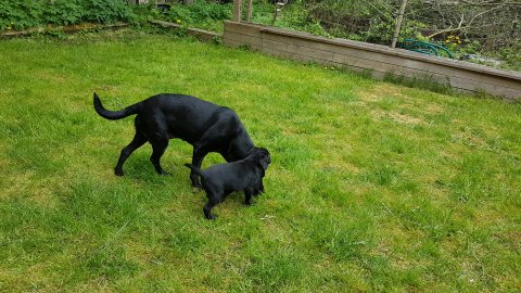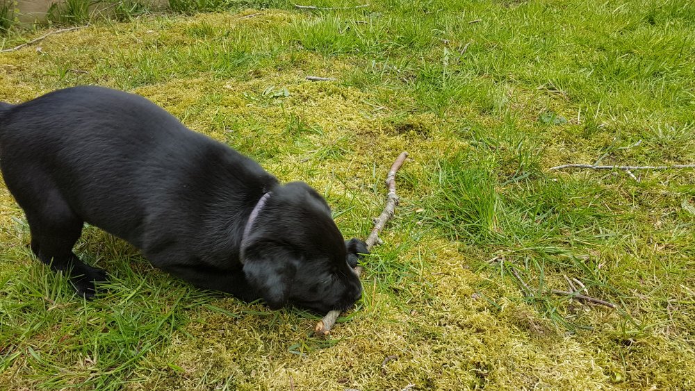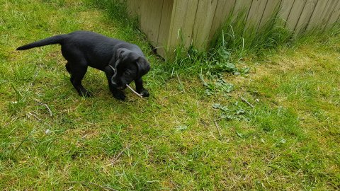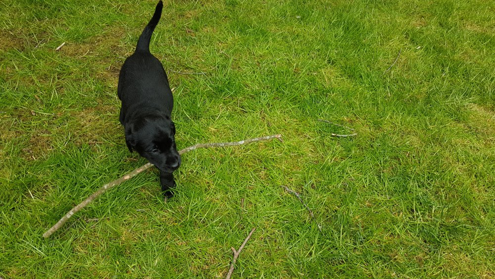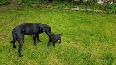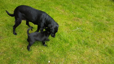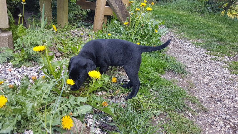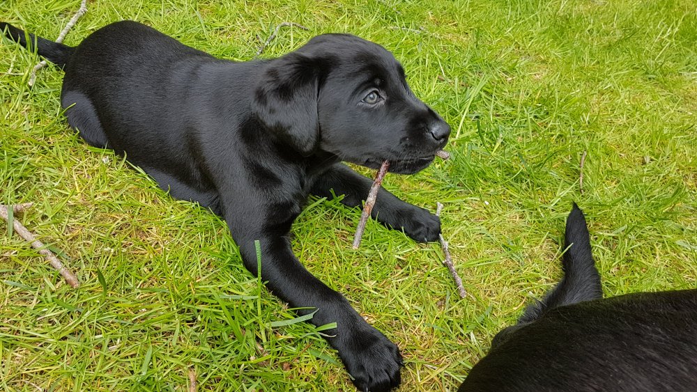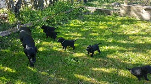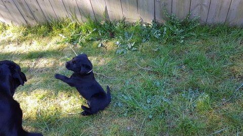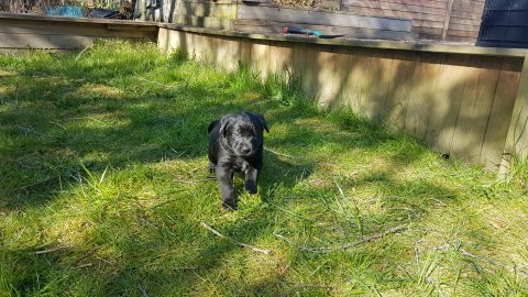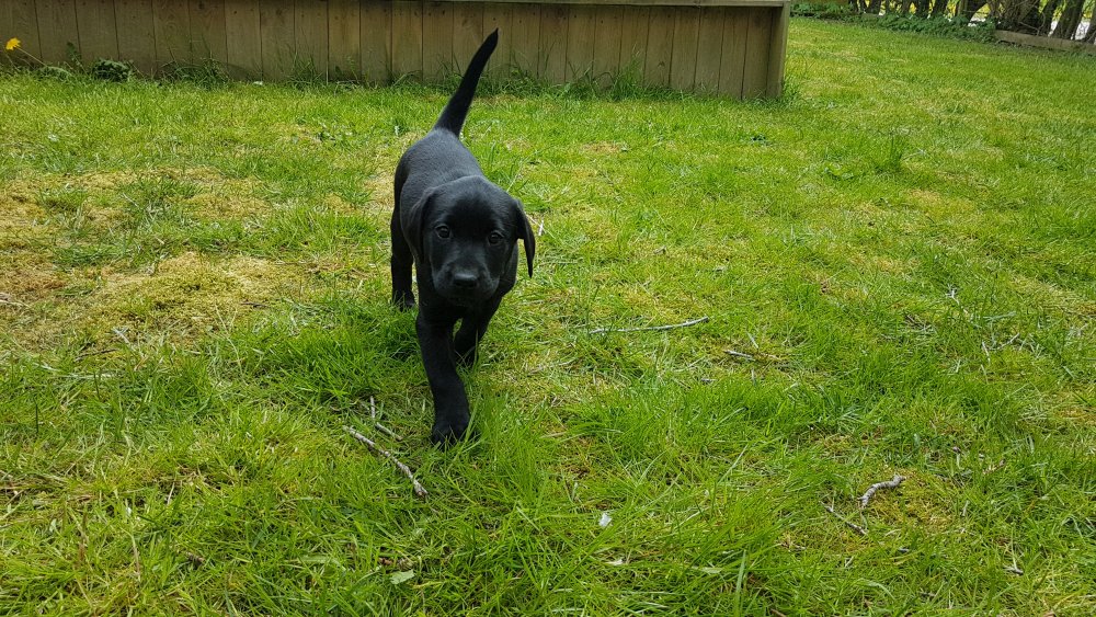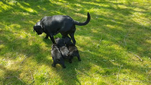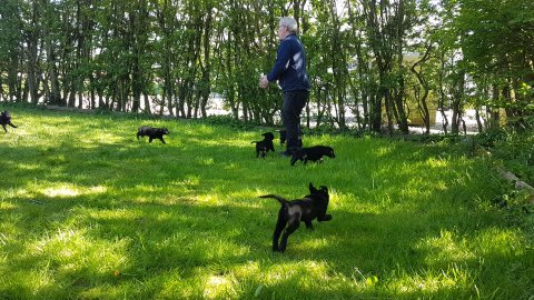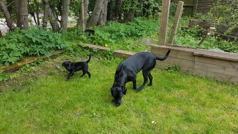 Der er kommet mere liv i hvalperummet.Hvalpene har nu hel rummet og der bliver tumle og prøvet kræfter med hinanden, når de er vågne. De er ved at finde deres egen lyd, så vi kan ofte høre små bjæf. Vi kan også se at de små hvalpetænder er ved at komme frem, så alt skal undersøges. I denne uge har vi også haft dem lidt ude i det fine vejr,