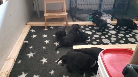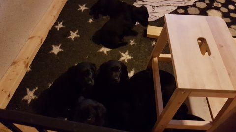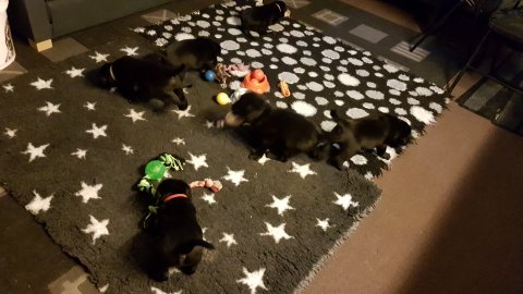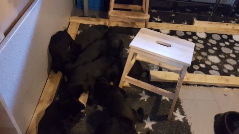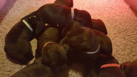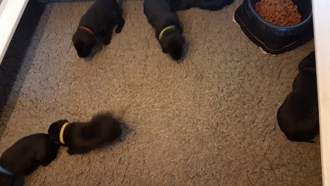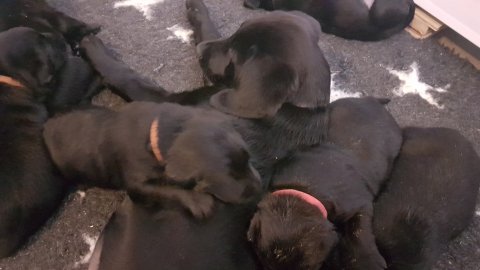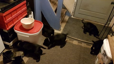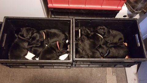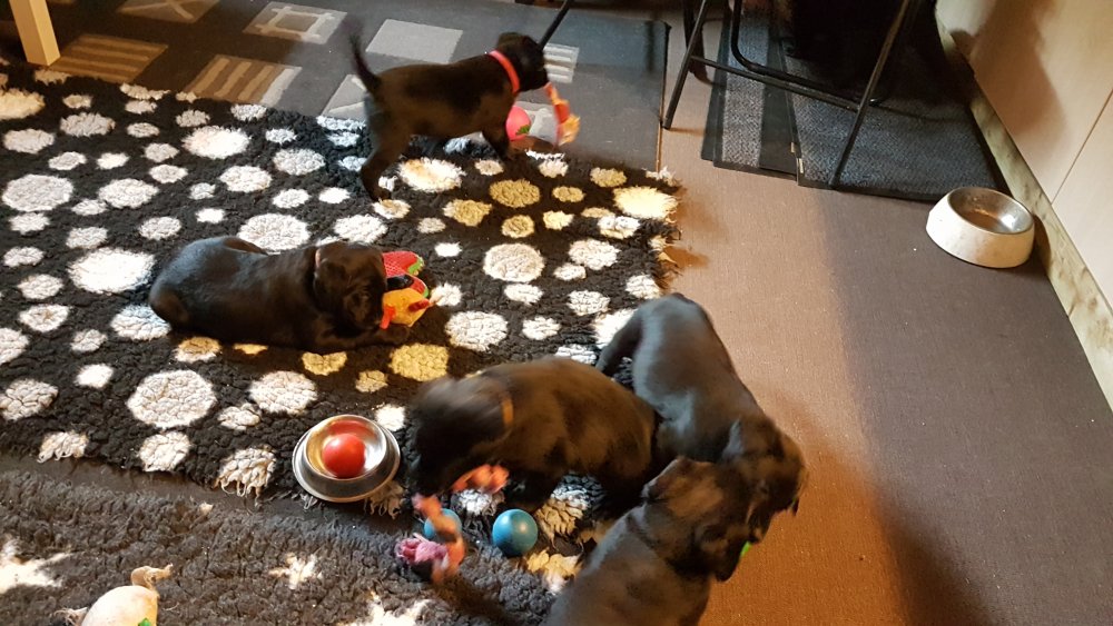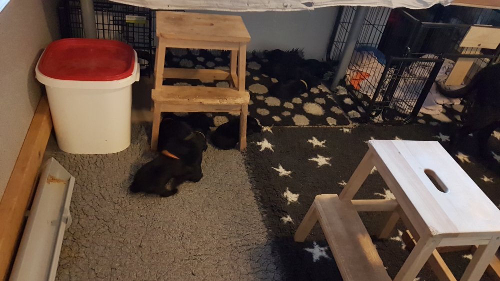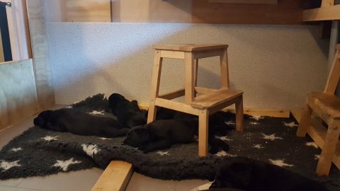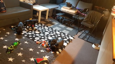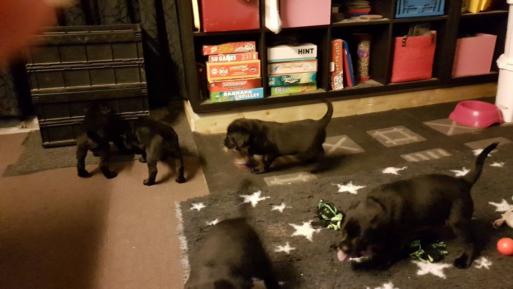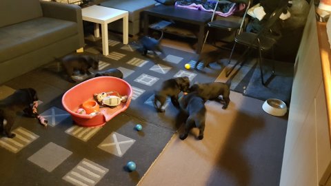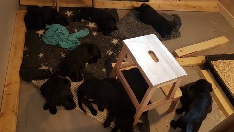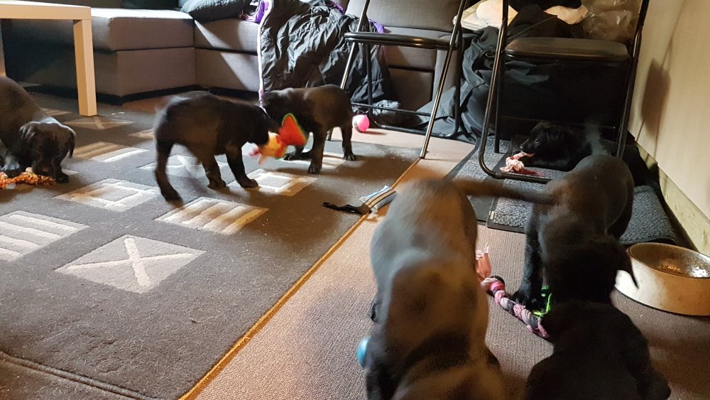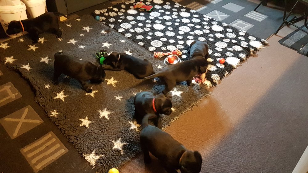 Det er den sidste uge i hvalpekassen, hvor der har været rigtig gang i rummet der er blevet tumlet, leget m.m. Hvalpene vil rigtig gerne udenfor rummet og prøve nye grænser af. Flokken hygger sig i rummet og meget gerne i en stor klump.