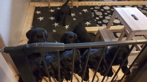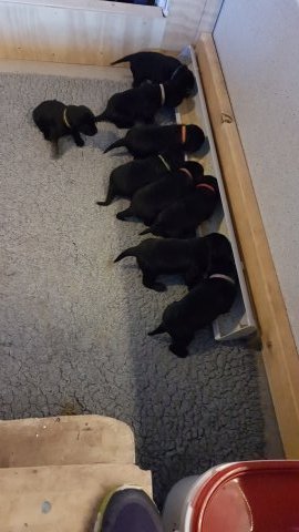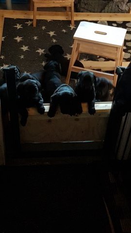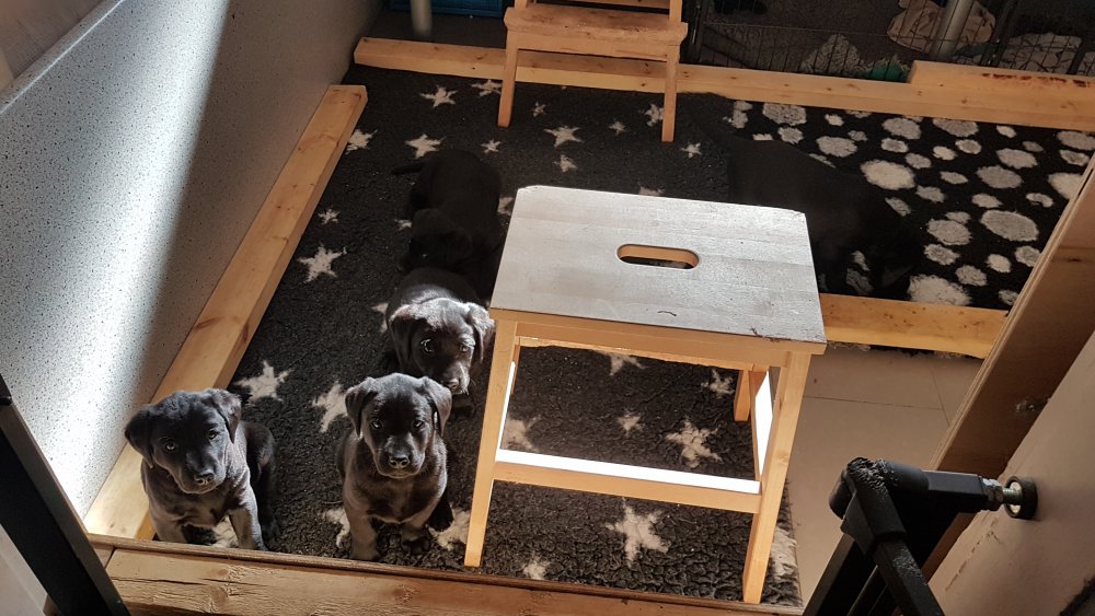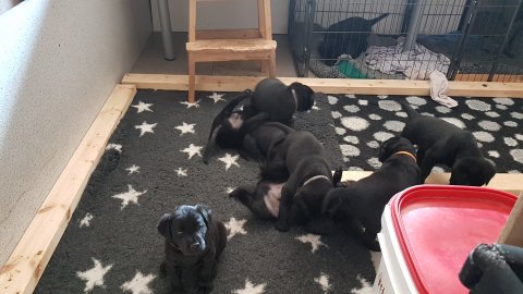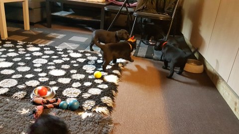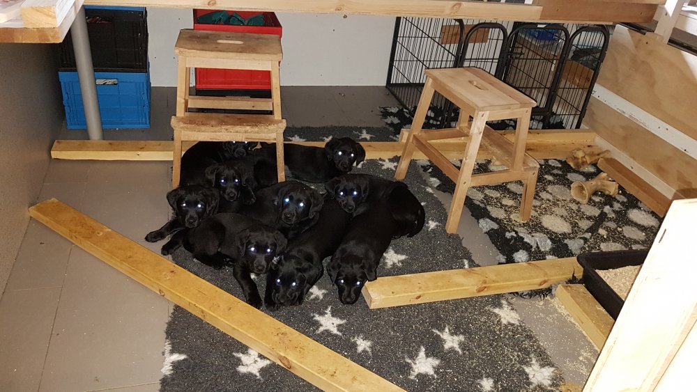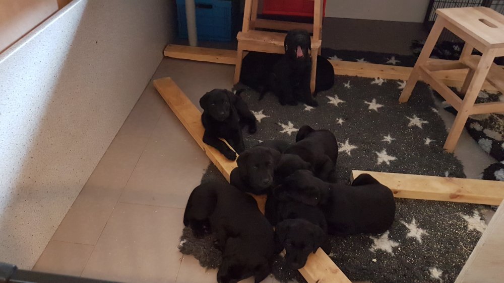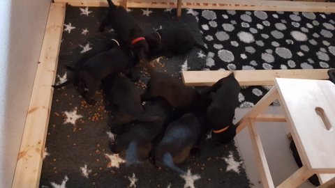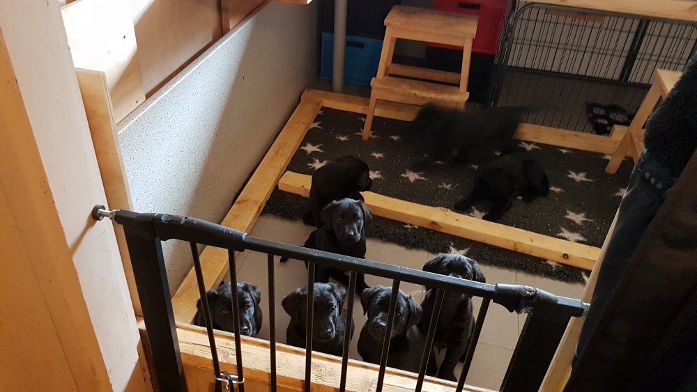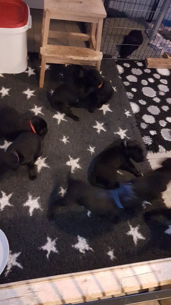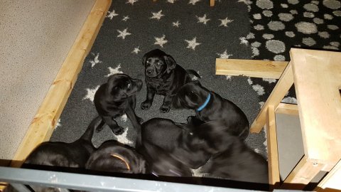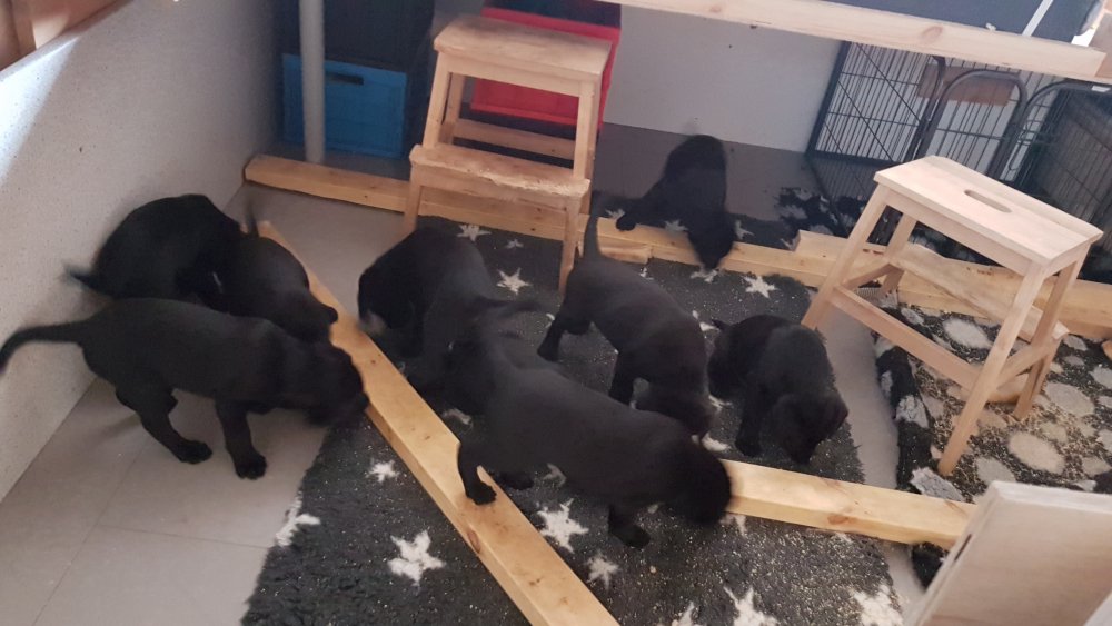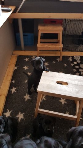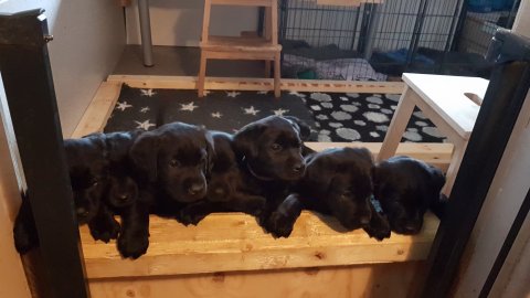 Det er den sidste uge i hvalpekassen, hvor der har været rigtig gang i rummet der er blevet tumlet, leget m.m. Hvalpene vil rigtig gerne udenfor rummet og prøve nye grænser af. Flokken hygger sig i rummet og meget gerne i en stor klump.