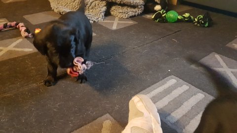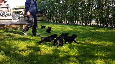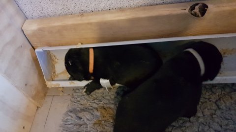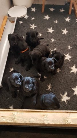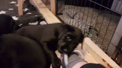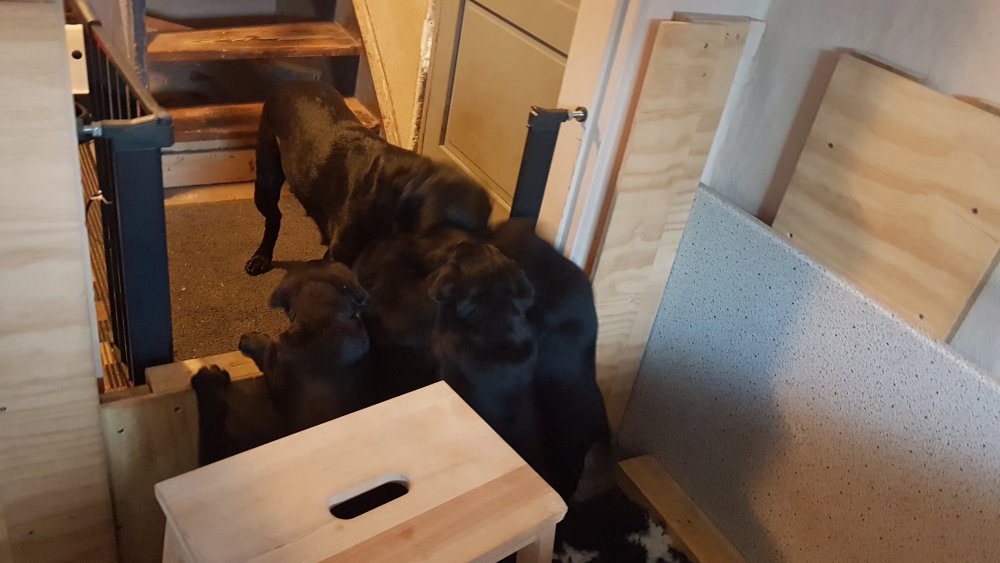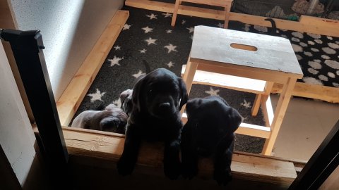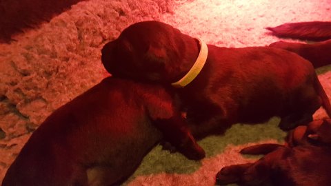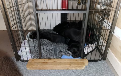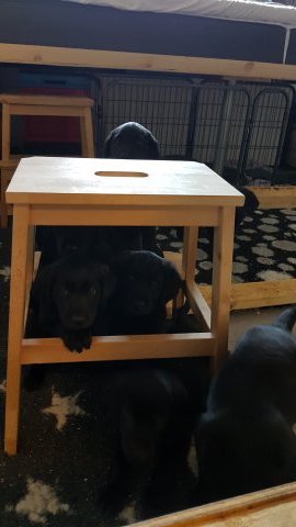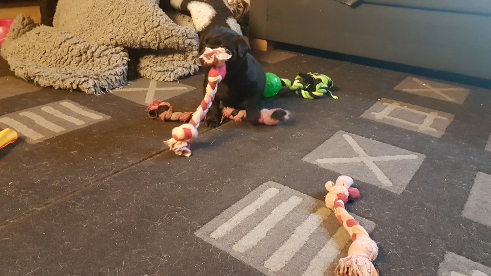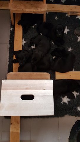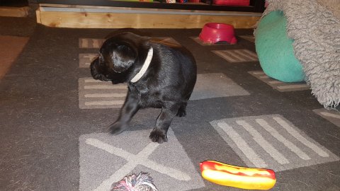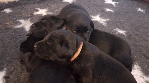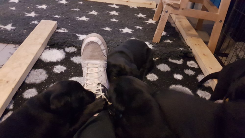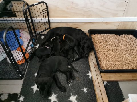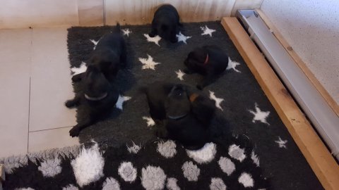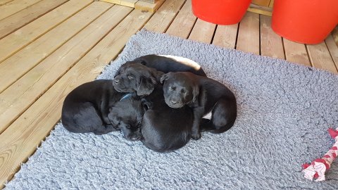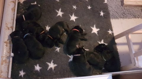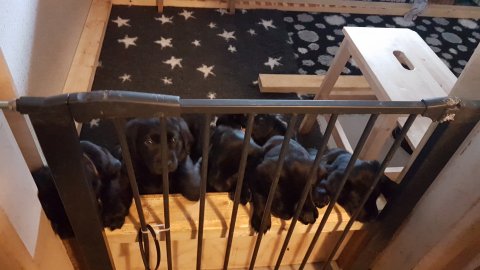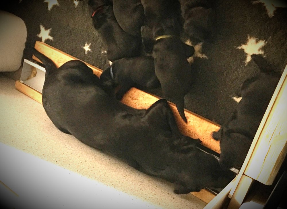 Det er den sidste uge i hvalpekassen, hvor der har været rigtig gang i rummet der er blevet tumlet, leget m.m. Hvalpene vil rigtig gerne udenfor rummet og prøve nye grænser af. Flokken hygger sig i rummet og meget gerne i en stor klump.