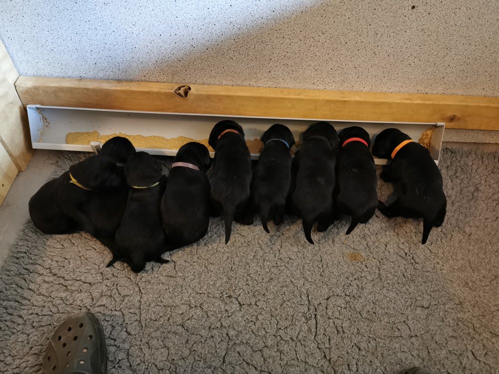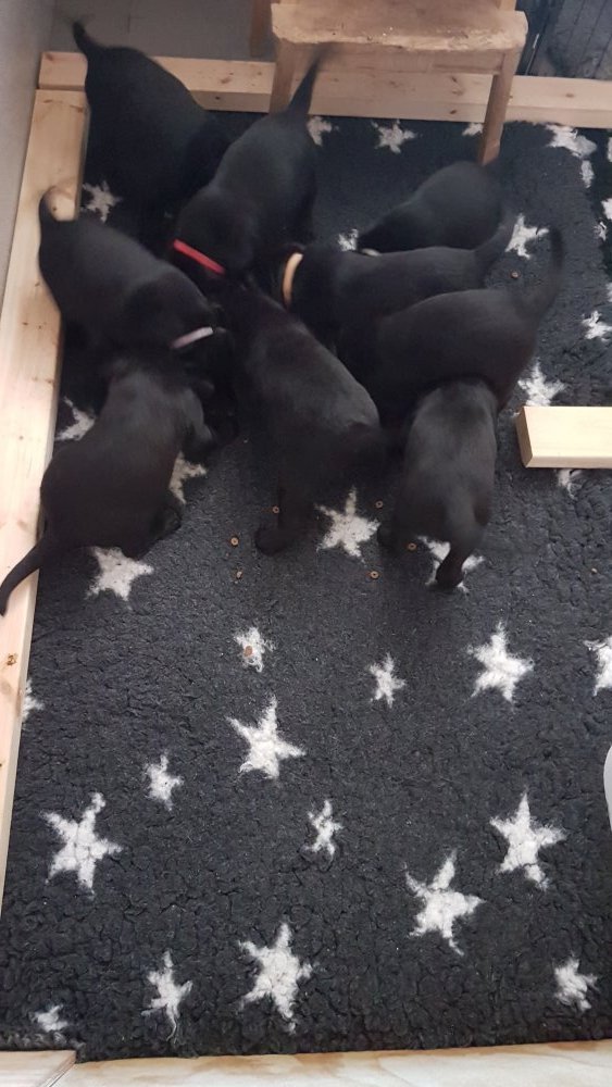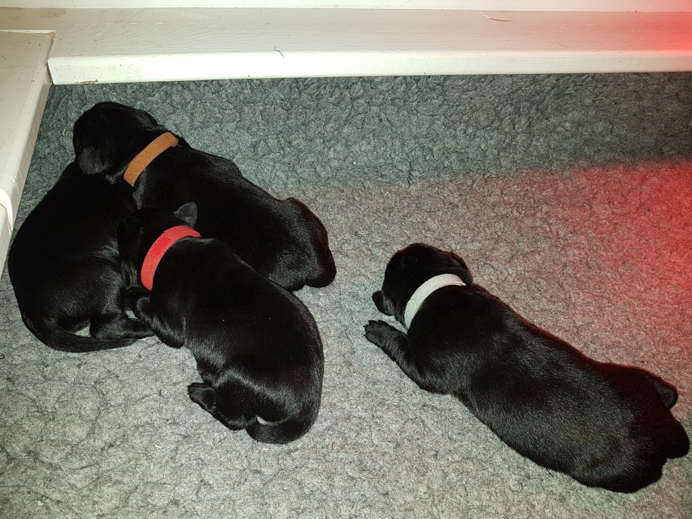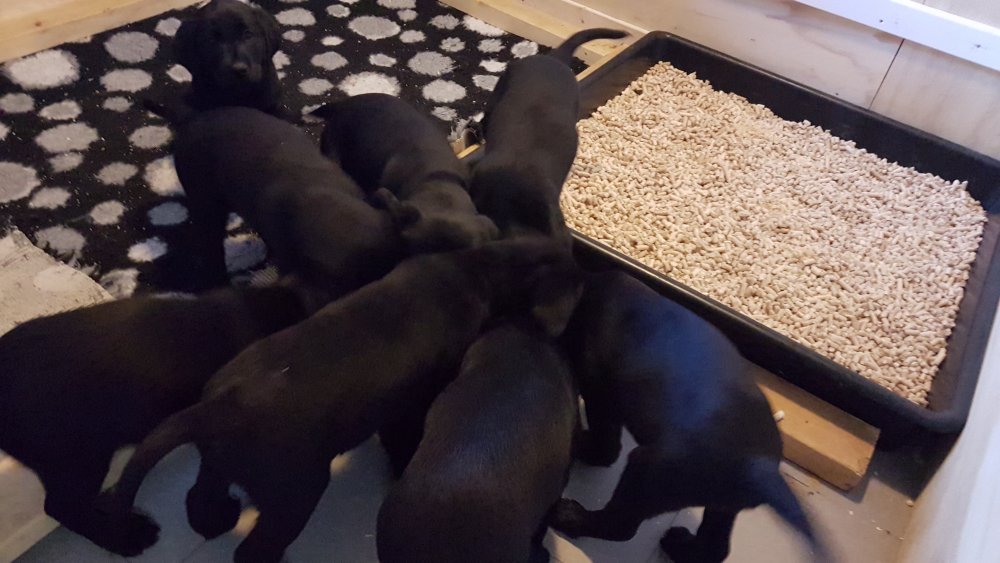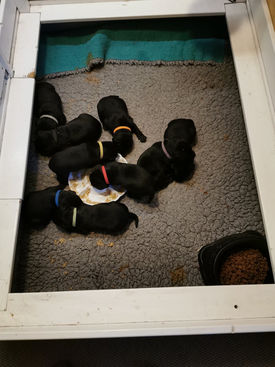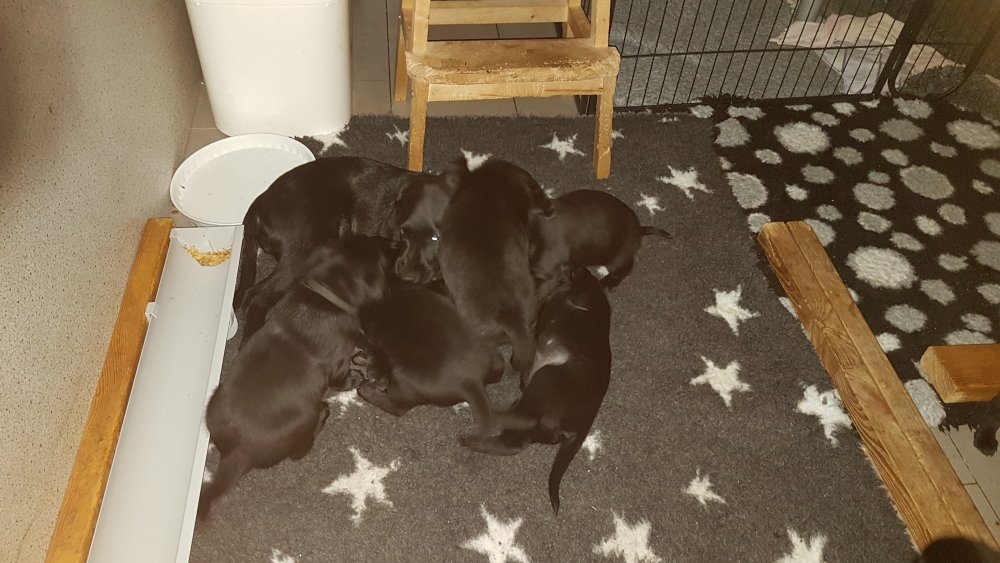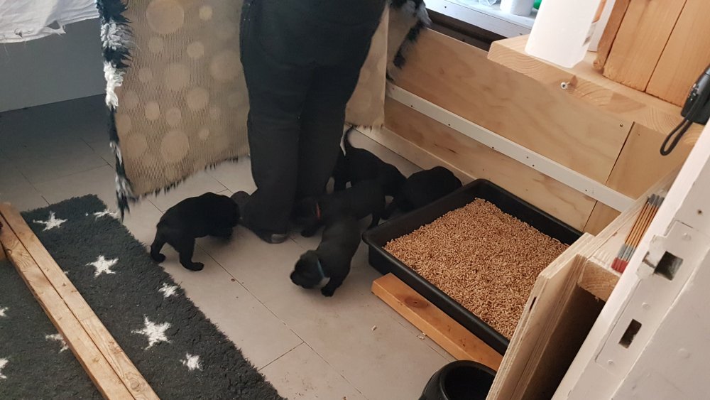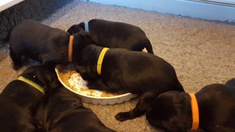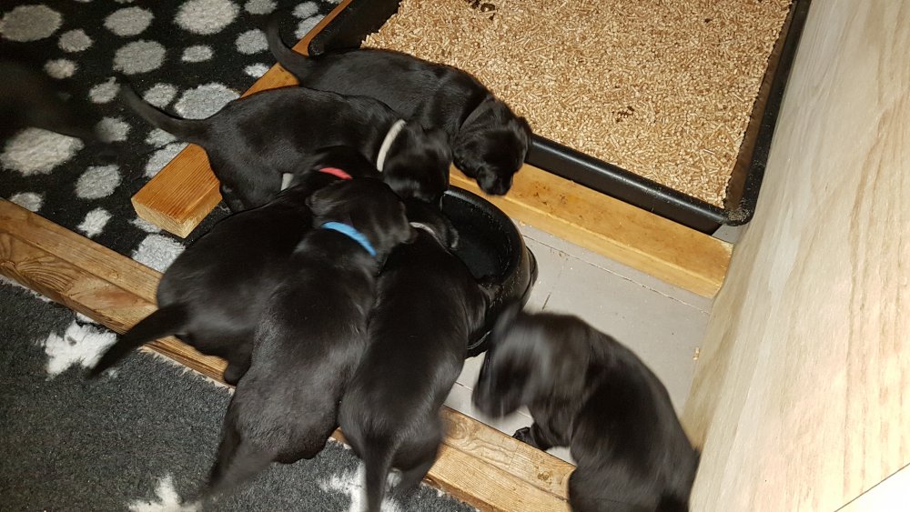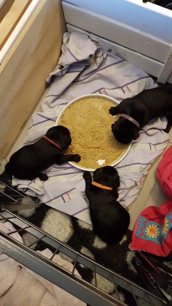 De har alle fået øjne og begyndt at bevæge sig rundt i kassen næsten som rigtig små hunde. De har også opdaget de andre hvalpe i kasse, så de er begyndt at "slåse" med hinanden. Her sidst på ugen er de begyndt at få opblødt hvalpefoder, som de alle spiser.