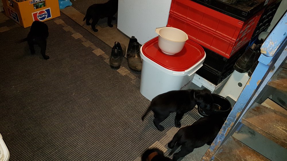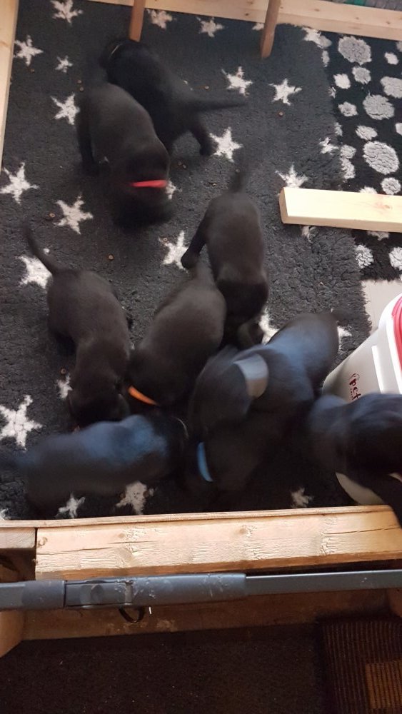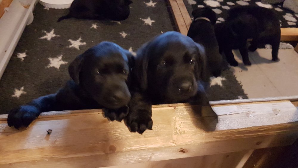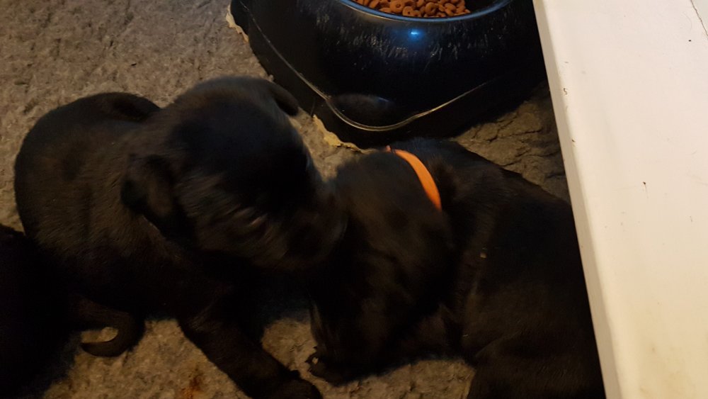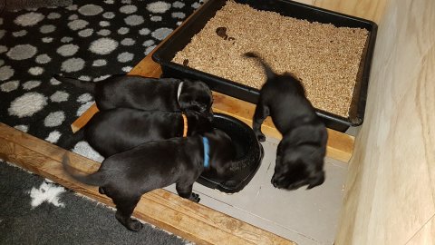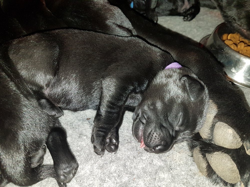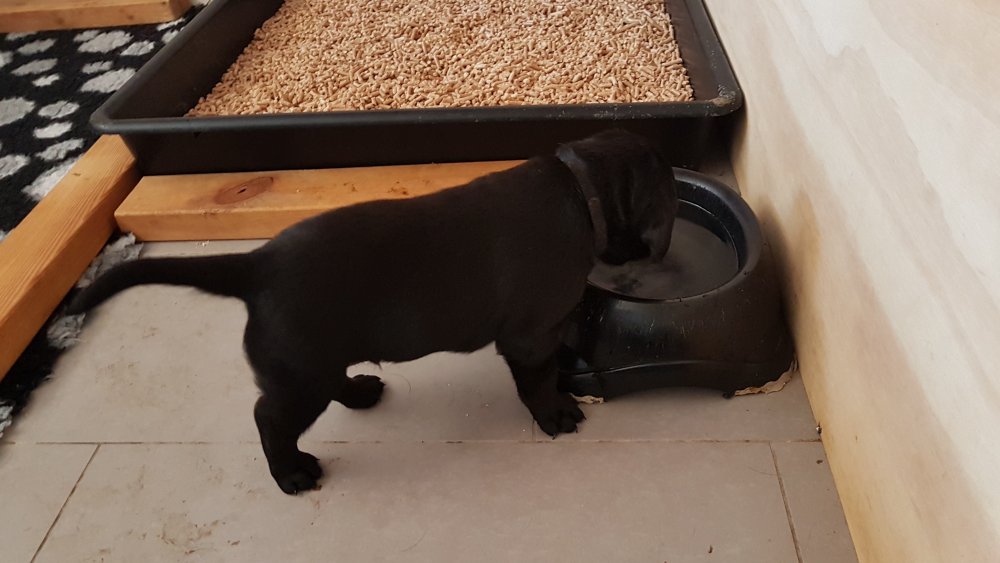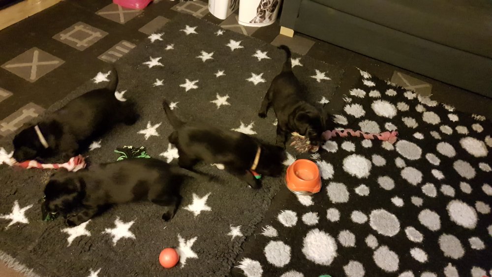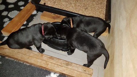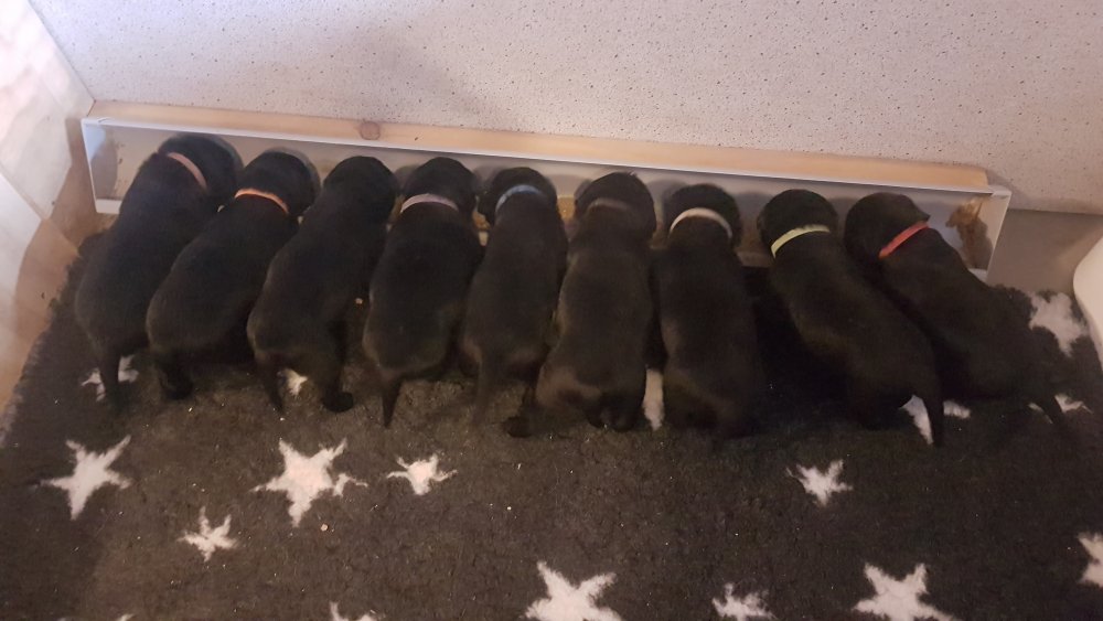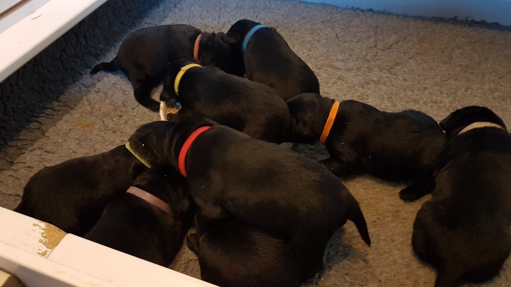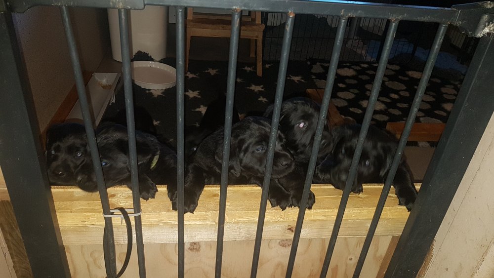 De har alle fået øjne og begyndt at bevæge sig rundt i kassen næsten som rigtig små hunde. De har også opdaget de andre hvalpe i kasse, så de er begyndt at "slåse" med hinanden. Her sidst på ugen er de begyndt at få opblødt hvalpefoder, som de alle spiser.