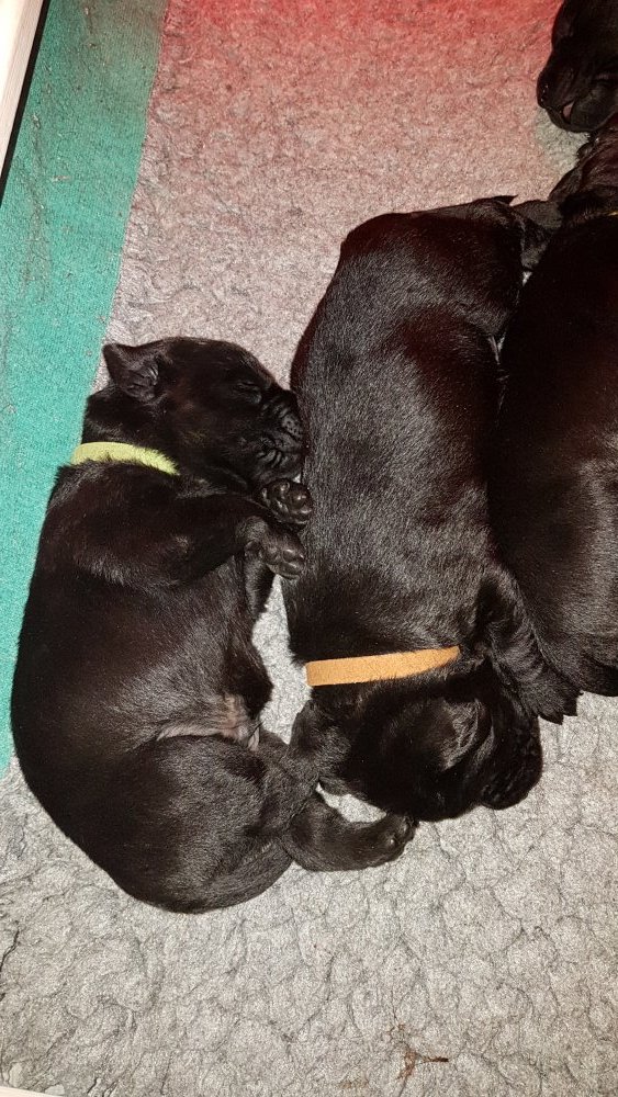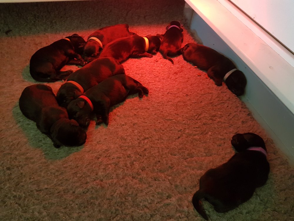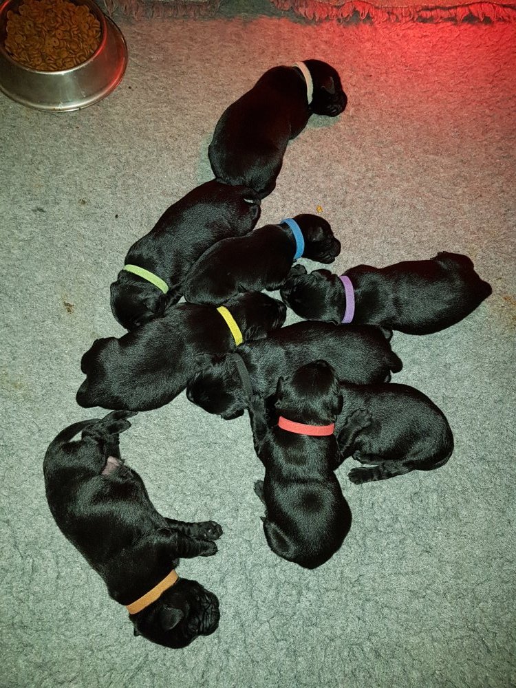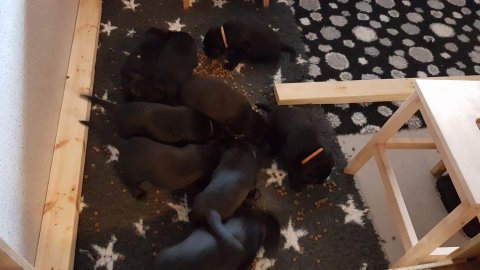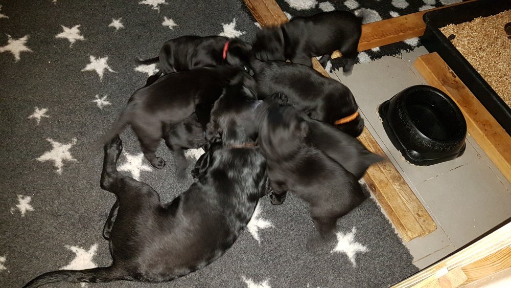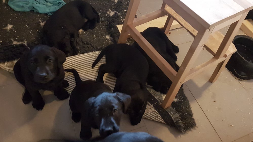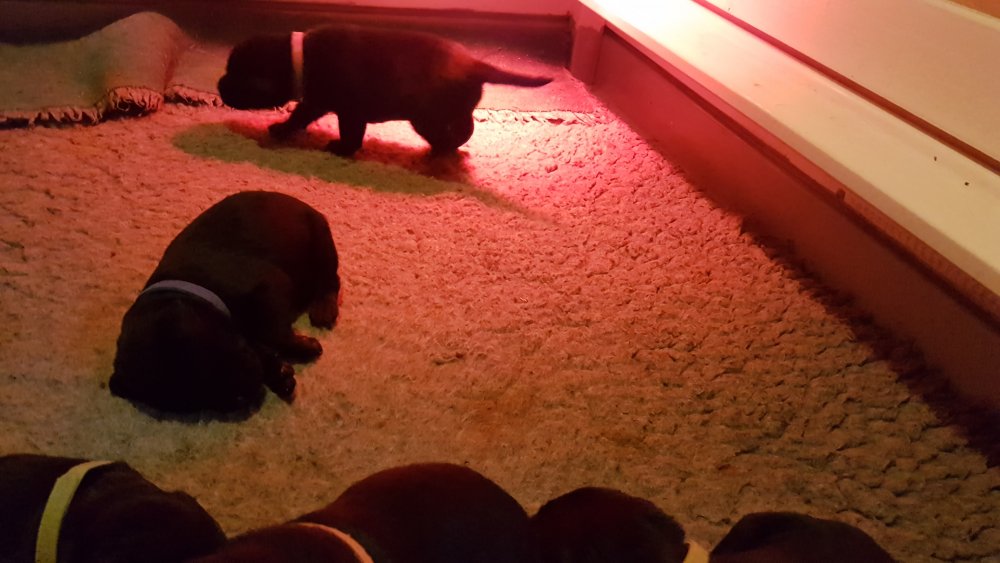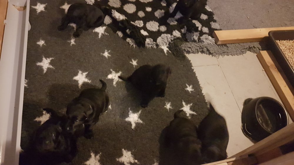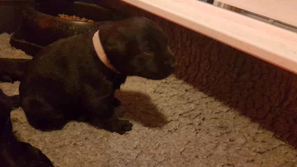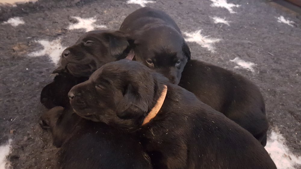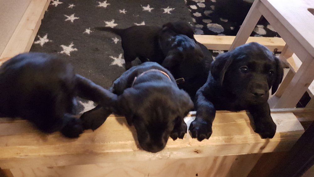 De har alle fået øjne og begyndt at bevæge sig rundt i kassen næsten som rigtig små hunde. De har også opdaget de andre hvalpe i kasse, så de er begyndt at "slåse" med hinanden. Her sidst på ugen er de begyndt at få opblødt hvalpefoder, som de alle spiser.